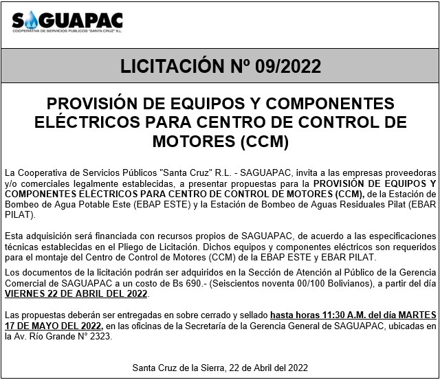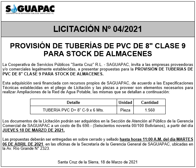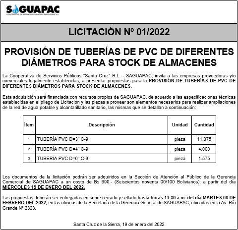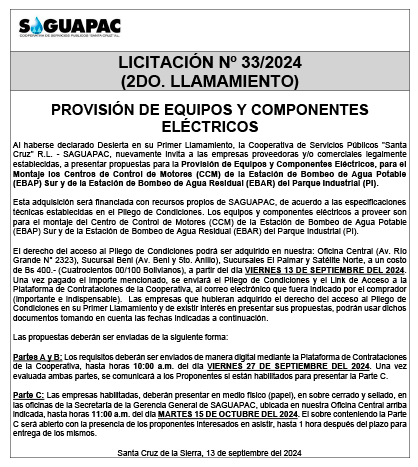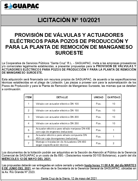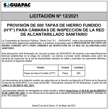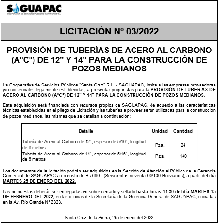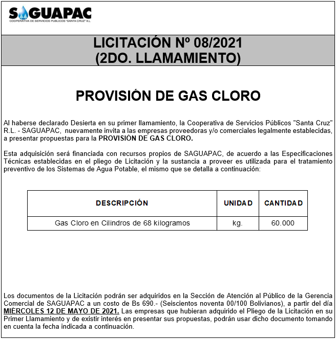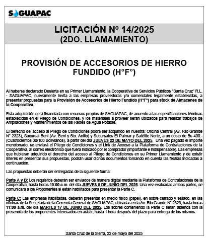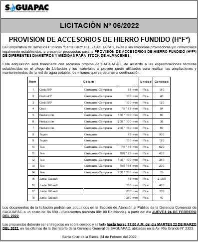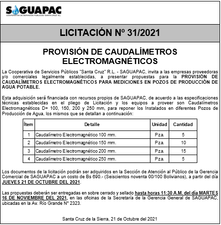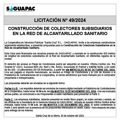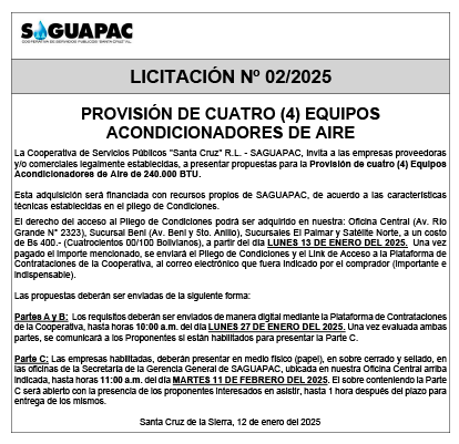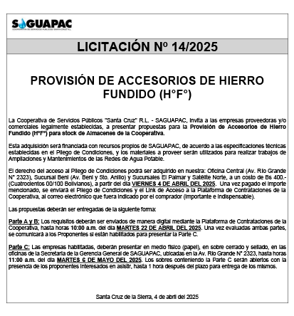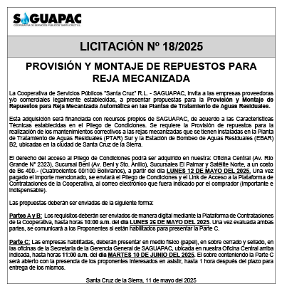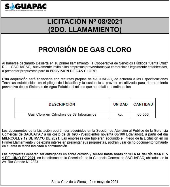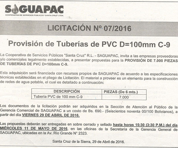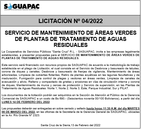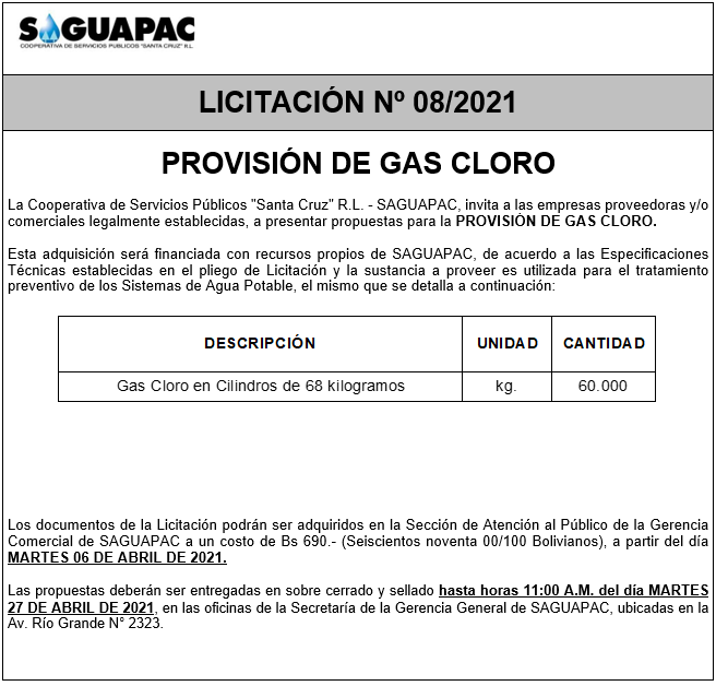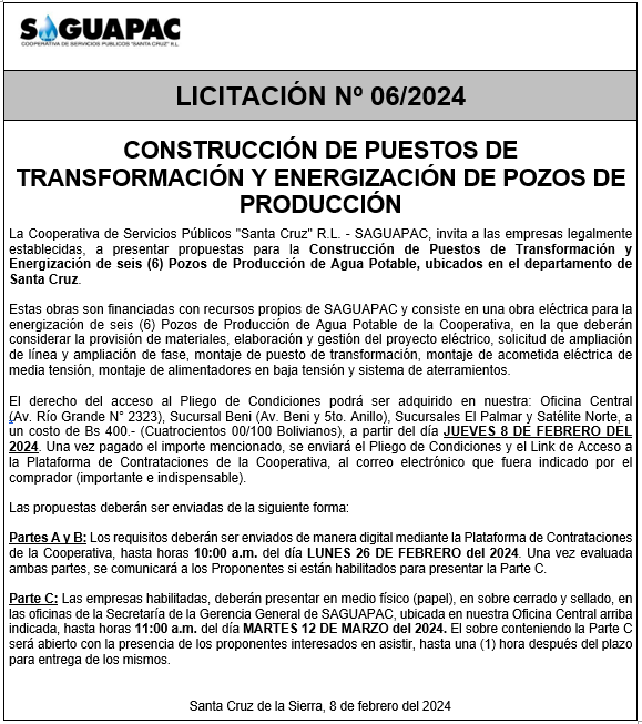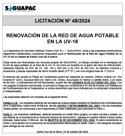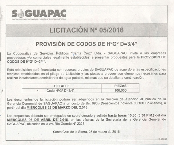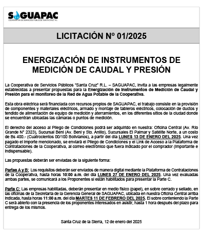 Los procesos de Contratación no son la excepción, ya que se encuentran debidamente normados bajo un Reglamento de Contratación de Obras, Bienes y Servicios, que contempla la modalidad y la normativa de las Licitaciones Públicas, que es un proceso de participación abierto para todo público así como también los Actos de Apertura de Propuestas que se realizan en presencia de los proponentes y representantes de las Cámaras de Industria y Comercio (CAINCO) en casos de bienes o servicios y de la Cámara de la Construcción de Santa Cruz en casos de obras.