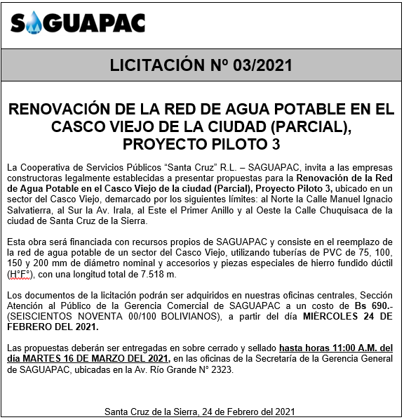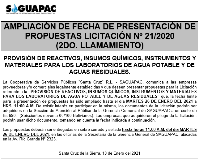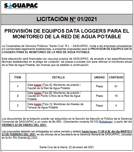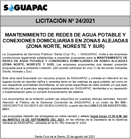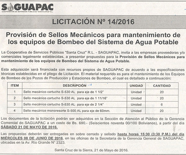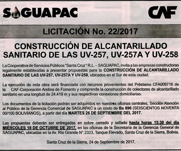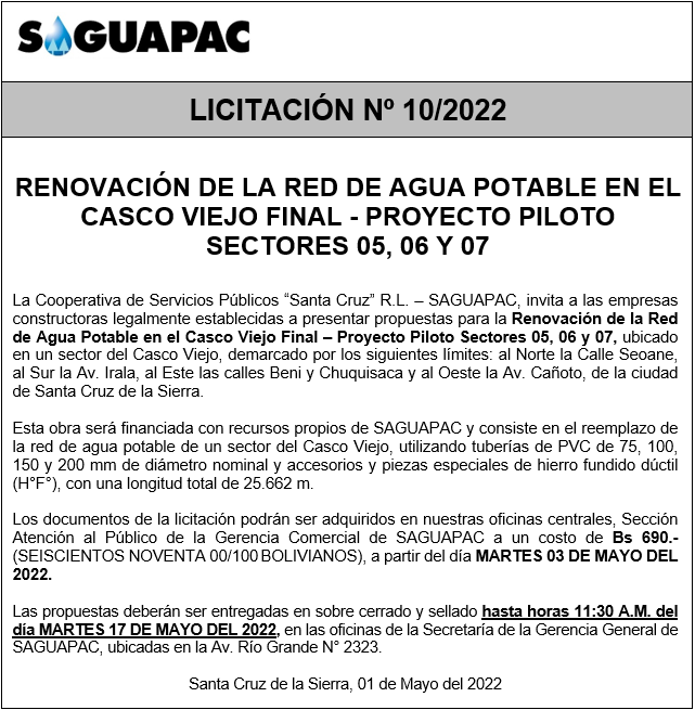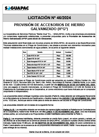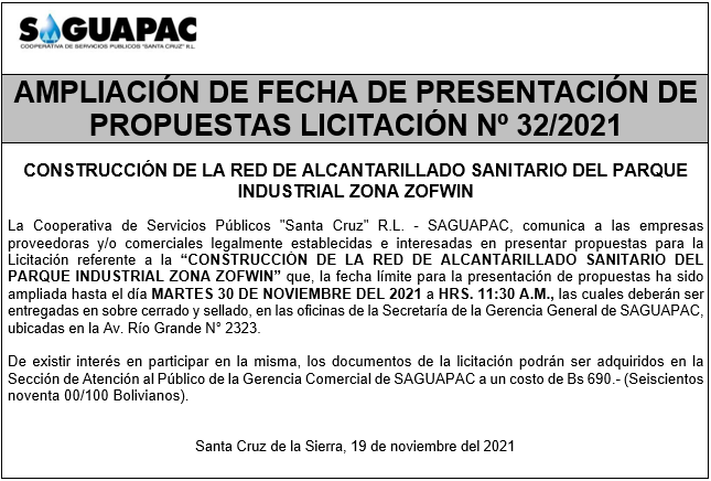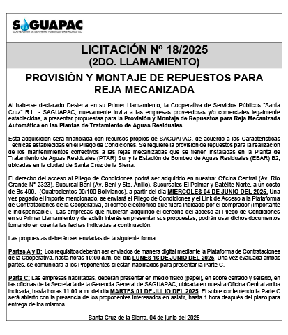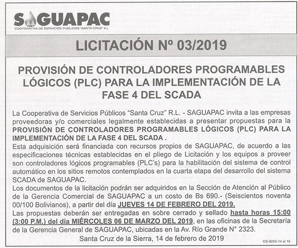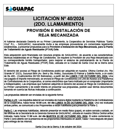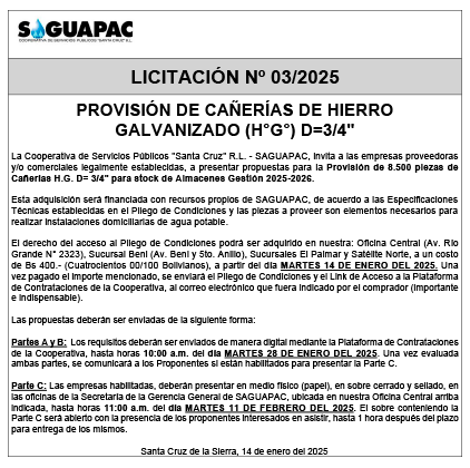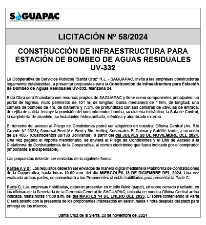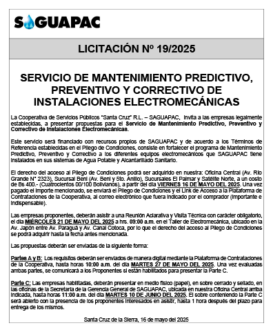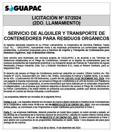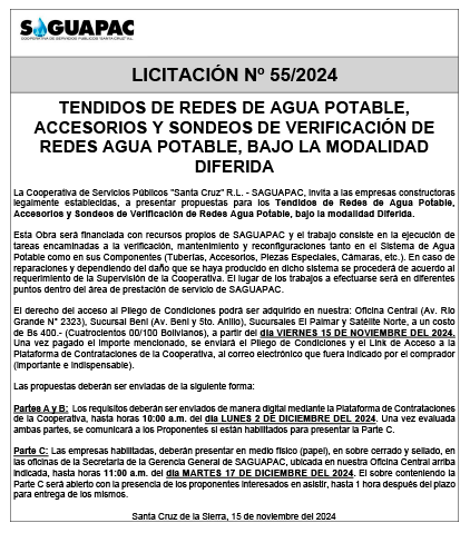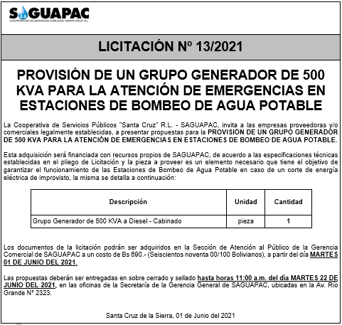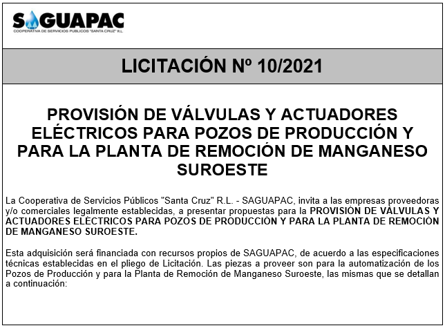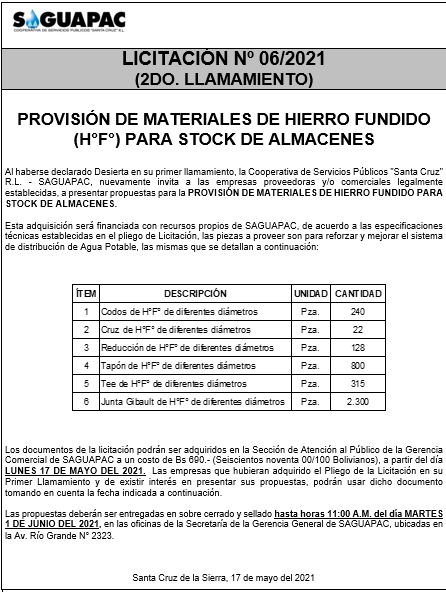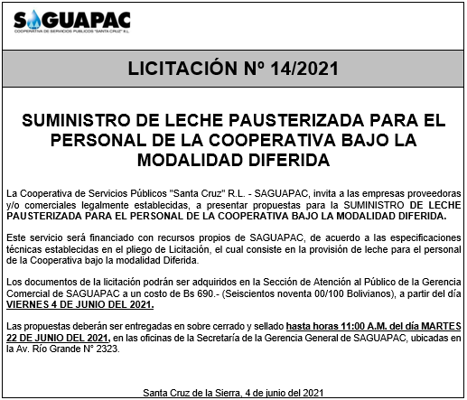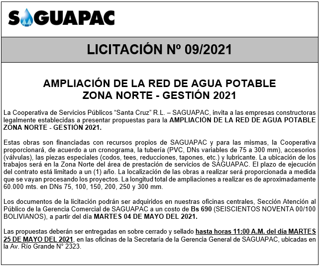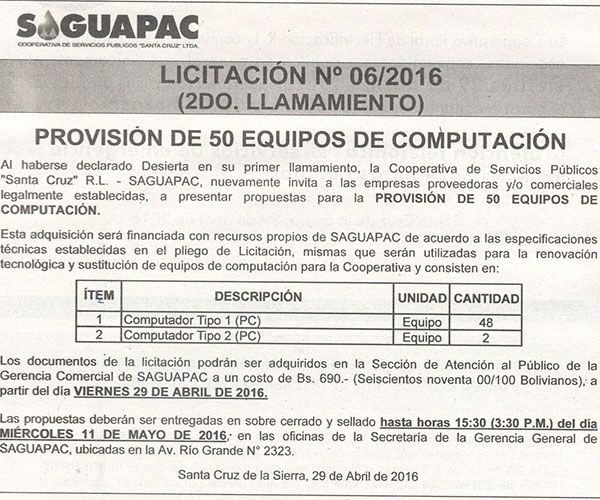 Los procesos de Contratación no son la excepción, ya que se encuentran debidamente normados bajo un Reglamento de Contratación de Obras, Bienes y Servicios, que contempla la modalidad y la normativa de las Licitaciones Públicas, que es un proceso de participación abierto para todo público así como también los Actos de Apertura de Propuestas que se realizan en presencia de los proponentes y representantes de las Cámaras de Industria y Comercio (CAINCO) en casos de bienes o servicios y de la Cámara de la Construcción de Santa Cruz en casos de obras.
