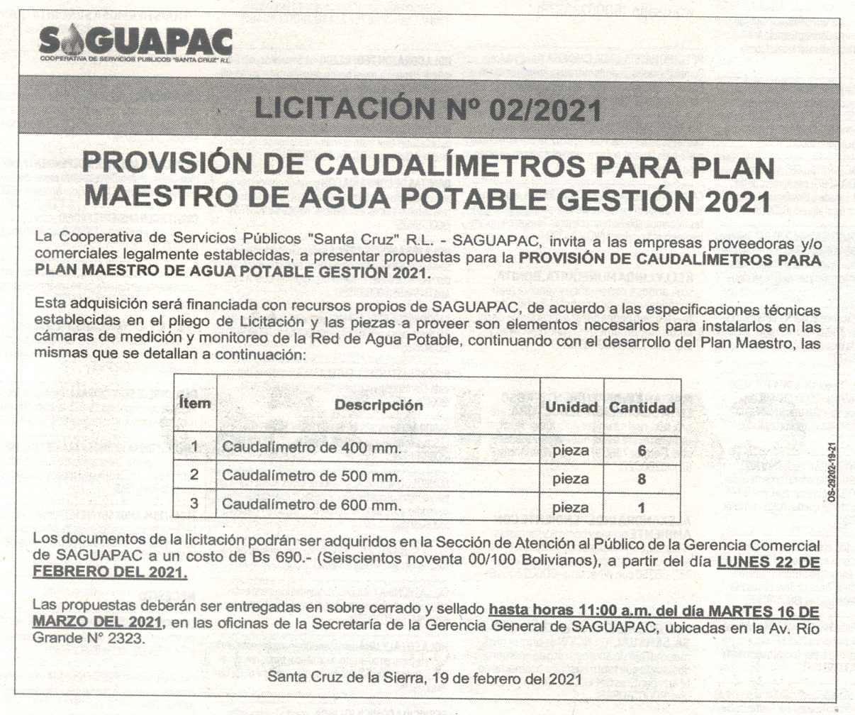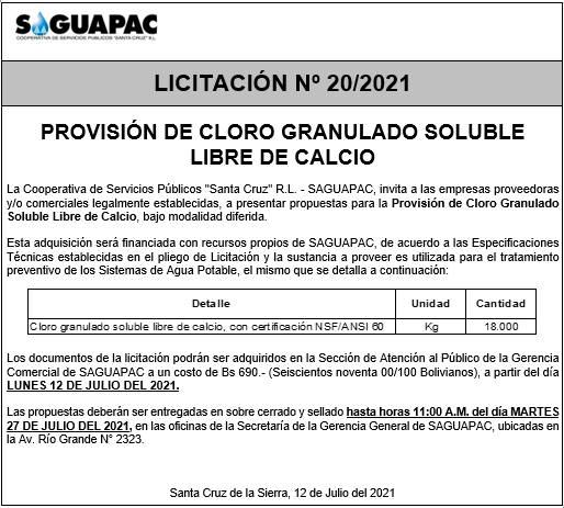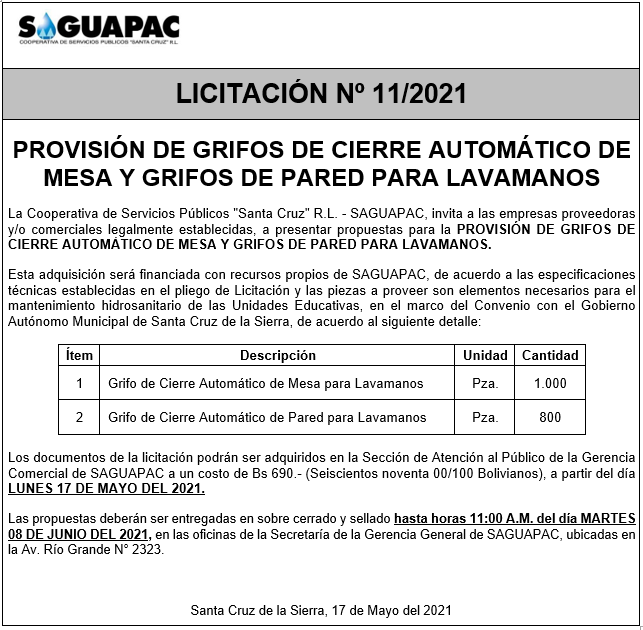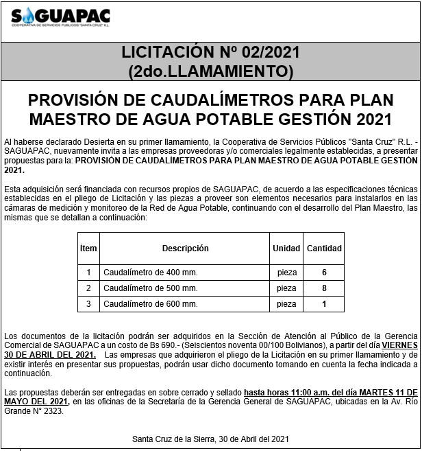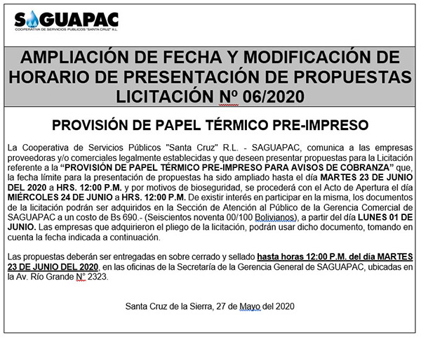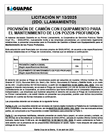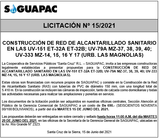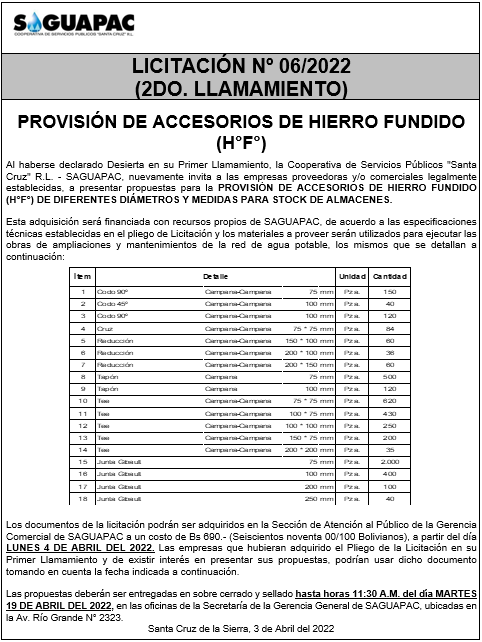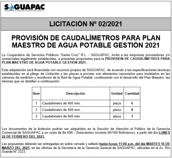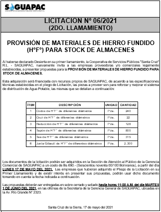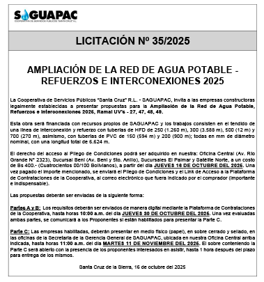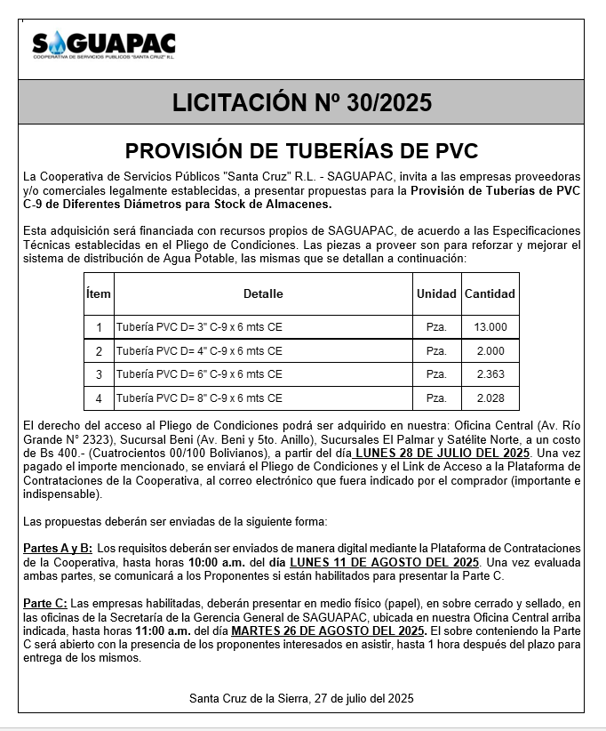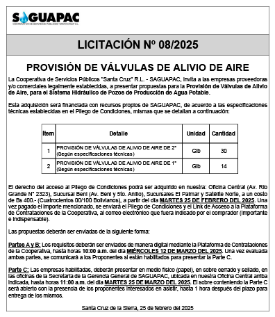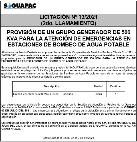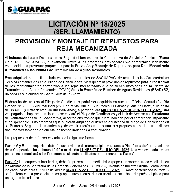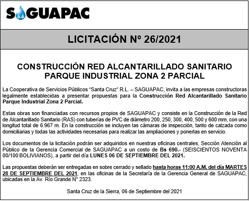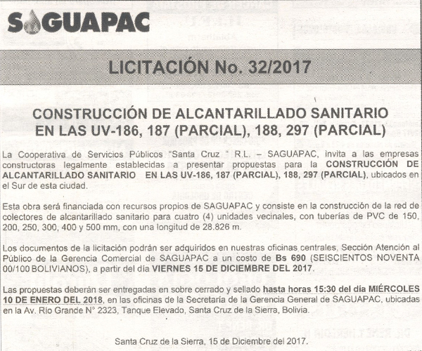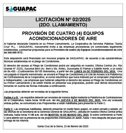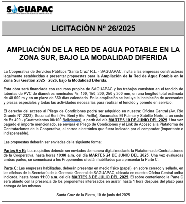 Los procesos de Contratación no son la excepción, ya que se encuentran debidamente normados bajo un Reglamento de Contratación de Obras, Bienes y Servicios, que contempla la modalidad y la normativa de las Licitaciones Públicas, que es un proceso de participación abierto para todo público así como también los Actos de Apertura de Propuestas que se realizan en presencia de los proponentes y representantes de las Cámaras de Industria y Comercio (CAINCO) en casos de bienes o servicios y de la Cámara de la Construcción de Santa Cruz en casos de obras.