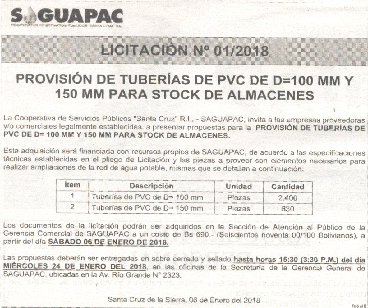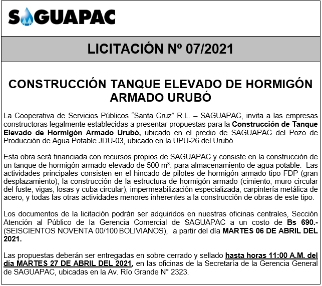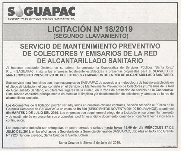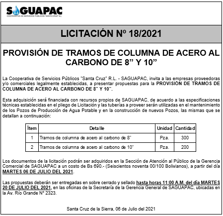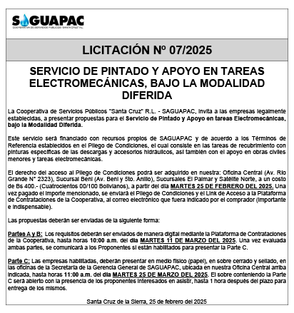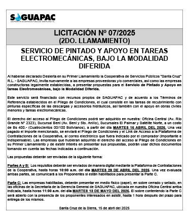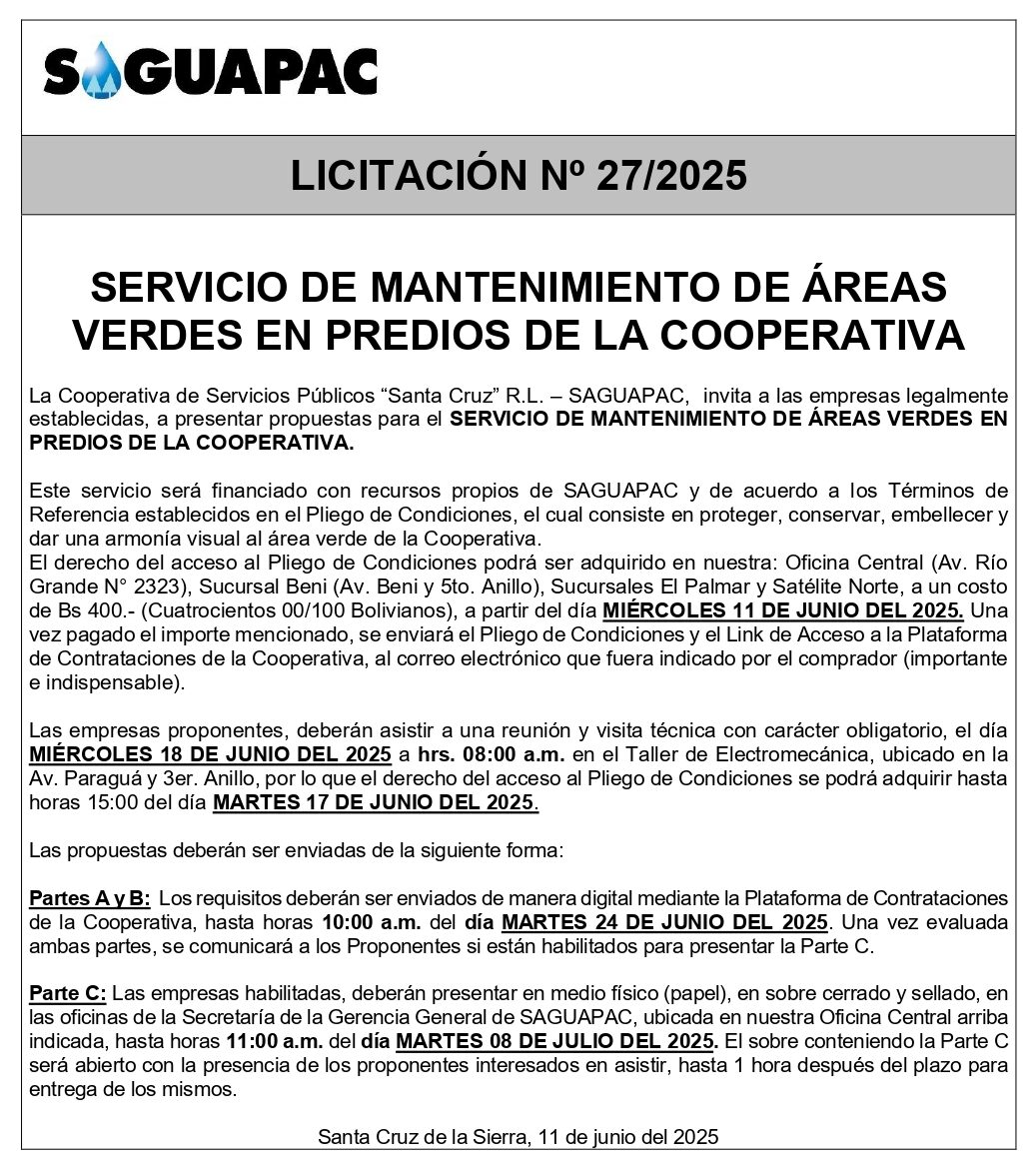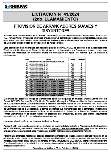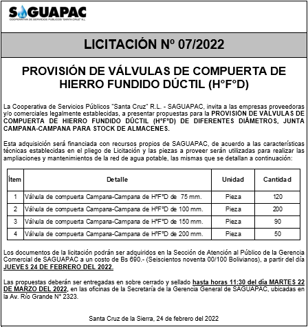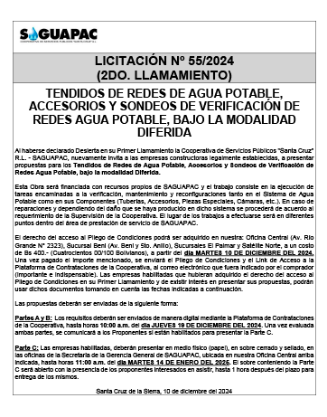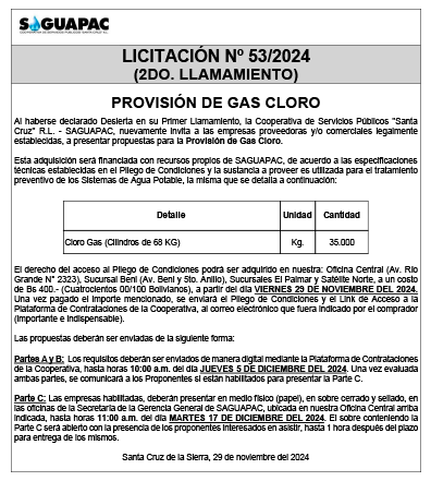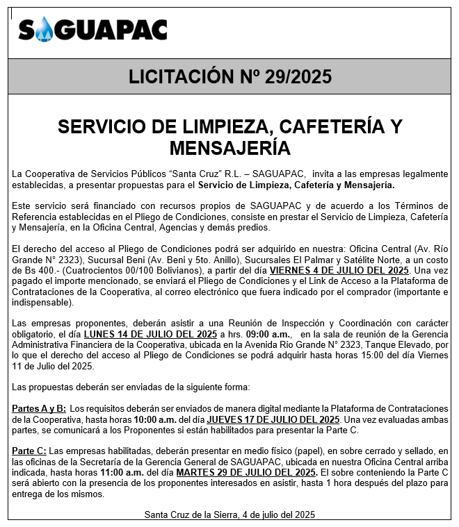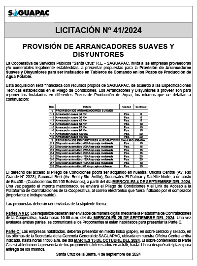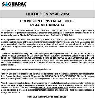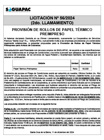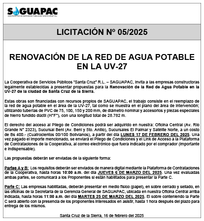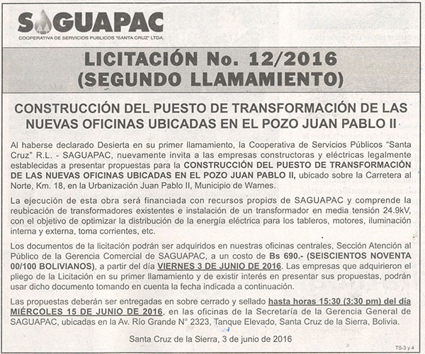 Los procesos de Contratación no son la excepción, ya que se encuentran debidamente normados bajo un Reglamento de Contratación de Obras, Bienes y Servicios, que contempla la modalidad y la normativa de las Licitaciones Públicas, que es un proceso de participación abierto para todo público así como también los Actos de Apertura de Propuestas que se realizan en presencia de los proponentes y representantes de las Cámaras de Industria y Comercio (CAINCO) en casos de bienes o servicios y de la Cámara de la Construcción de Santa Cruz en casos de obras.