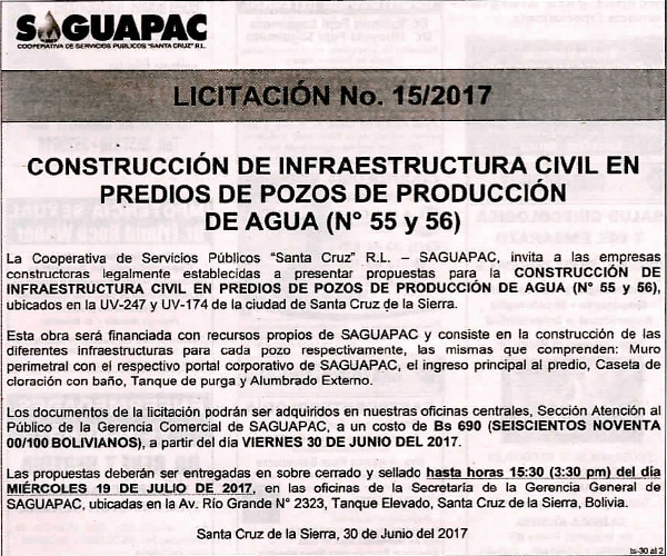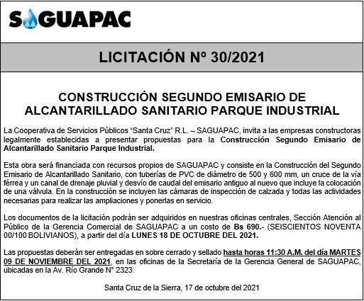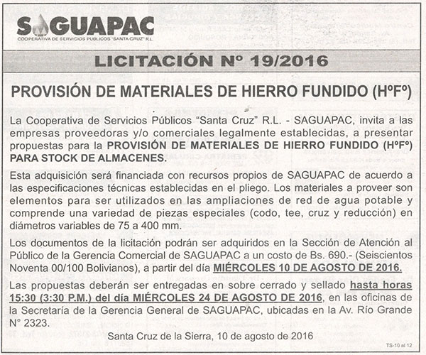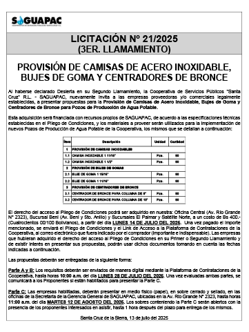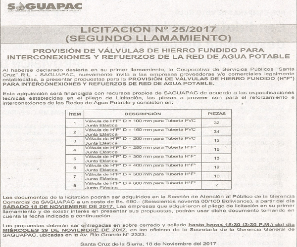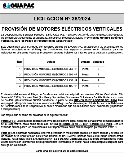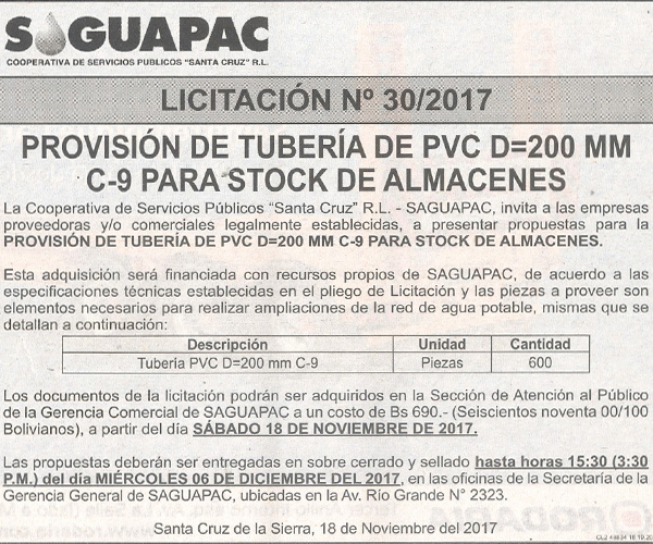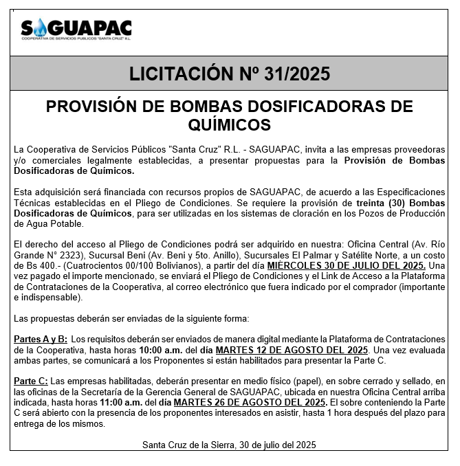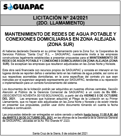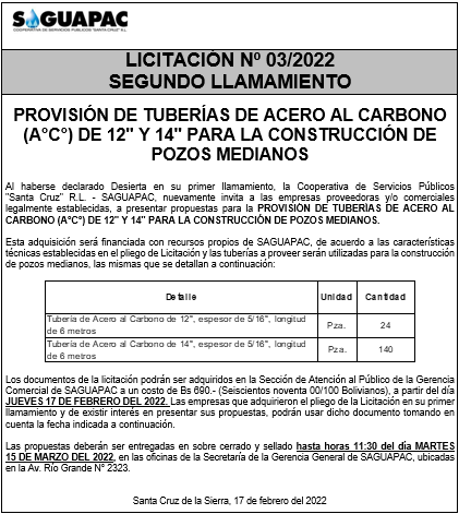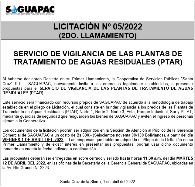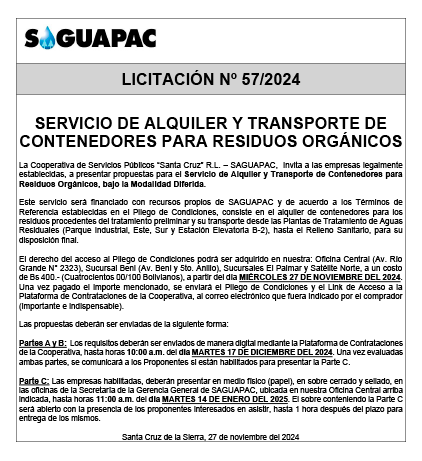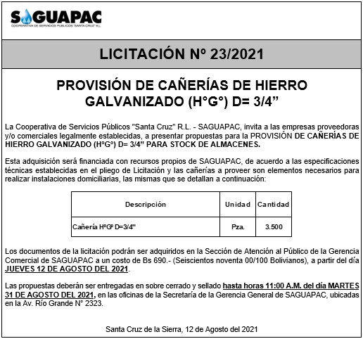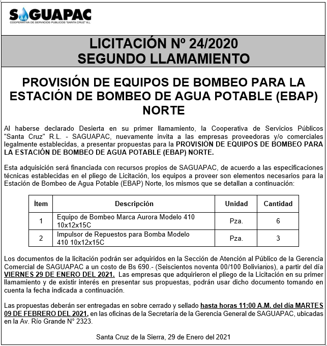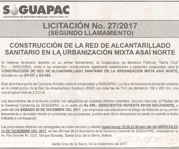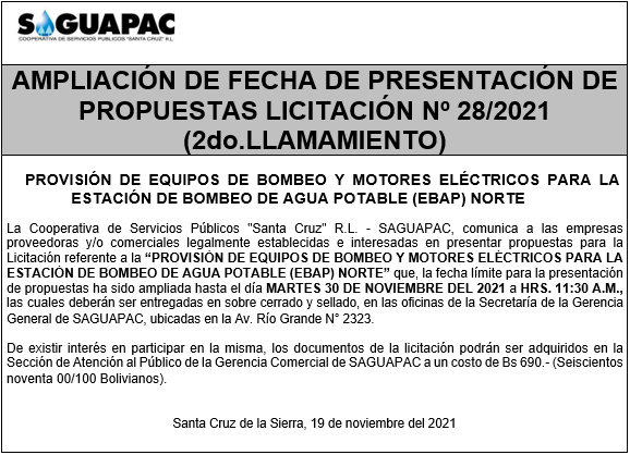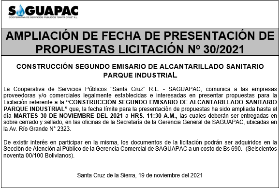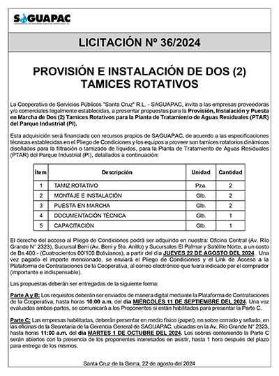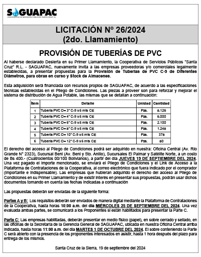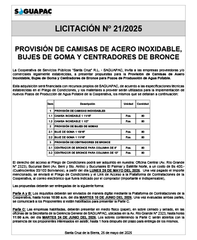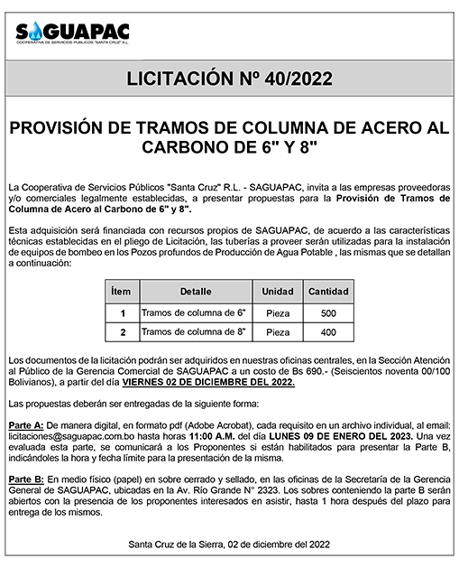 Los procesos de Contratación no son la excepción, ya que se encuentran debidamente normados bajo un Reglamento de Contratación de Obras, Bienes y Servicios, que contempla la modalidad y la normativa de las Licitaciones Públicas, que es un proceso de participación abierto para todo público así como también los Actos de Apertura de Propuestas que se realizan en presencia de los proponentes y representantes de las Cámaras de Industria y Comercio (CAINCO) en casos de bienes o servicios y de la Cámara de la Construcción de Santa Cruz en casos de obras.
