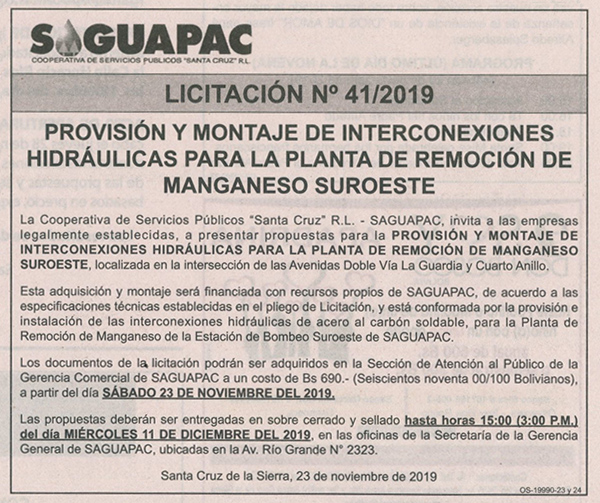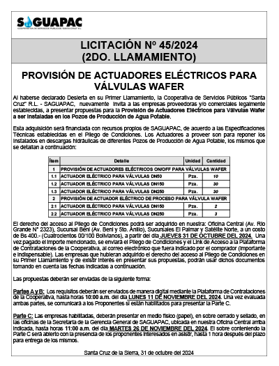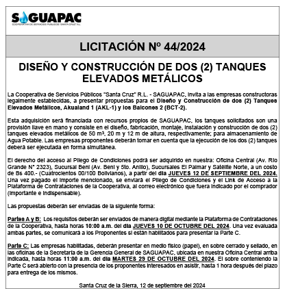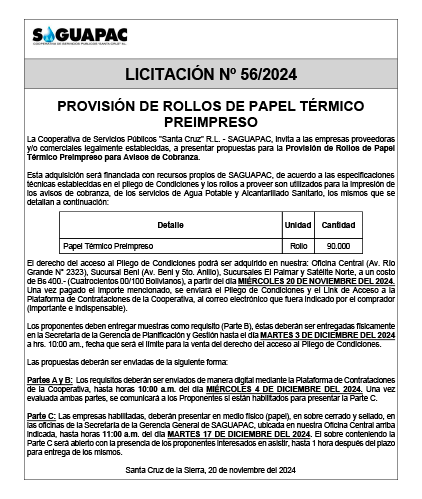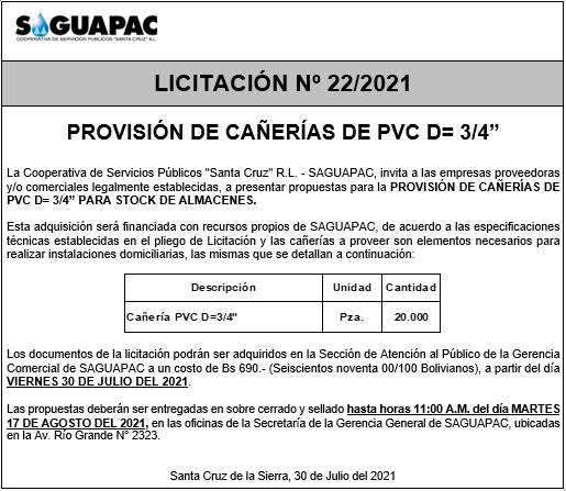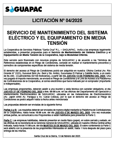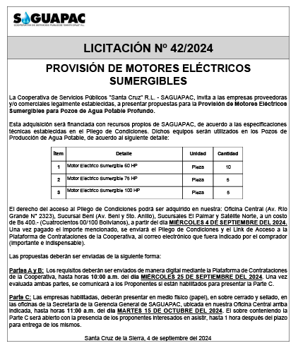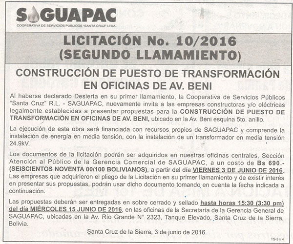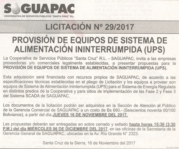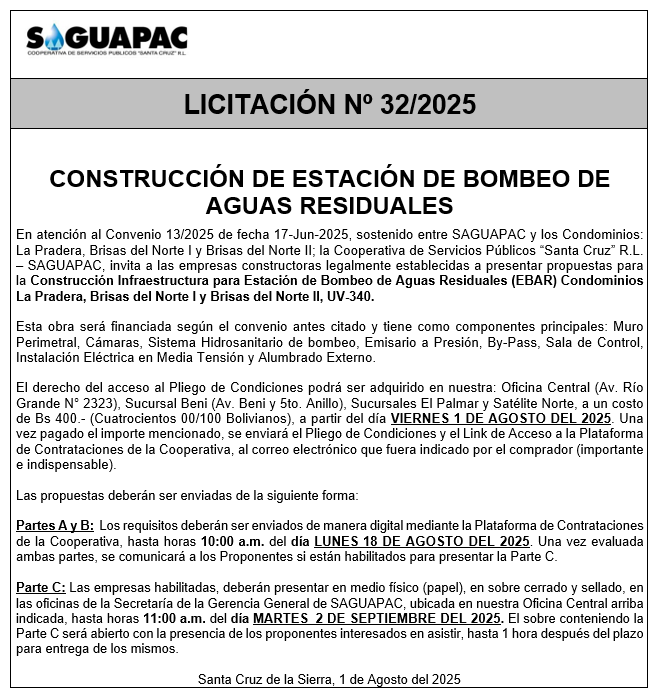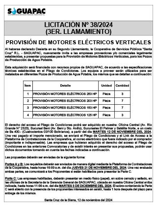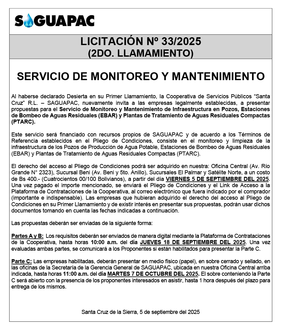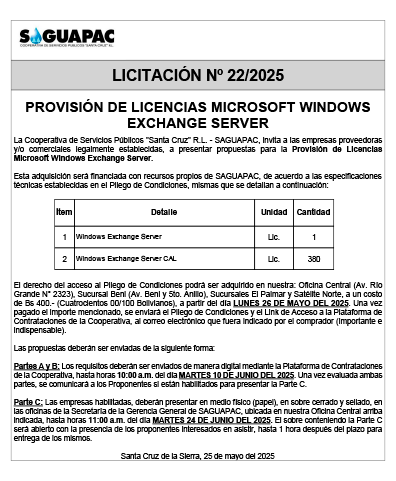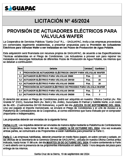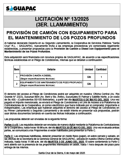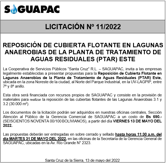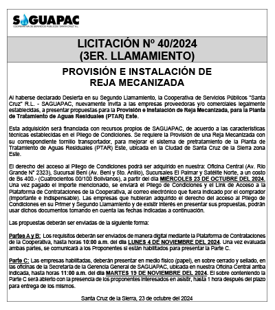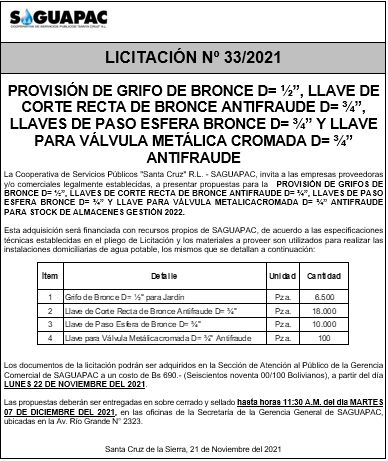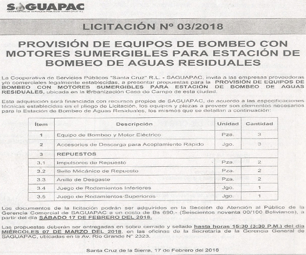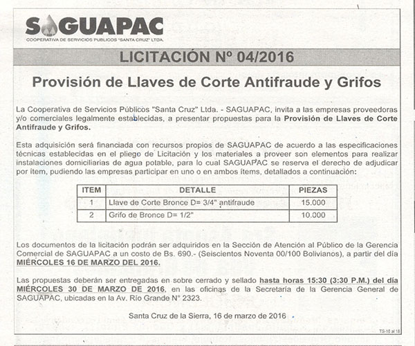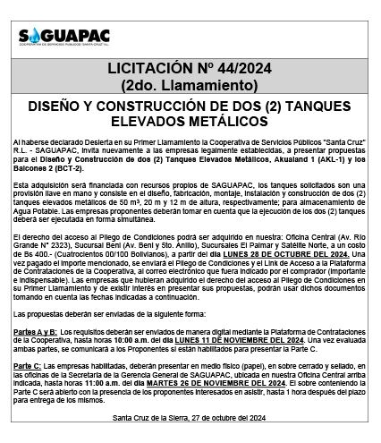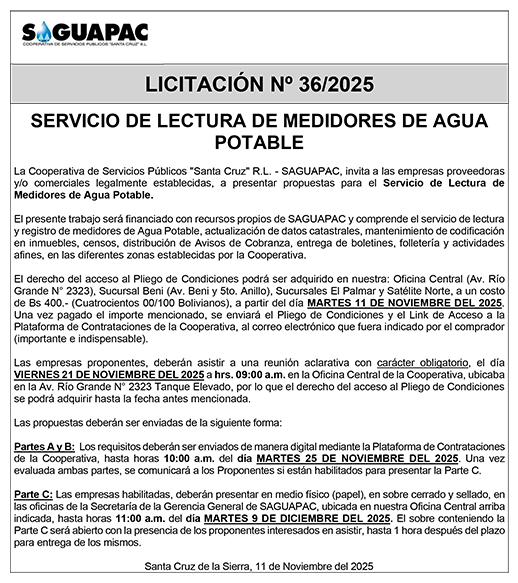 Los procesos de Contratación no son la excepción, ya que se encuentran debidamente normados bajo un Reglamento de Contratación de Obras, Bienes y Servicios, que contempla la modalidad y la normativa de las Licitaciones Públicas, que es un proceso de participación abierto para todo público así como también los Actos de Apertura de Propuestas que se realizan en presencia de los proponentes y representantes de las Cámaras de Industria y Comercio (CAINCO) en casos de bienes o servicios y de la Cámara de la Construcción de Santa Cruz en casos de obras.