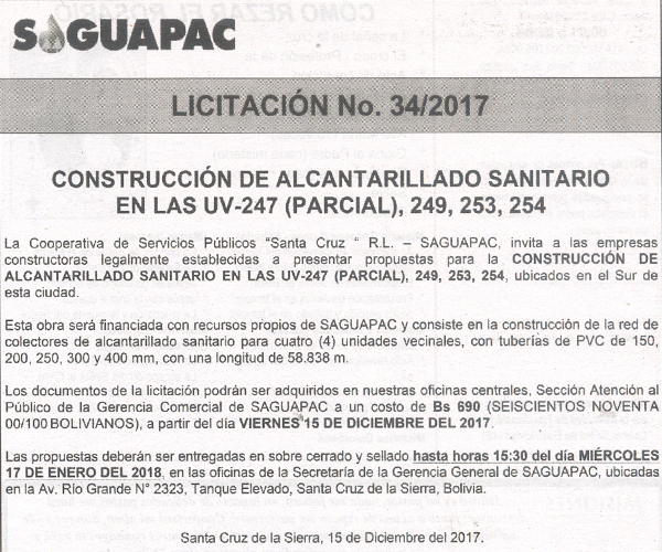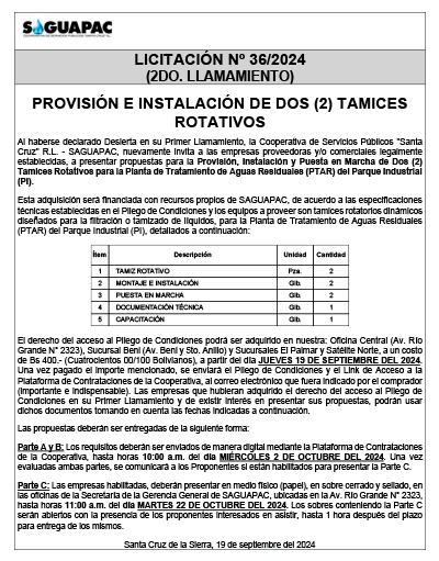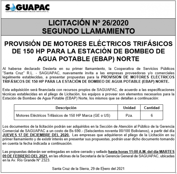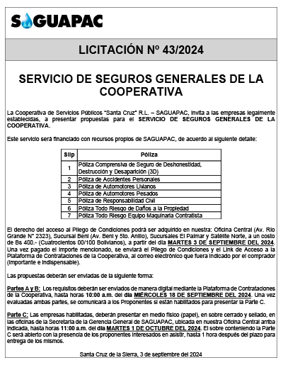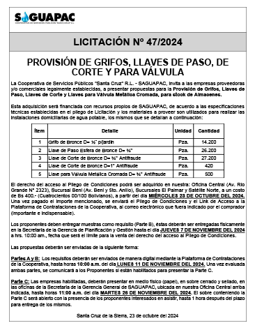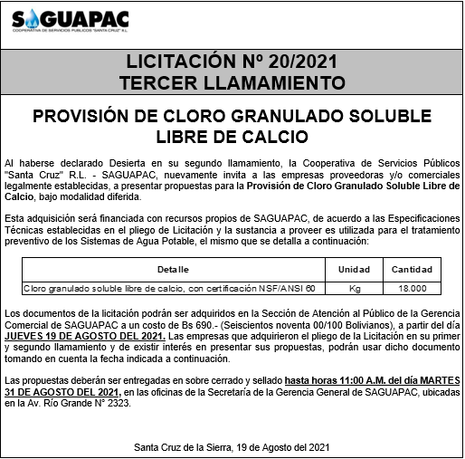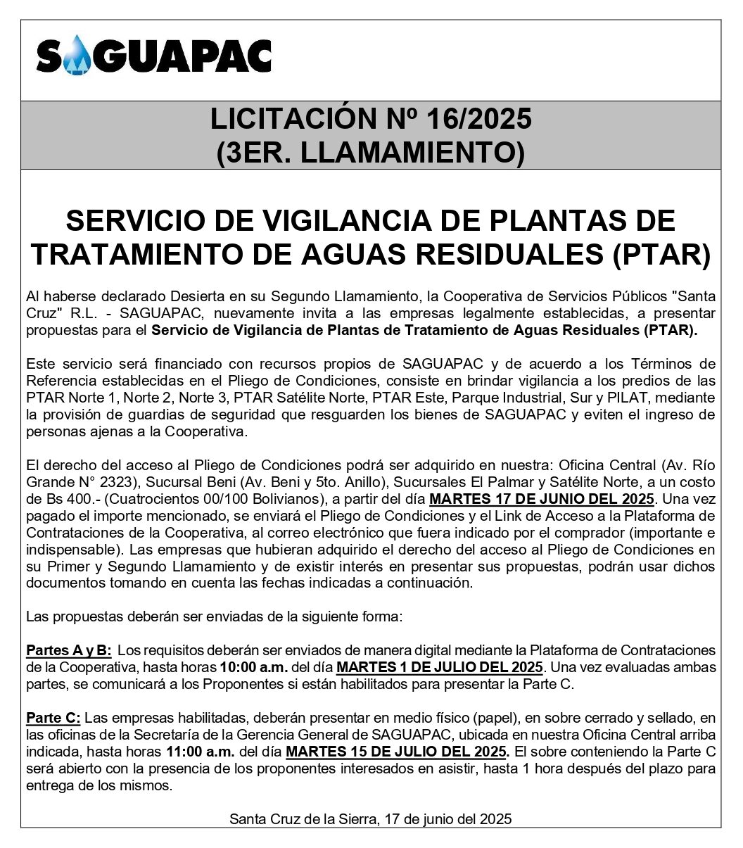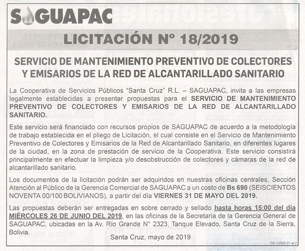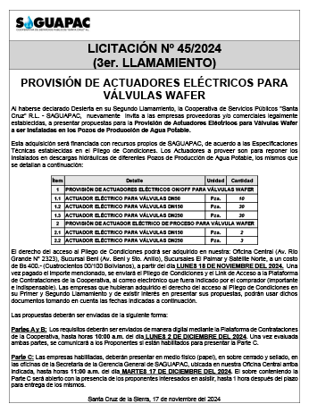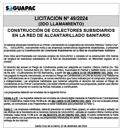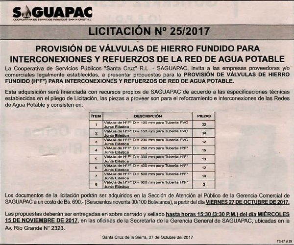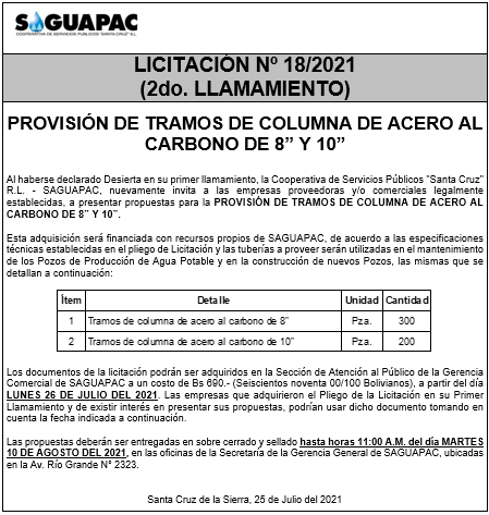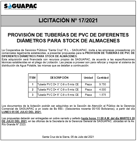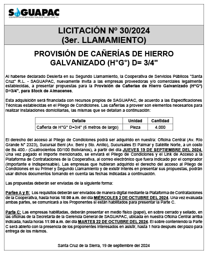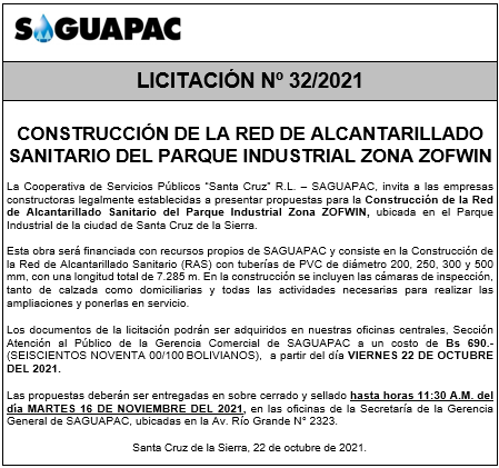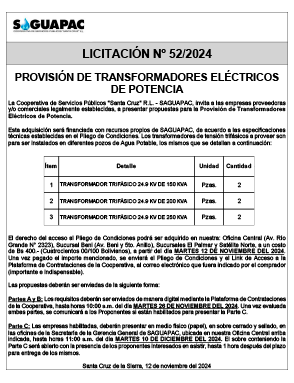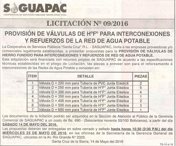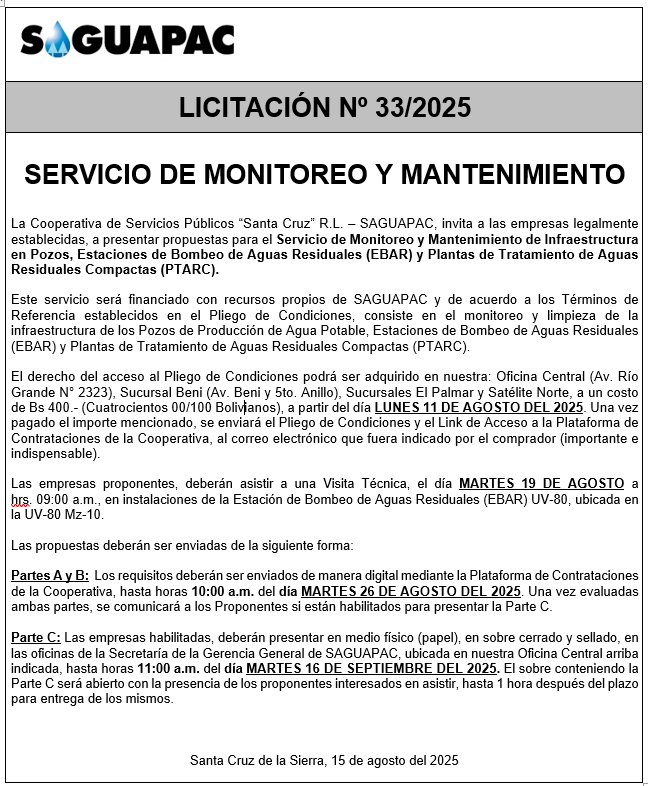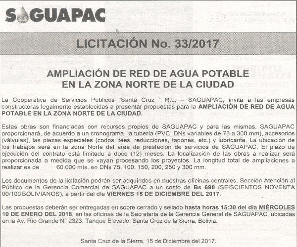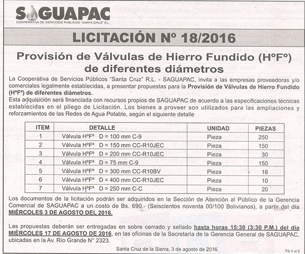 Los procesos de Contratación no son la excepción, ya que se encuentran debidamente normados bajo un Reglamento de Contratación de Obras, Bienes y Servicios, que contempla la modalidad y la normativa de las Licitaciones Públicas, que es un proceso de participación abierto para todo público así como también los Actos de Apertura de Propuestas que se realizan en presencia de los proponentes y representantes de las Cámaras de Industria y Comercio (CAINCO) en casos de bienes o servicios y de la Cámara de la Construcción de Santa Cruz en casos de obras.
