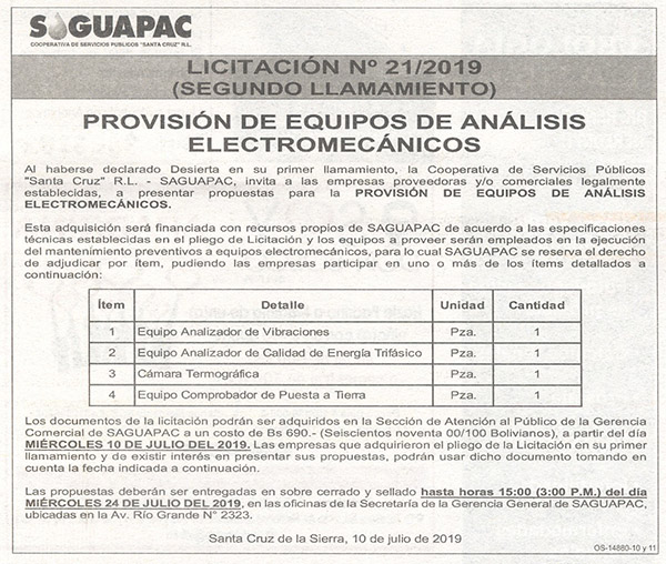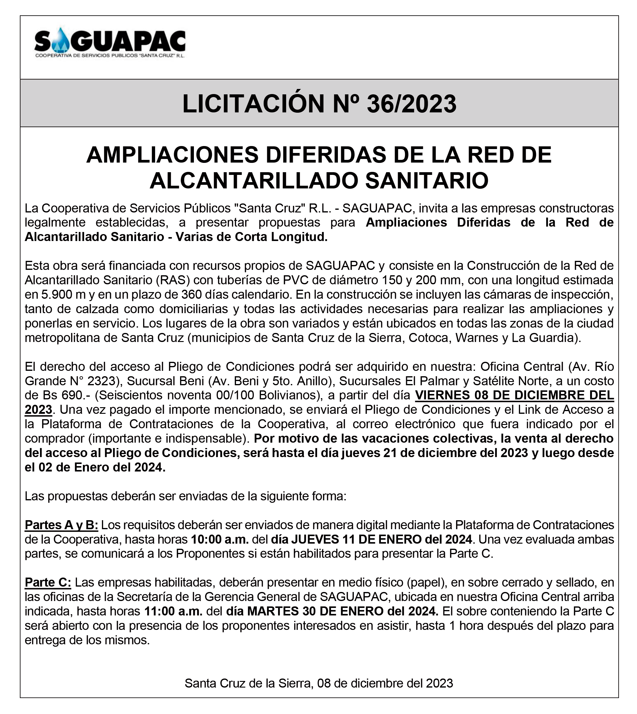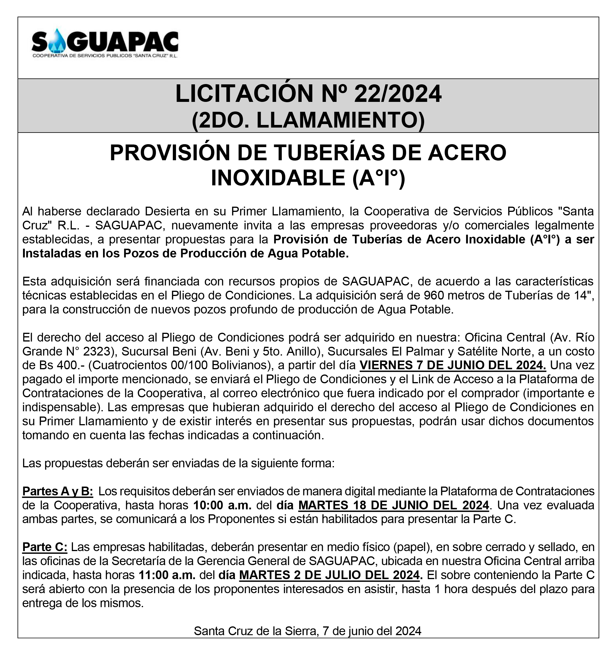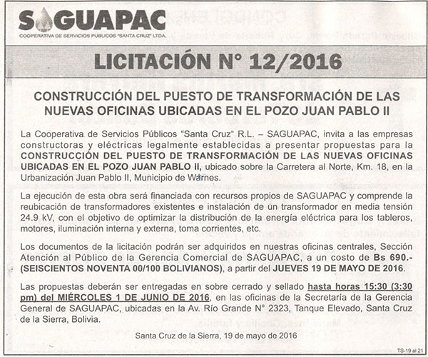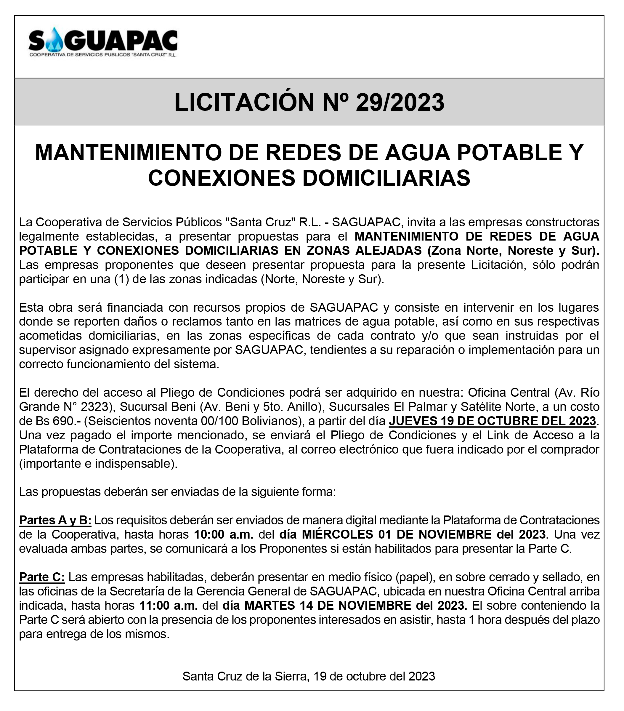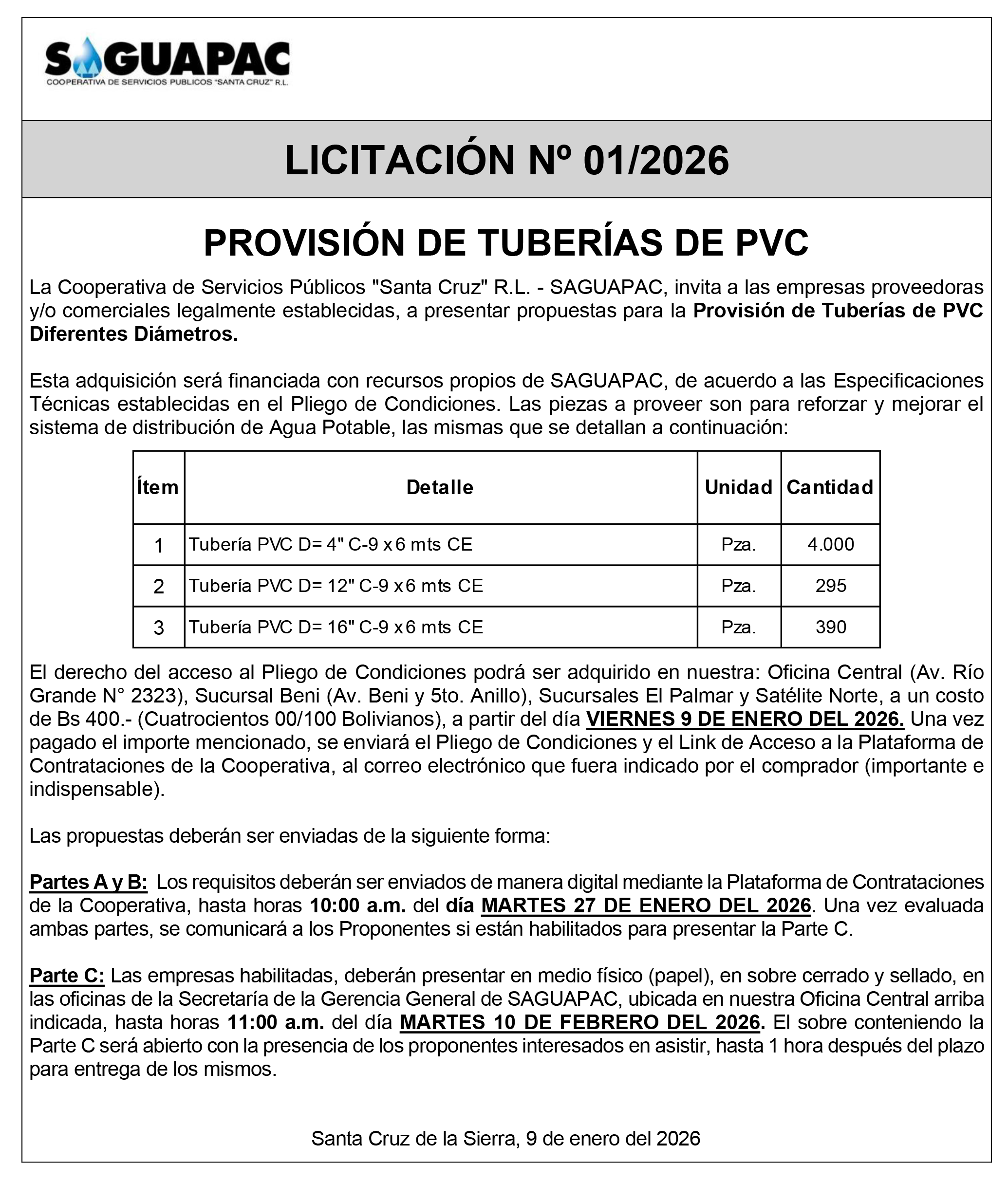 Los procesos de Contratación no son la excepción, ya que se encuentran debidamente normados bajo un Reglamento de Contratación de Obras, Bienes y Servicios, que contempla la modalidad y la normativa de las Licitaciones Públicas, que es un proceso de participación abierto para todo público así como también los Actos de Apertura de Propuestas que se realizan en presencia de los proponentes y representantes de las Cámaras de Industria y Comercio (CAINCO) en casos de bienes o servicios y de la Cámara de la Construcción de Santa Cruz en casos de obras.
