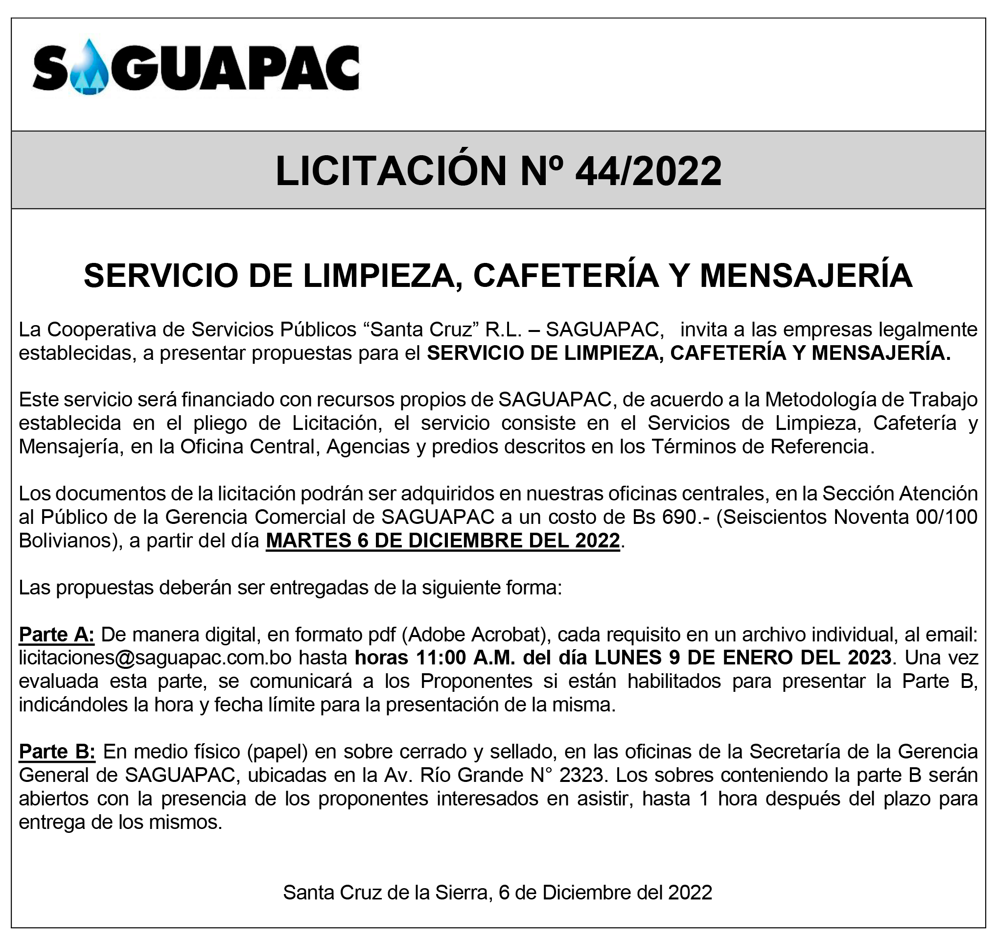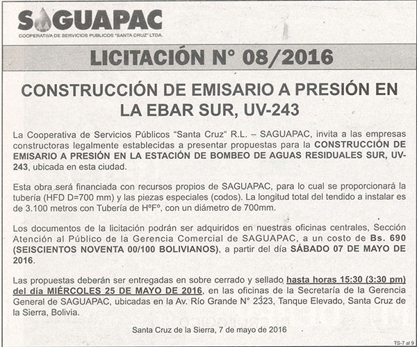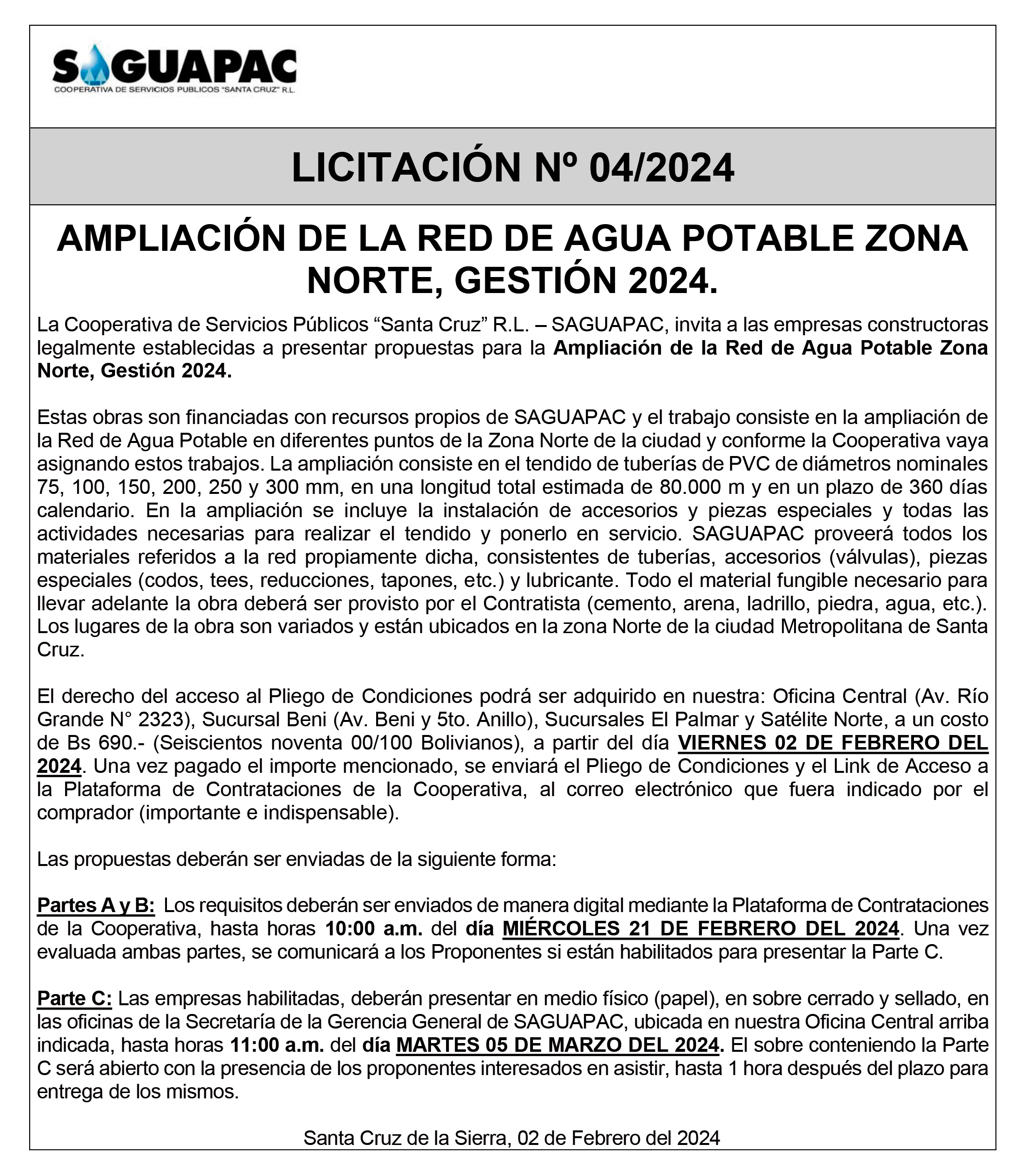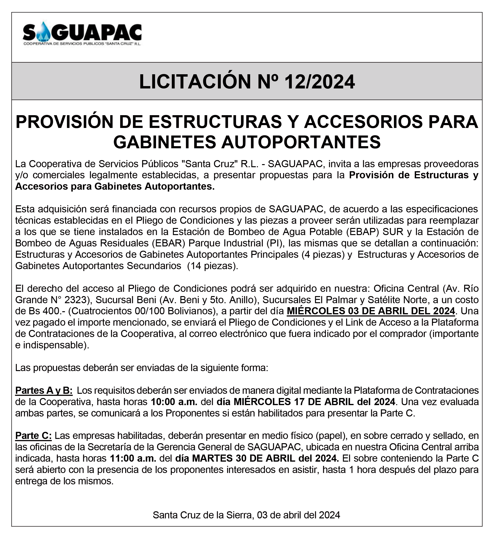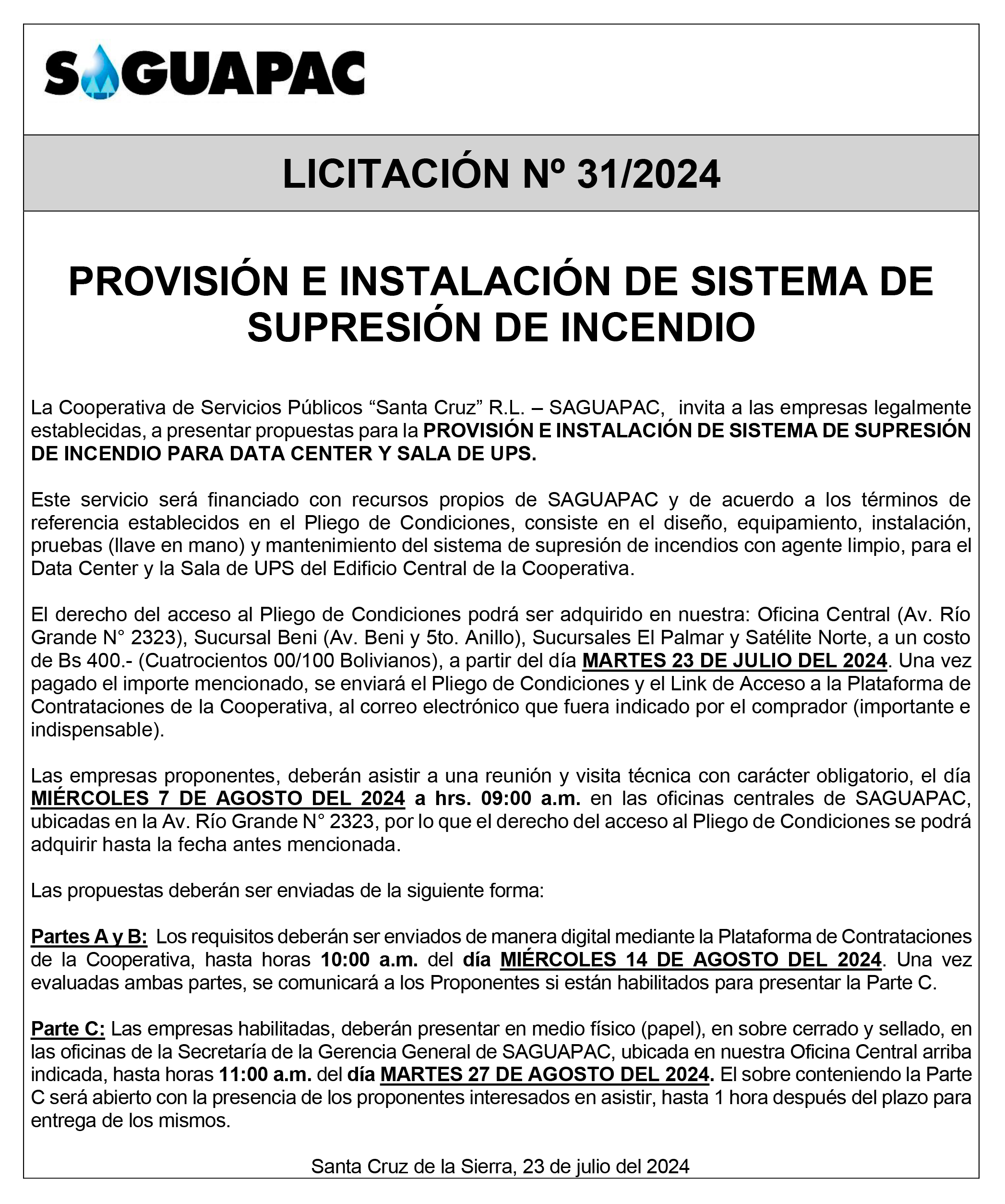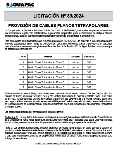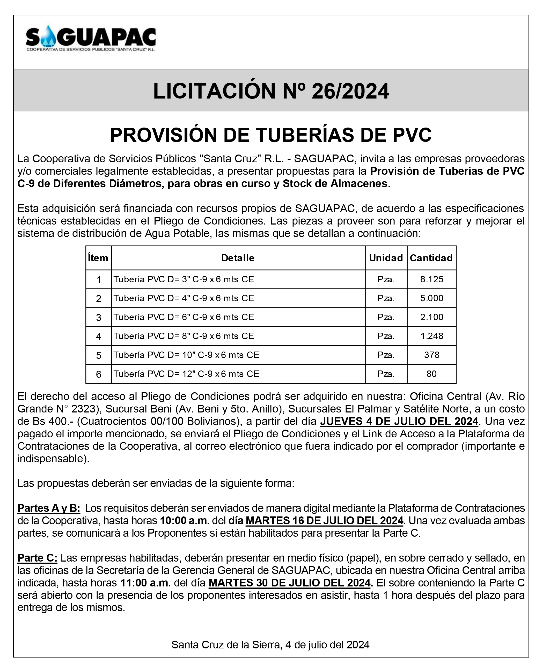 Los procesos de Contratación no son la excepción, ya que se encuentran debidamente normados bajo un Reglamento de Contratación de Obras, Bienes y Servicios, que contempla la modalidad y la normativa de las Licitaciones Públicas, que es un proceso de participación abierto para todo público así como también los Actos de Apertura de Propuestas que se realizan en presencia de los proponentes y representantes de las Cámaras de Industria y Comercio (CAINCO) en casos de bienes o servicios y de la Cámara de la Construcción de Santa Cruz en casos de obras.