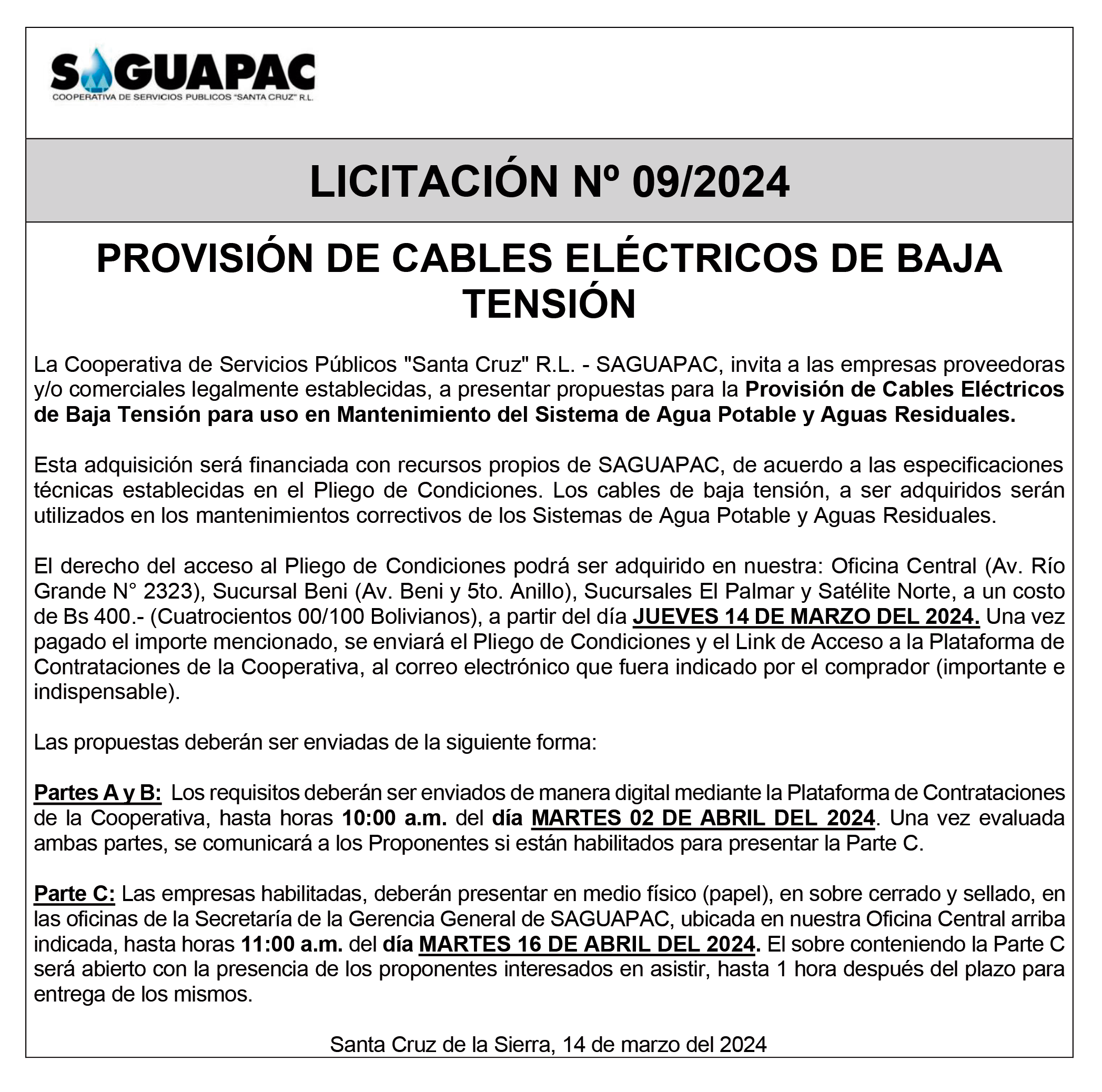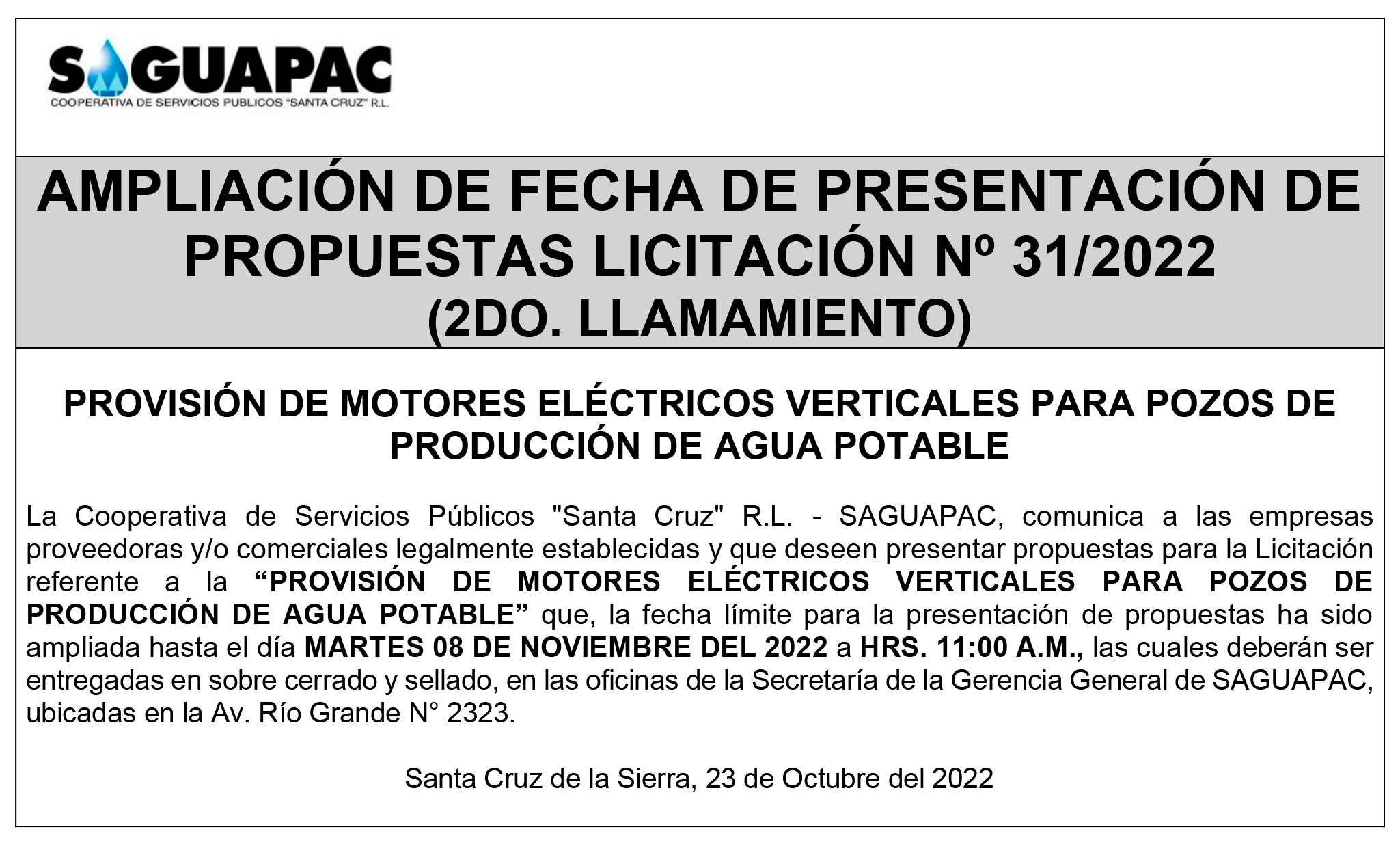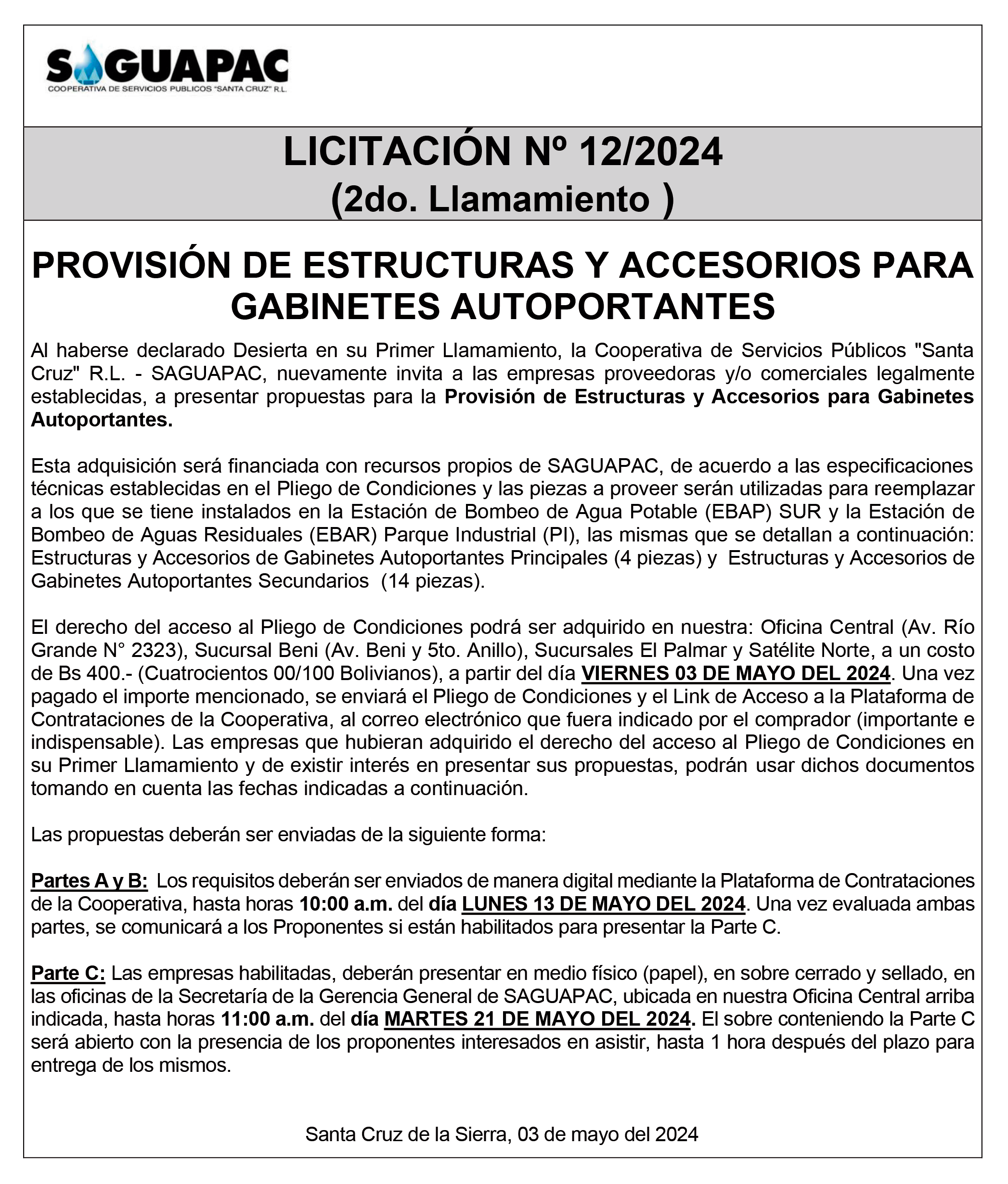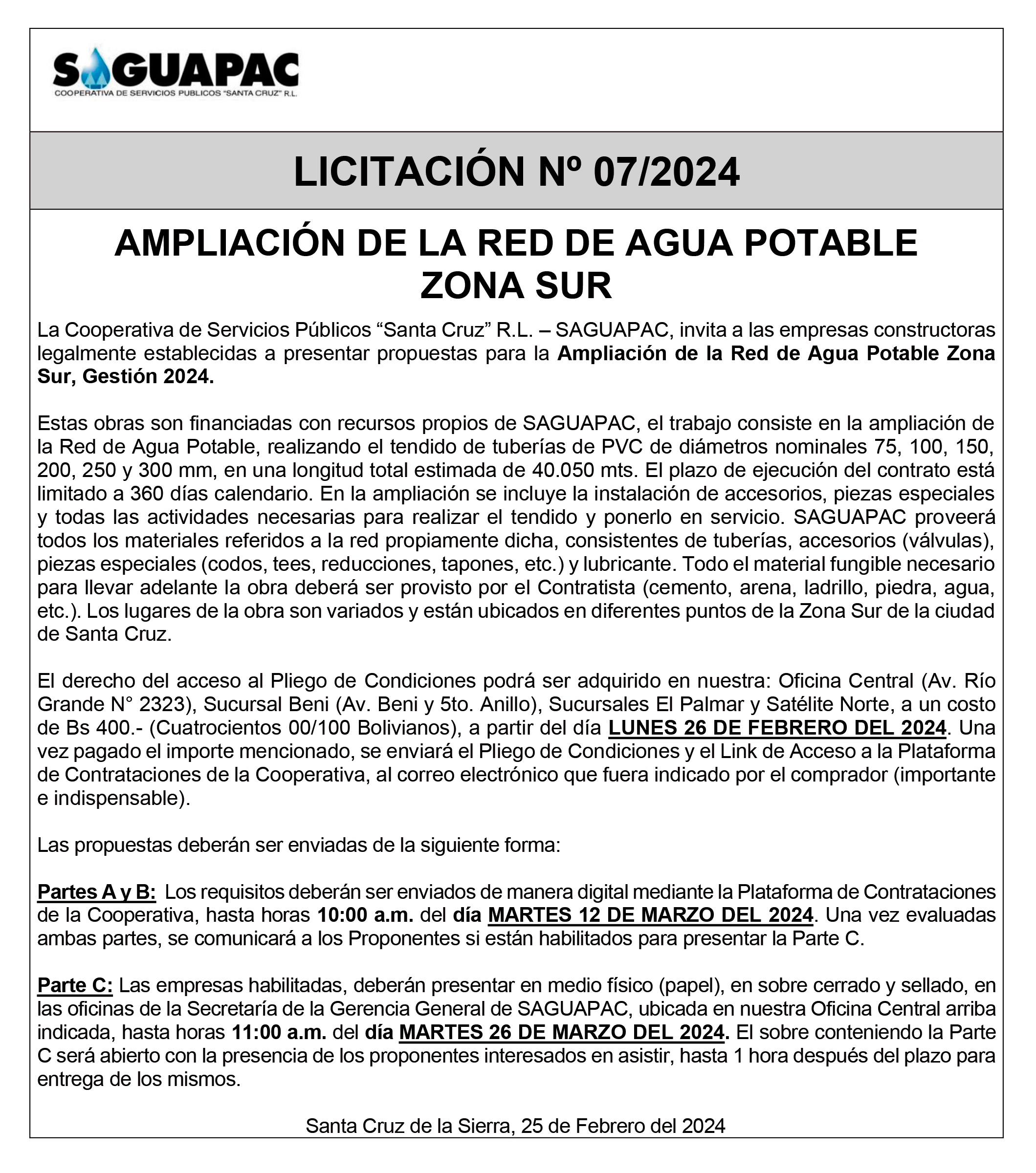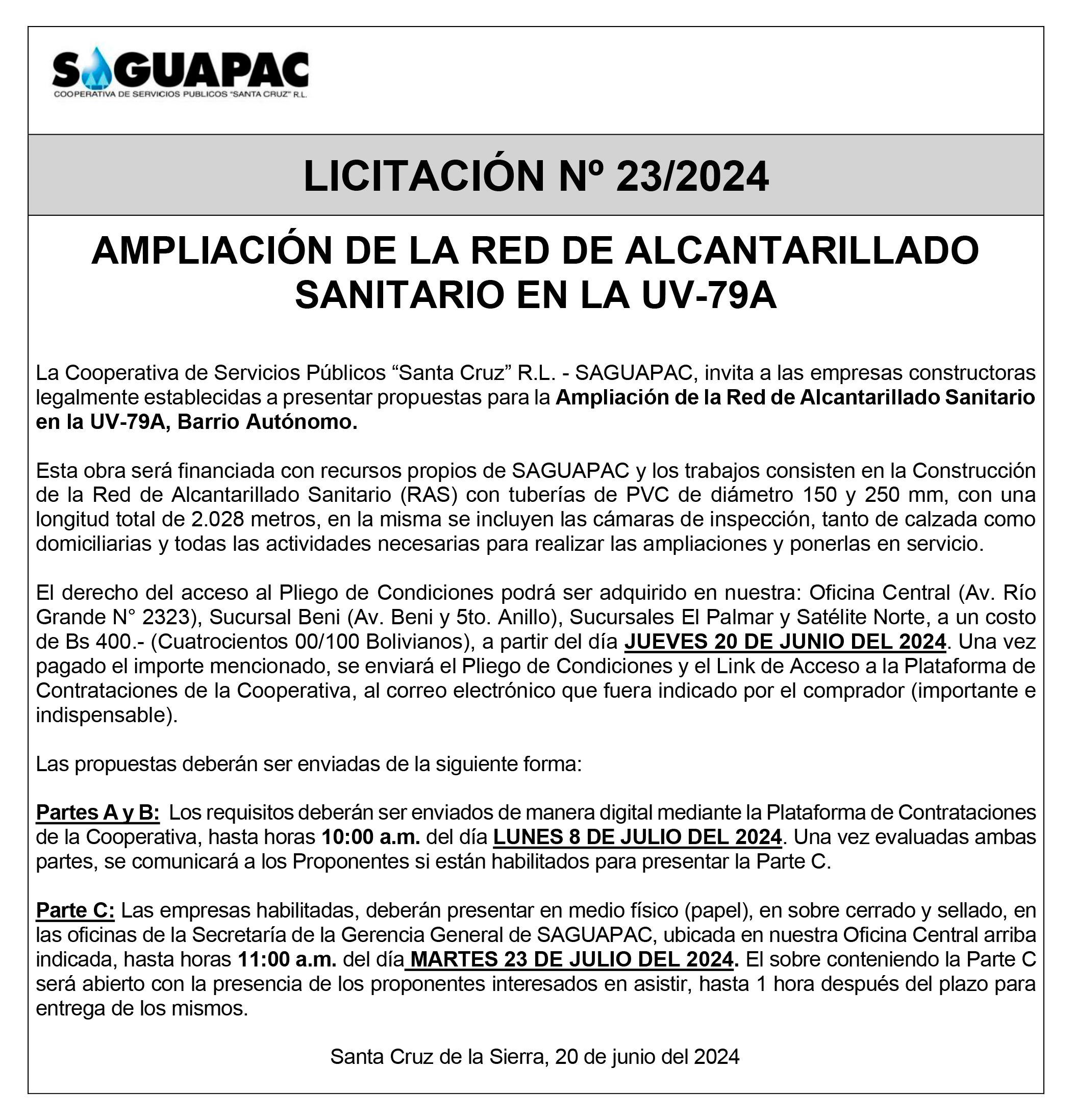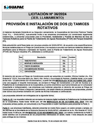 Los procesos de Contratación no son la excepción, ya que se encuentran debidamente normados bajo un Reglamento de Contratación de Obras, Bienes y Servicios, que contempla la modalidad y la normativa de las Licitaciones Públicas, que es un proceso de participación abierto para todo público así como también los Actos de Apertura de Propuestas que se realizan en presencia de los proponentes y representantes de las Cámaras de Industria y Comercio (CAINCO) en casos de bienes o servicios y de la Cámara de la Construcción de Santa Cruz en casos de obras.