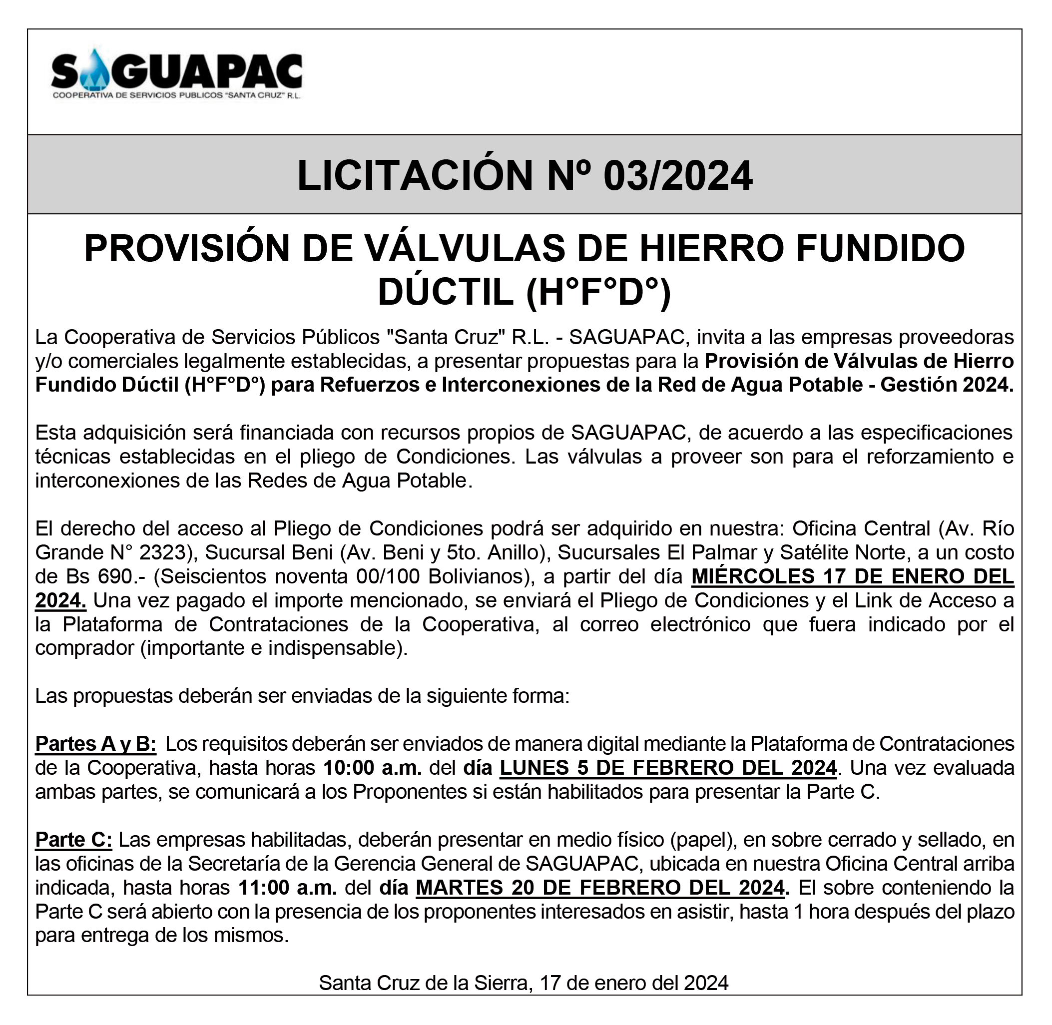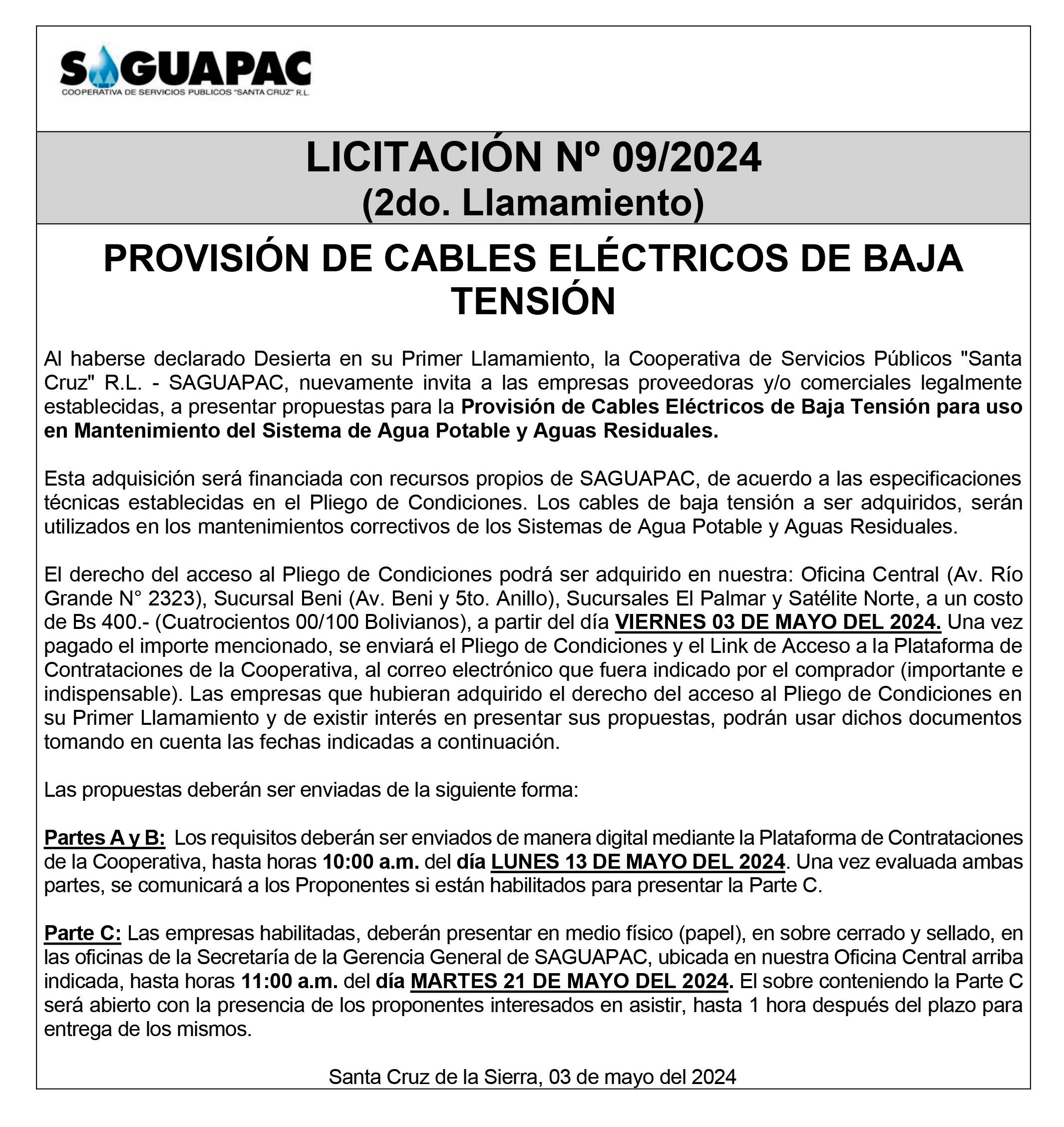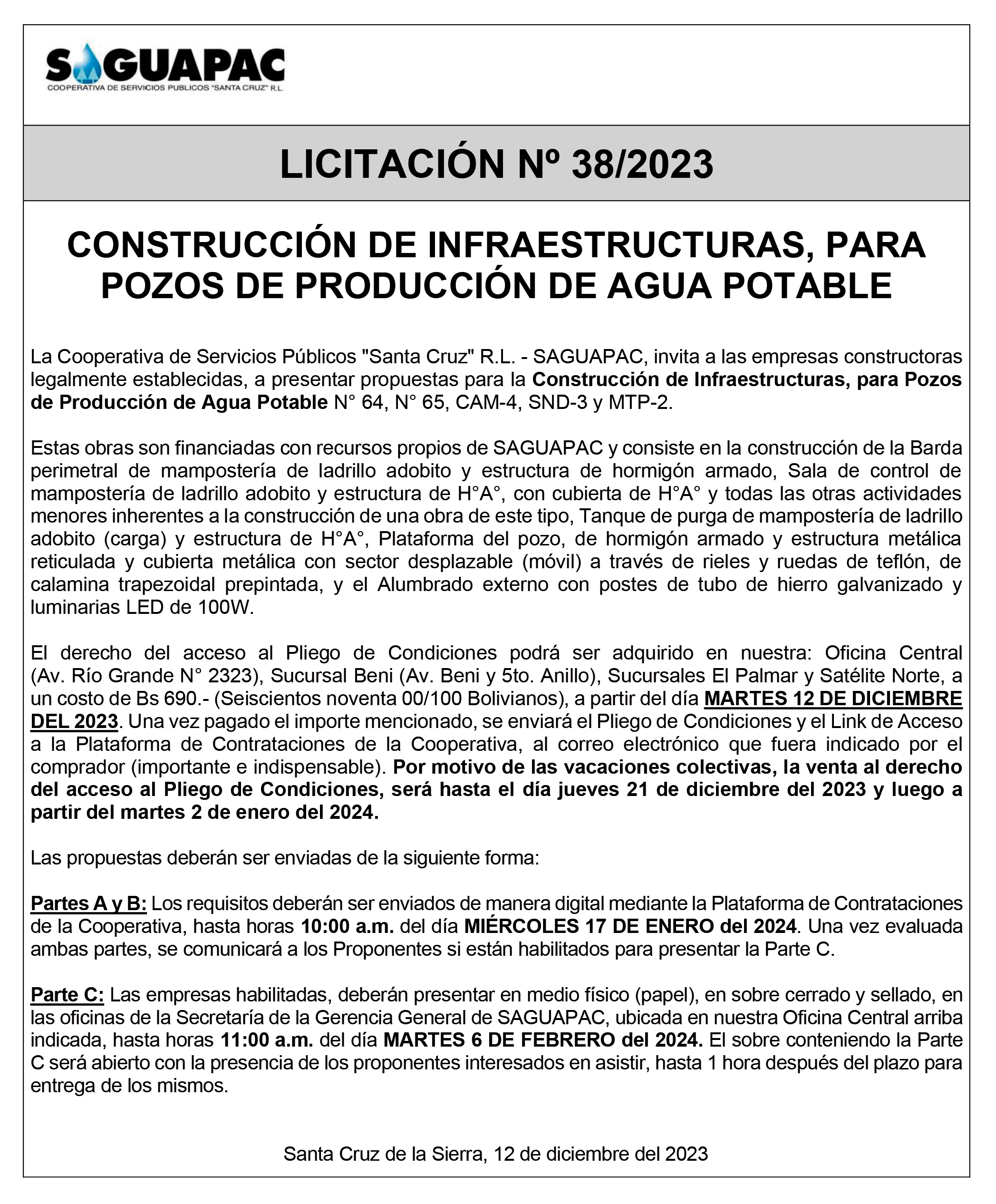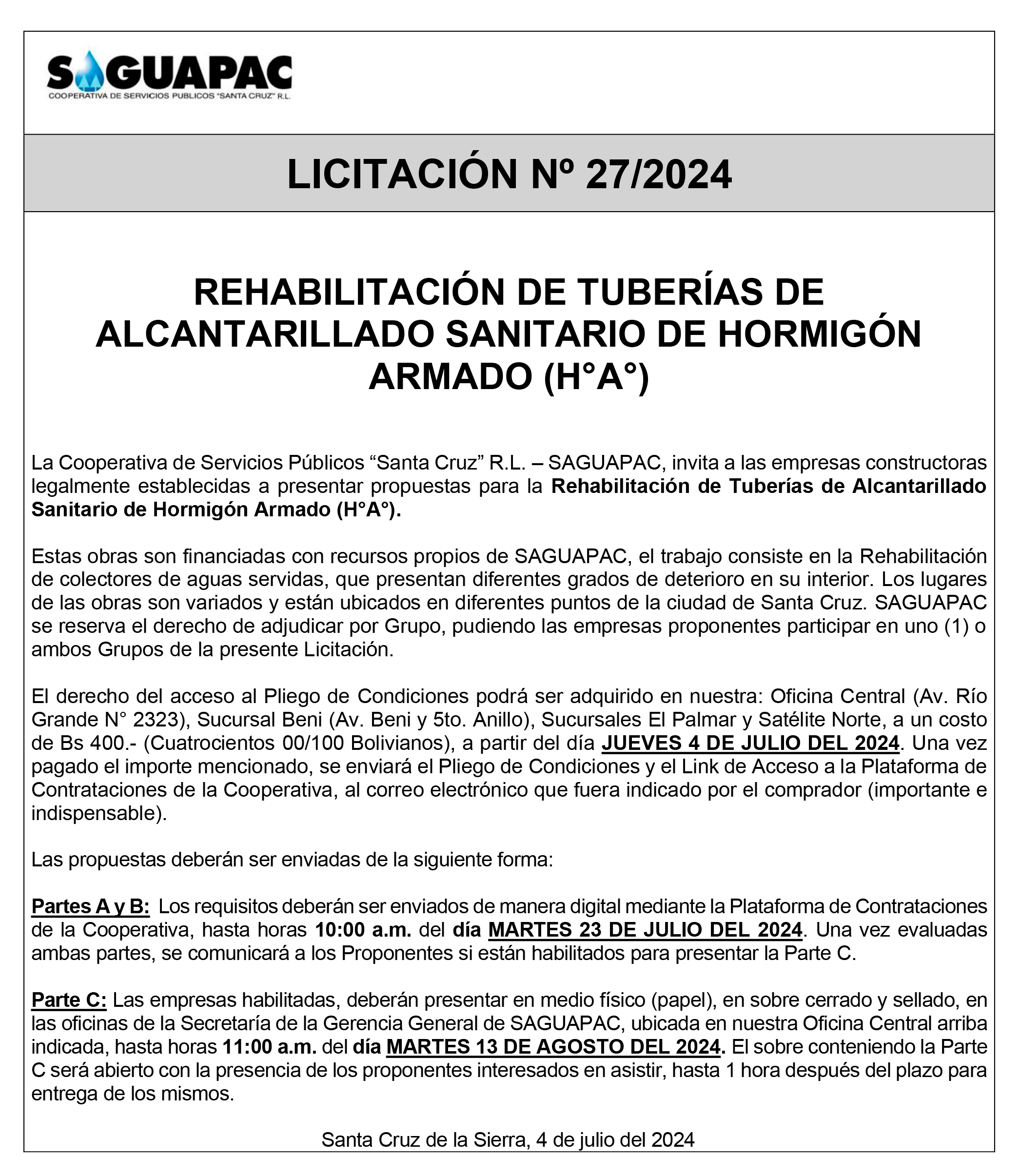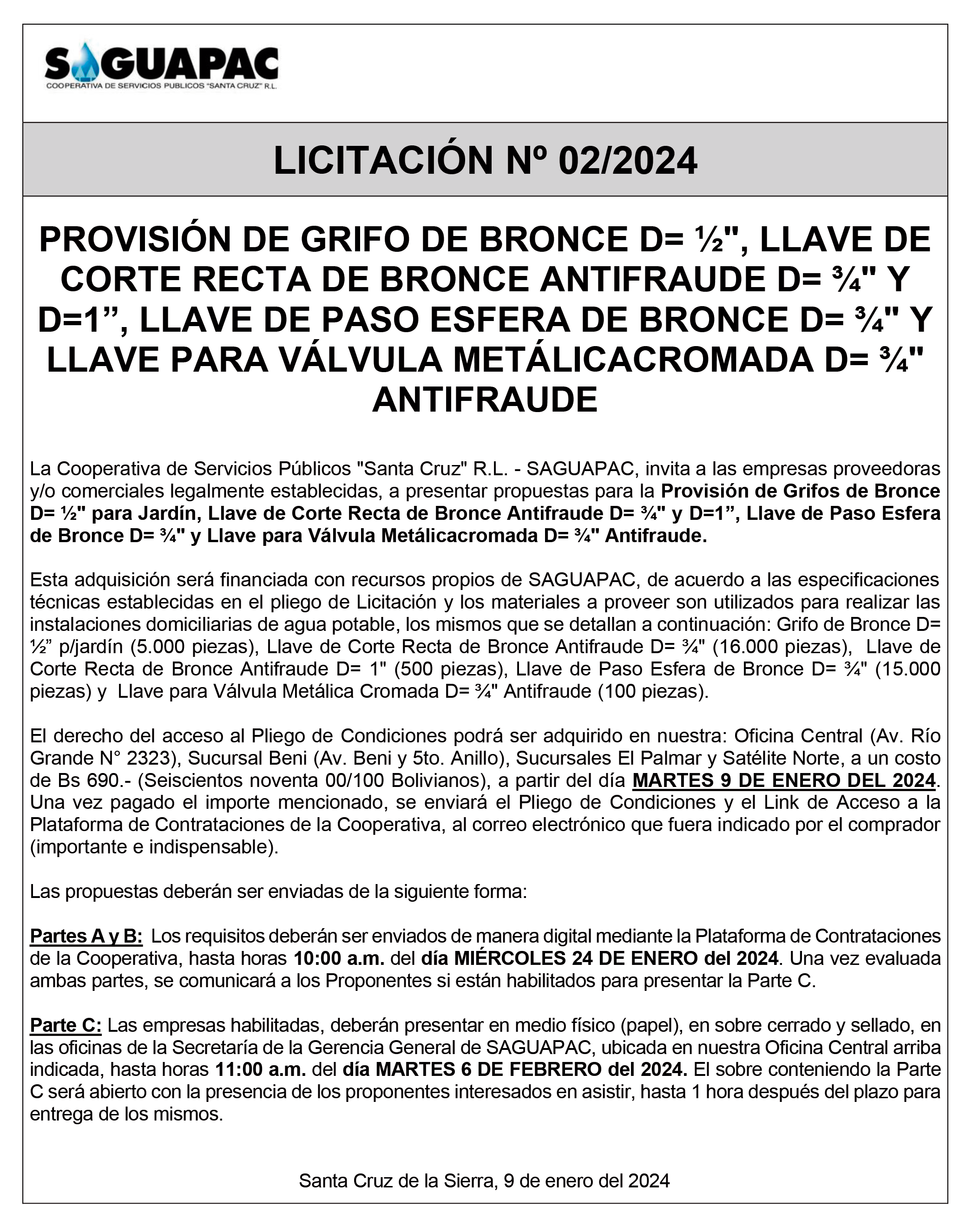 Los procesos de Contratación no son la excepción, ya que se encuentran debidamente normados bajo un Reglamento de Contratación de Obras, Bienes y Servicios, que contempla la modalidad y la normativa de las Licitaciones Públicas, que es un proceso de participación abierto para todo público así como también los Actos de Apertura de Propuestas que se realizan en presencia de los proponentes y representantes de las Cámaras de Industria y Comercio (CAINCO) en casos de bienes o servicios y de la Cámara de la Construcción de Santa Cruz en casos de obras.