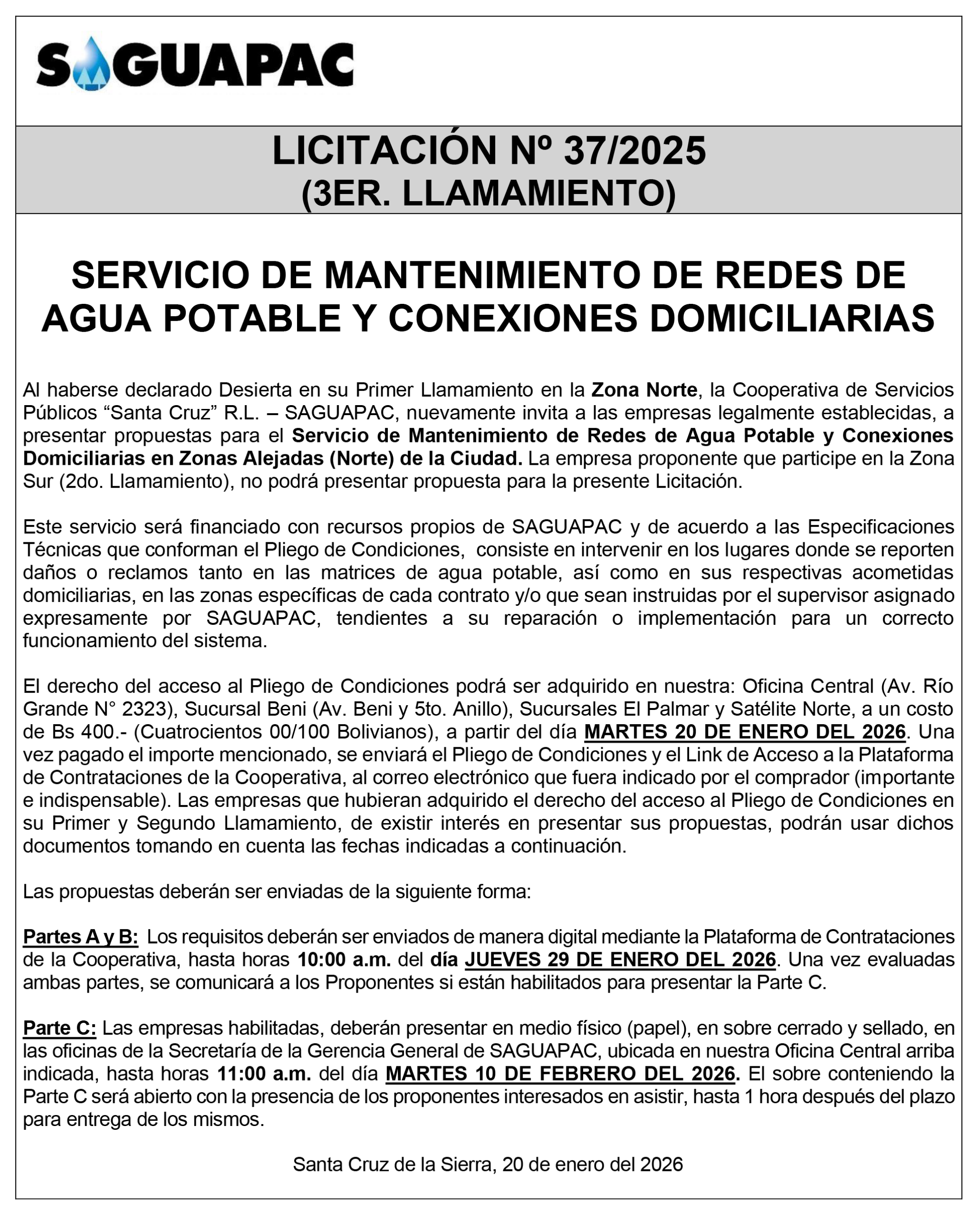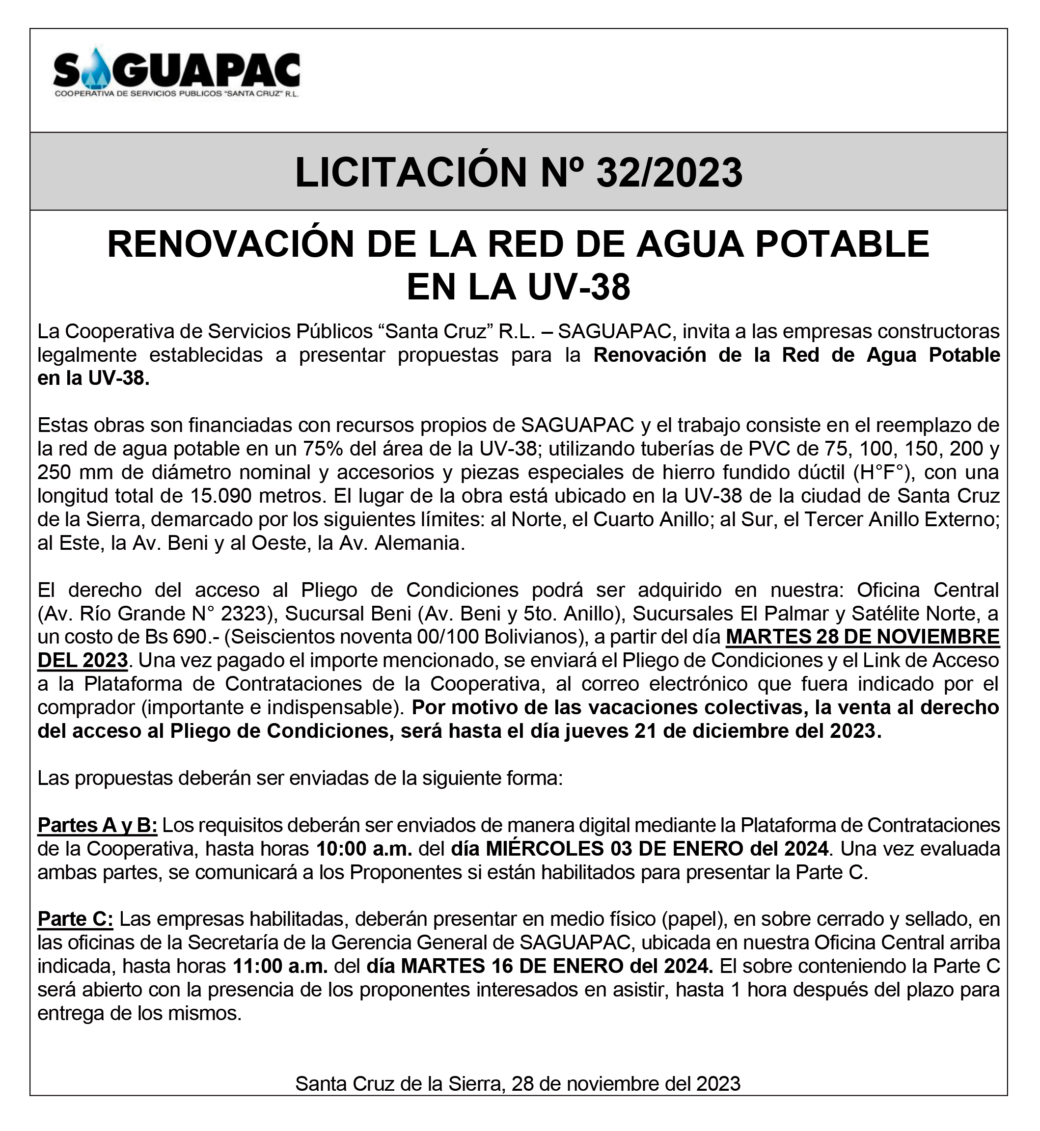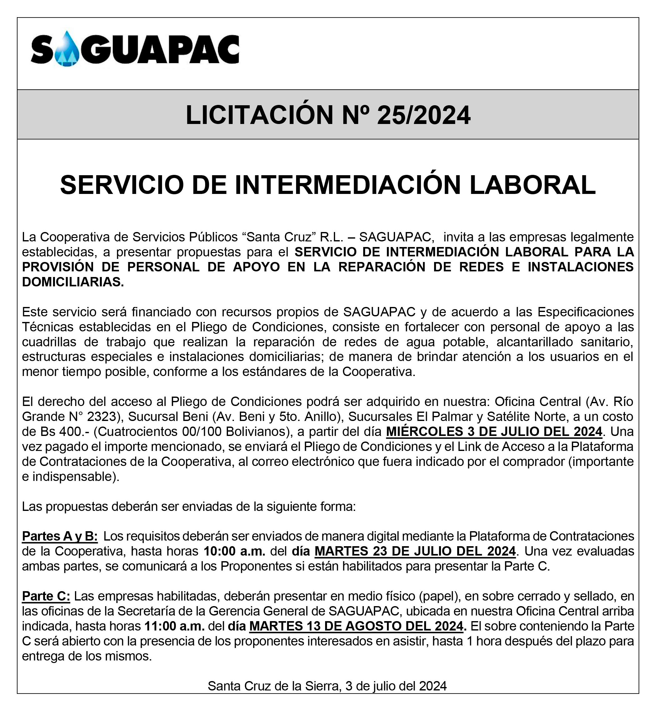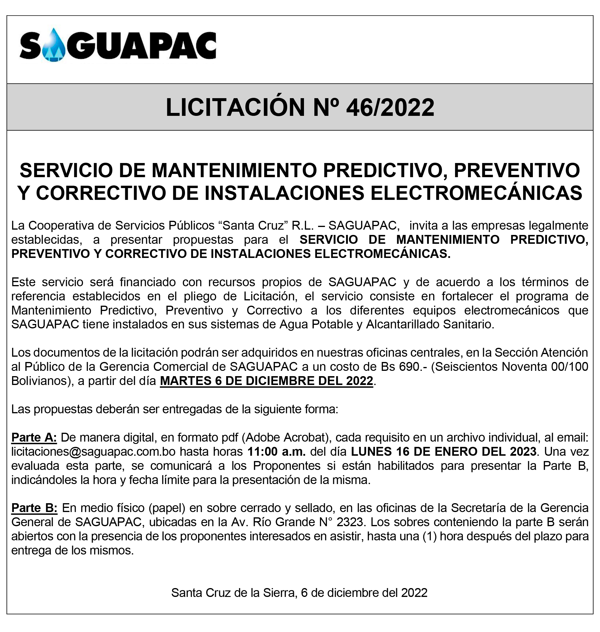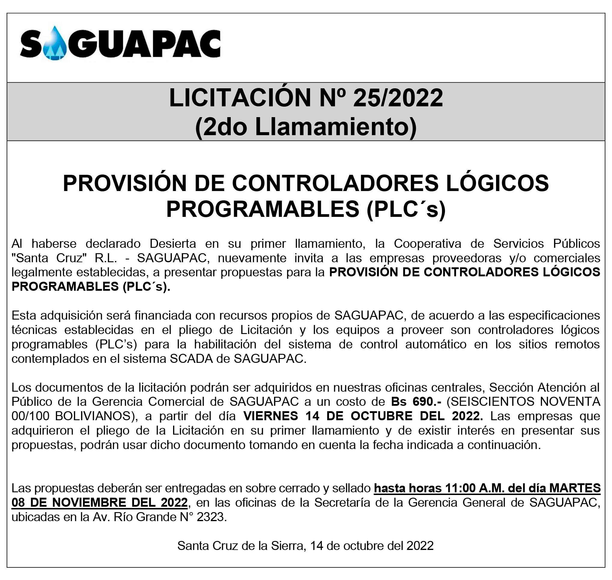 Los procesos de Contratación no son la excepción, ya que se encuentran debidamente normados bajo un Reglamento de Contratación de Obras, Bienes y Servicios, que contempla la modalidad y la normativa de las Licitaciones Públicas, que es un proceso de participación abierto para todo público así como también los Actos de Apertura de Propuestas que se realizan en presencia de los proponentes y representantes de las Cámaras de Industria y Comercio (CAINCO) en casos de bienes o servicios y de la Cámara de la Construcción de Santa Cruz en casos de obras.