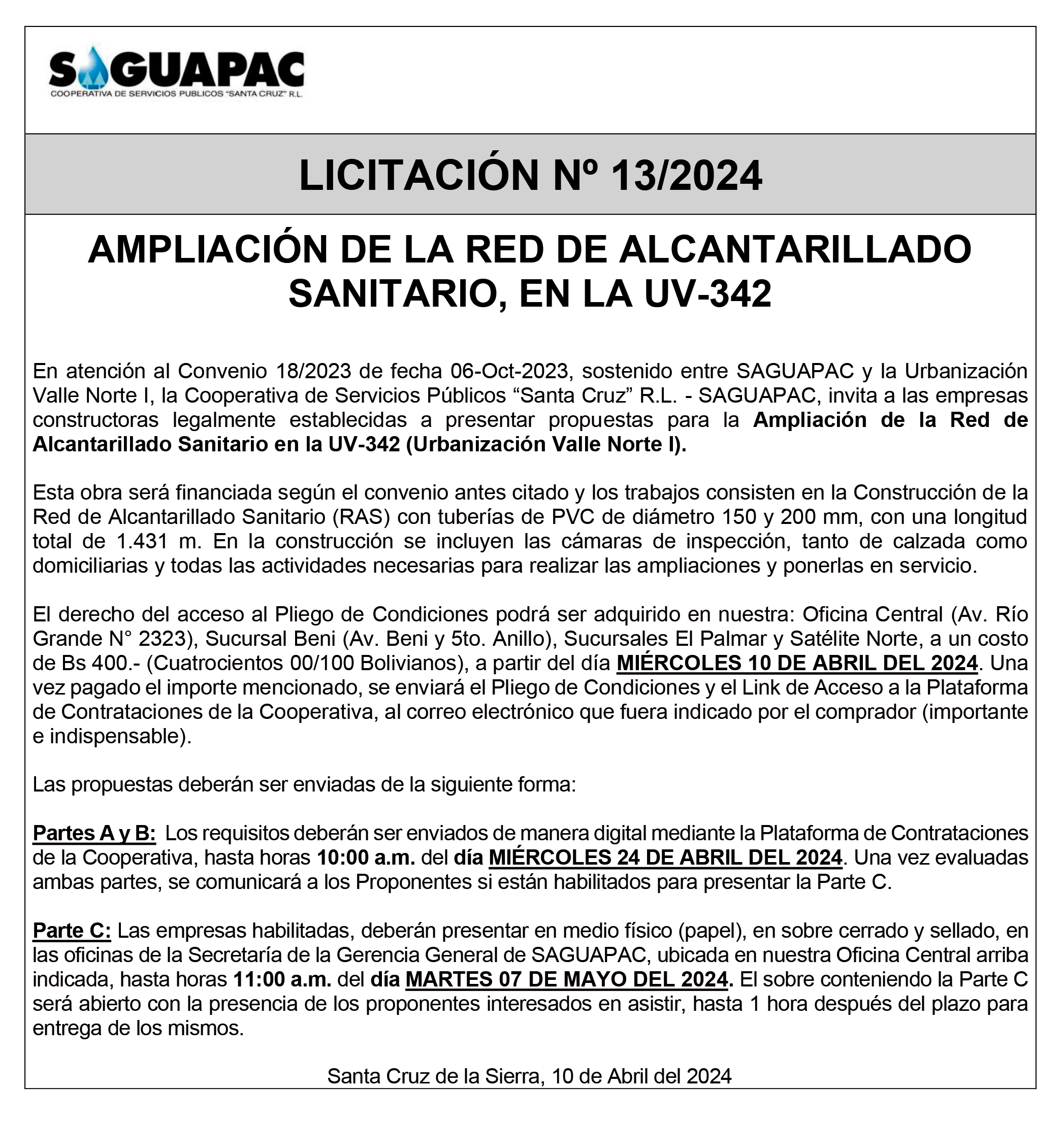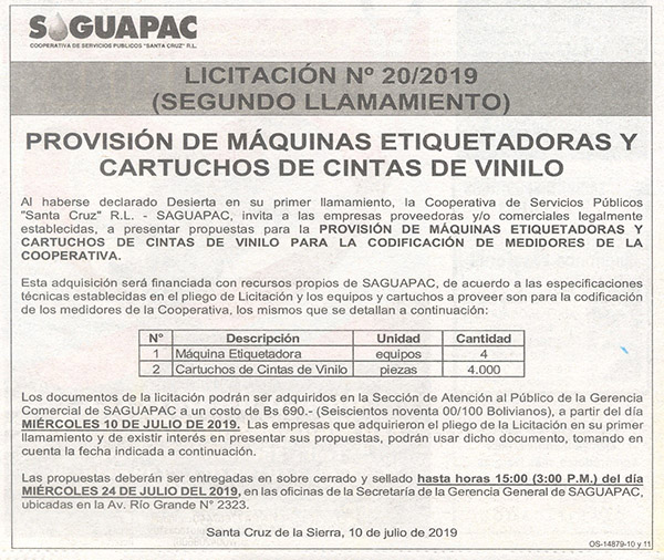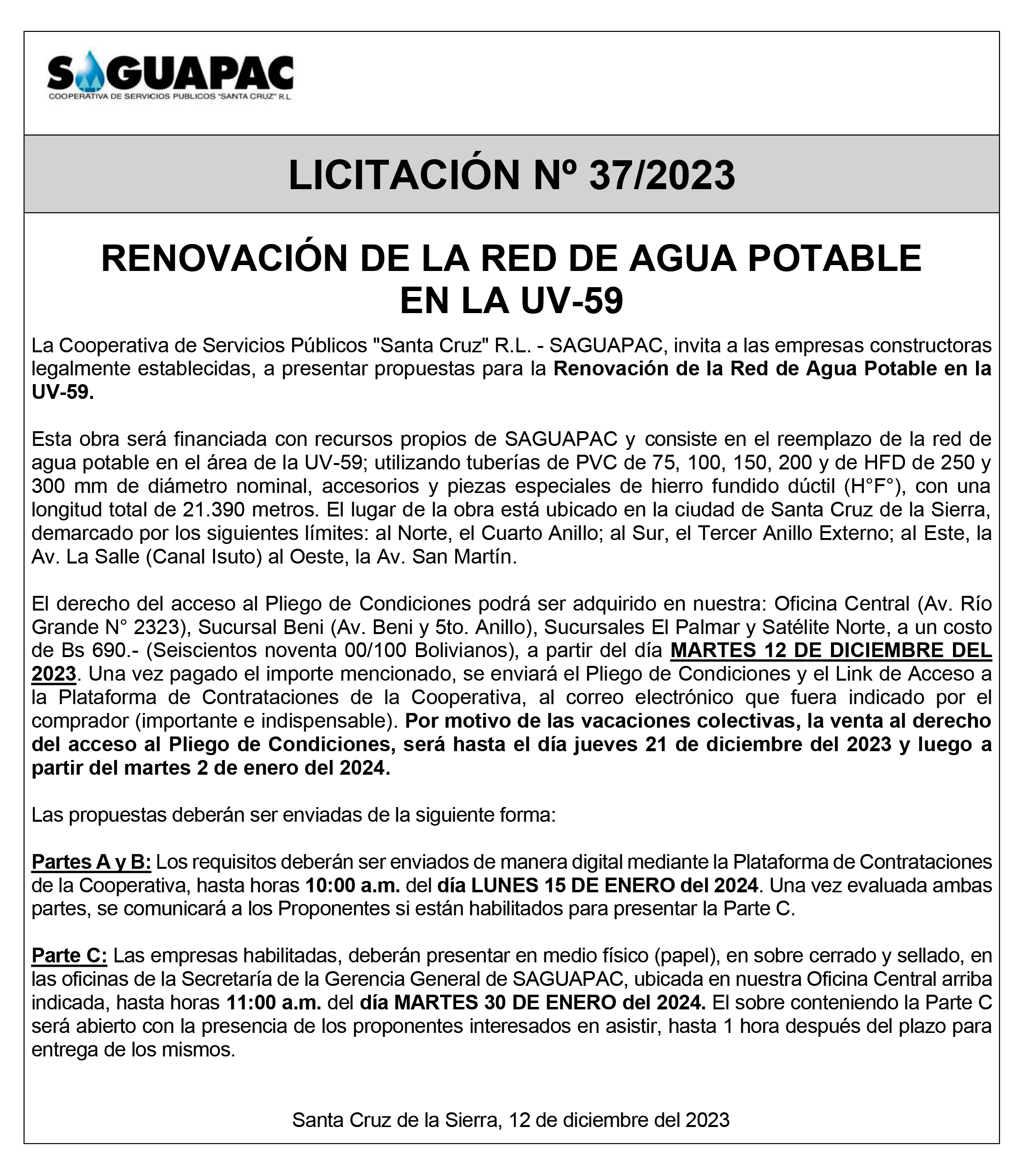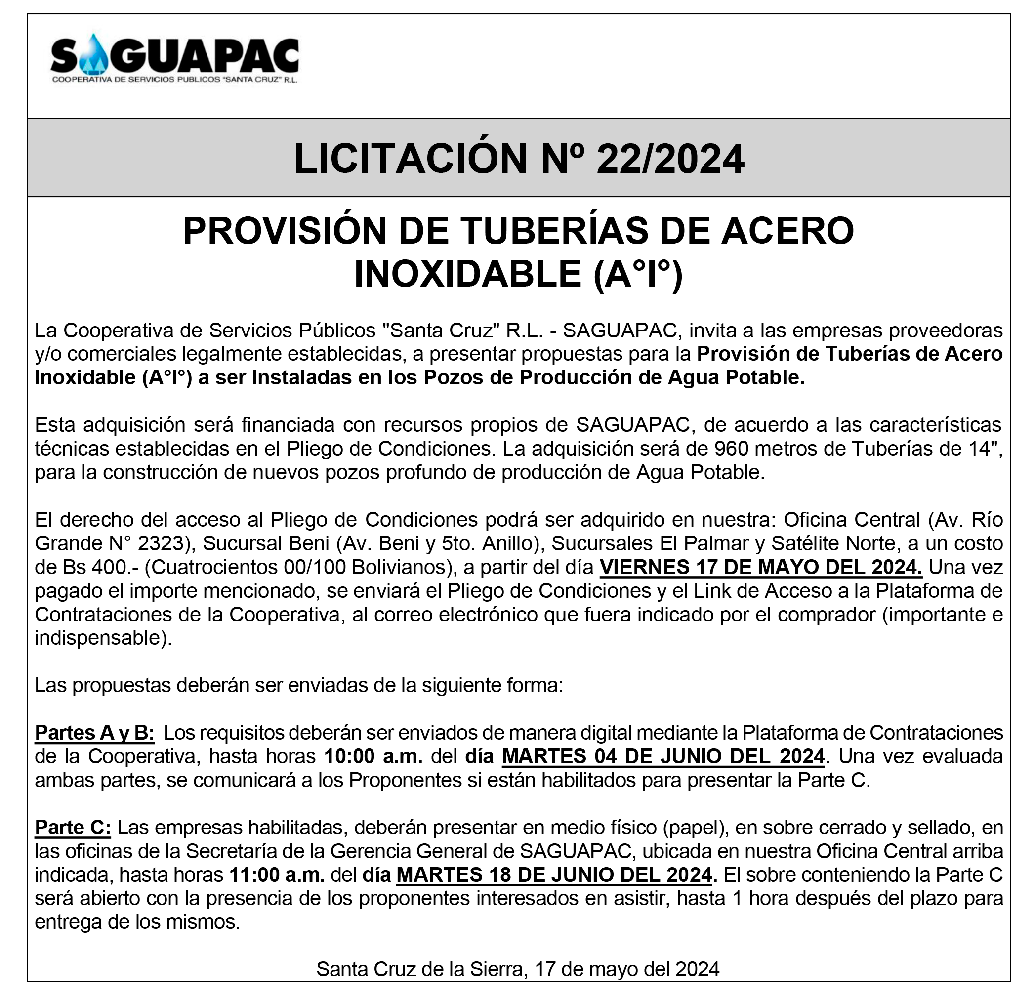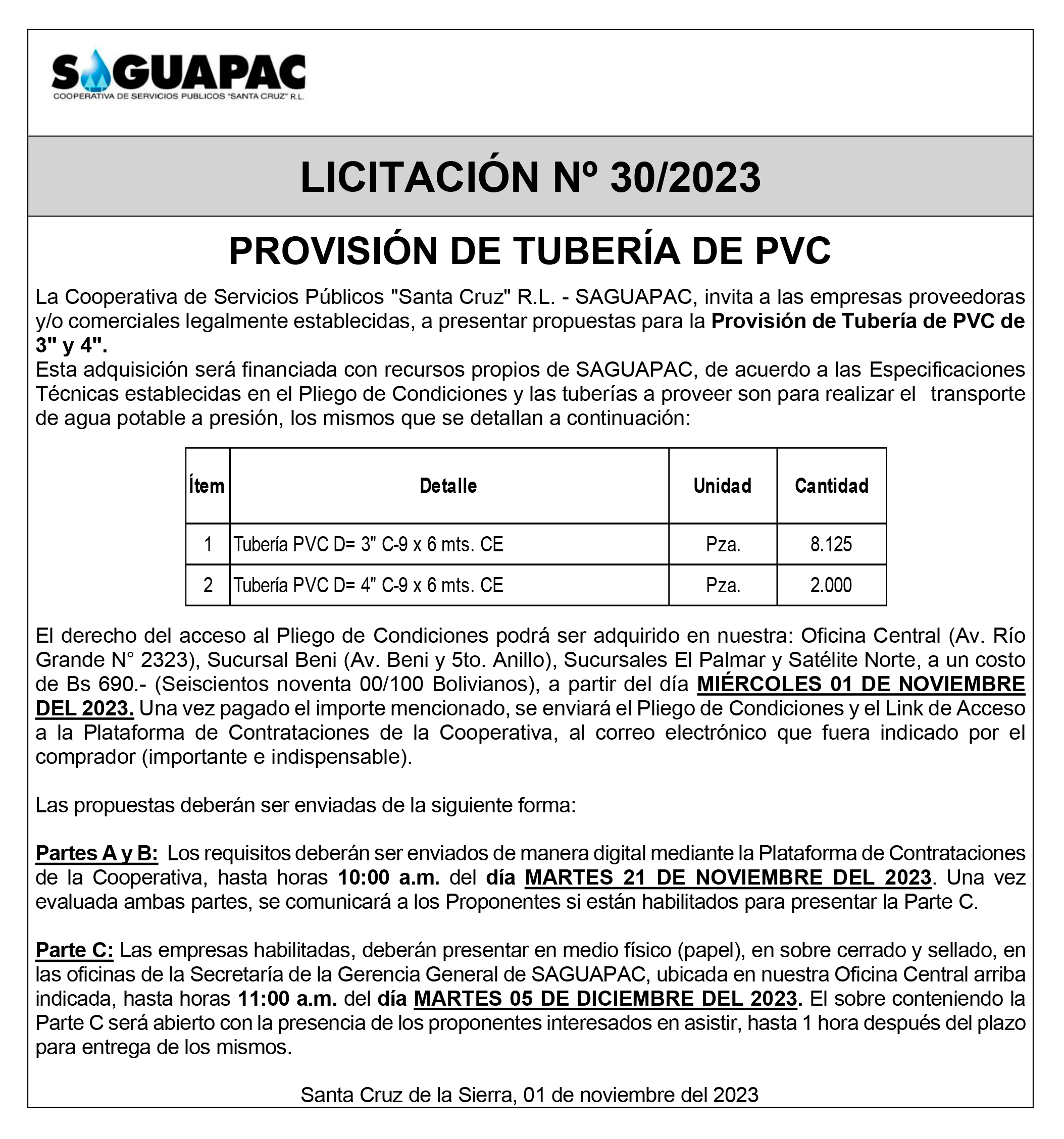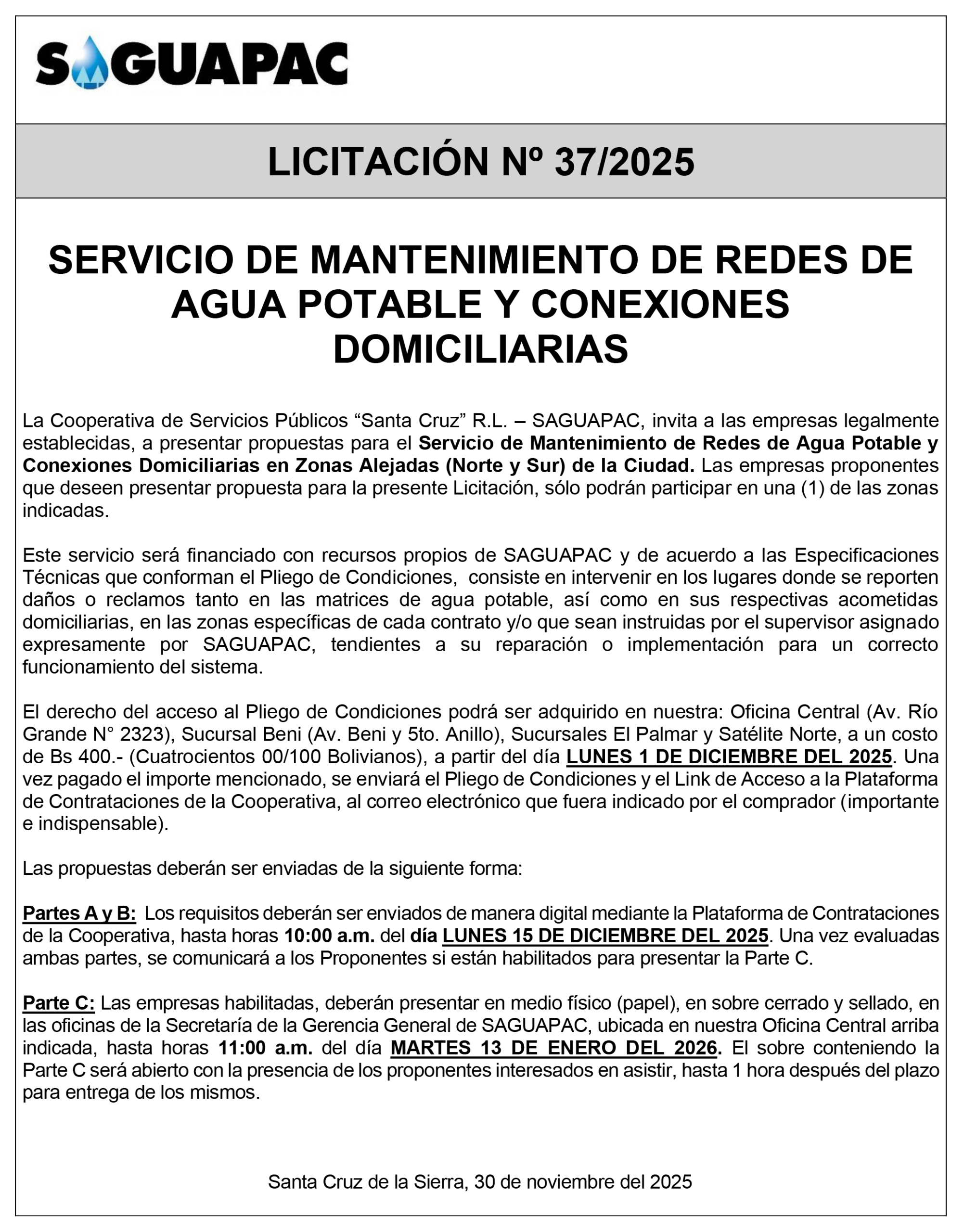Los procesos de Contratación no son la excepción, ya que se encuentran debidamente normados bajo un Reglamento de Contratación de Obras, Bienes y Servicios, que contempla la modalidad y la normativa de las Licitaciones Públicas, que es un proceso de participación abierto para todo público así como también los Actos de Apertura de Propuestas que se realizan en presencia de los proponentes y representantes de las Cámaras de Industria y Comercio (CAINCO) en casos de bienes o servicios y de la Cámara de la Construcción de Santa Cruz en casos de obras.