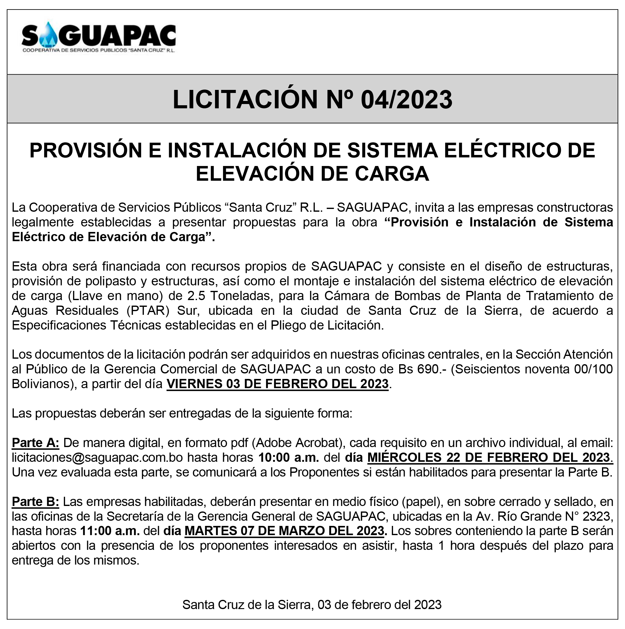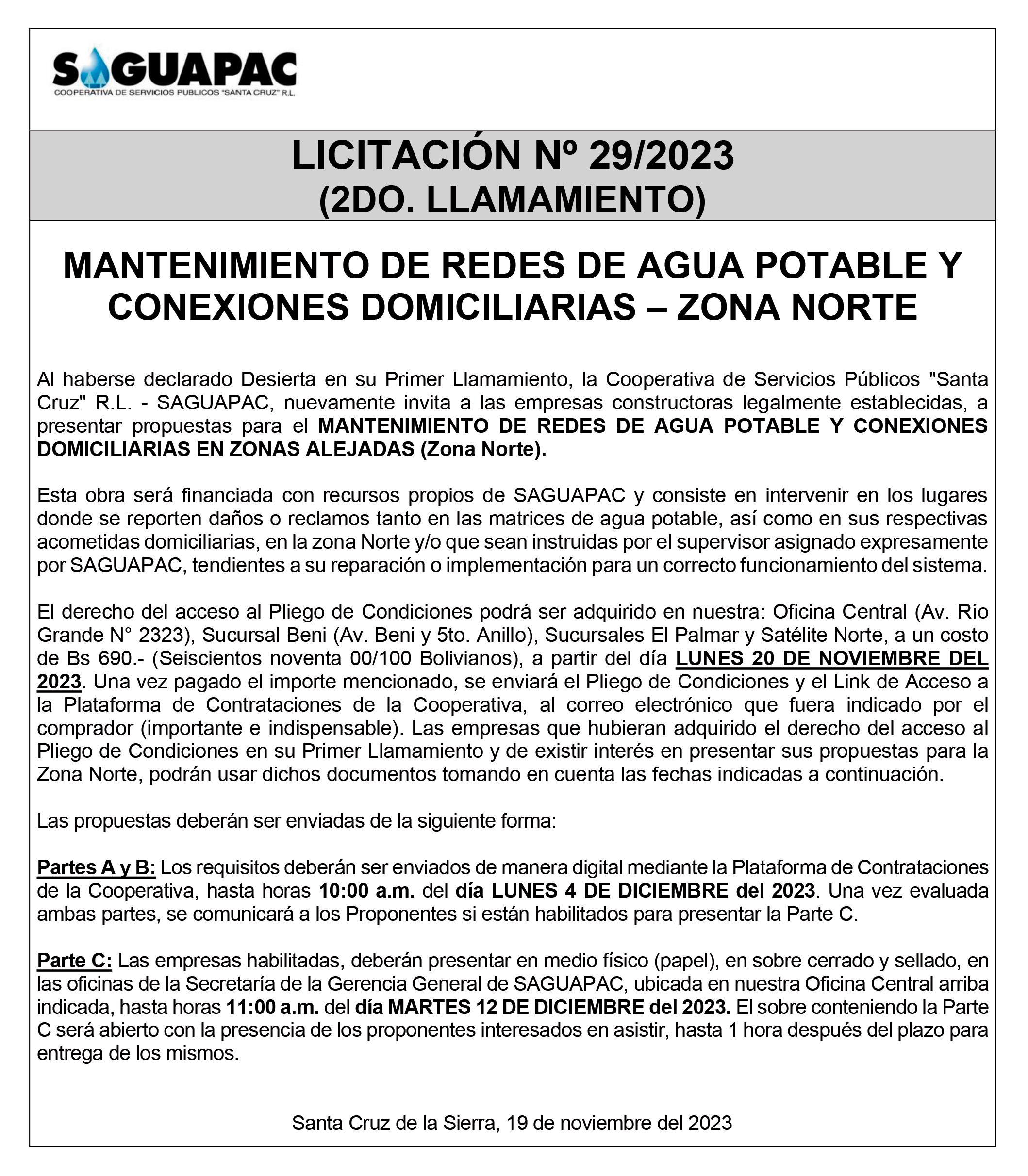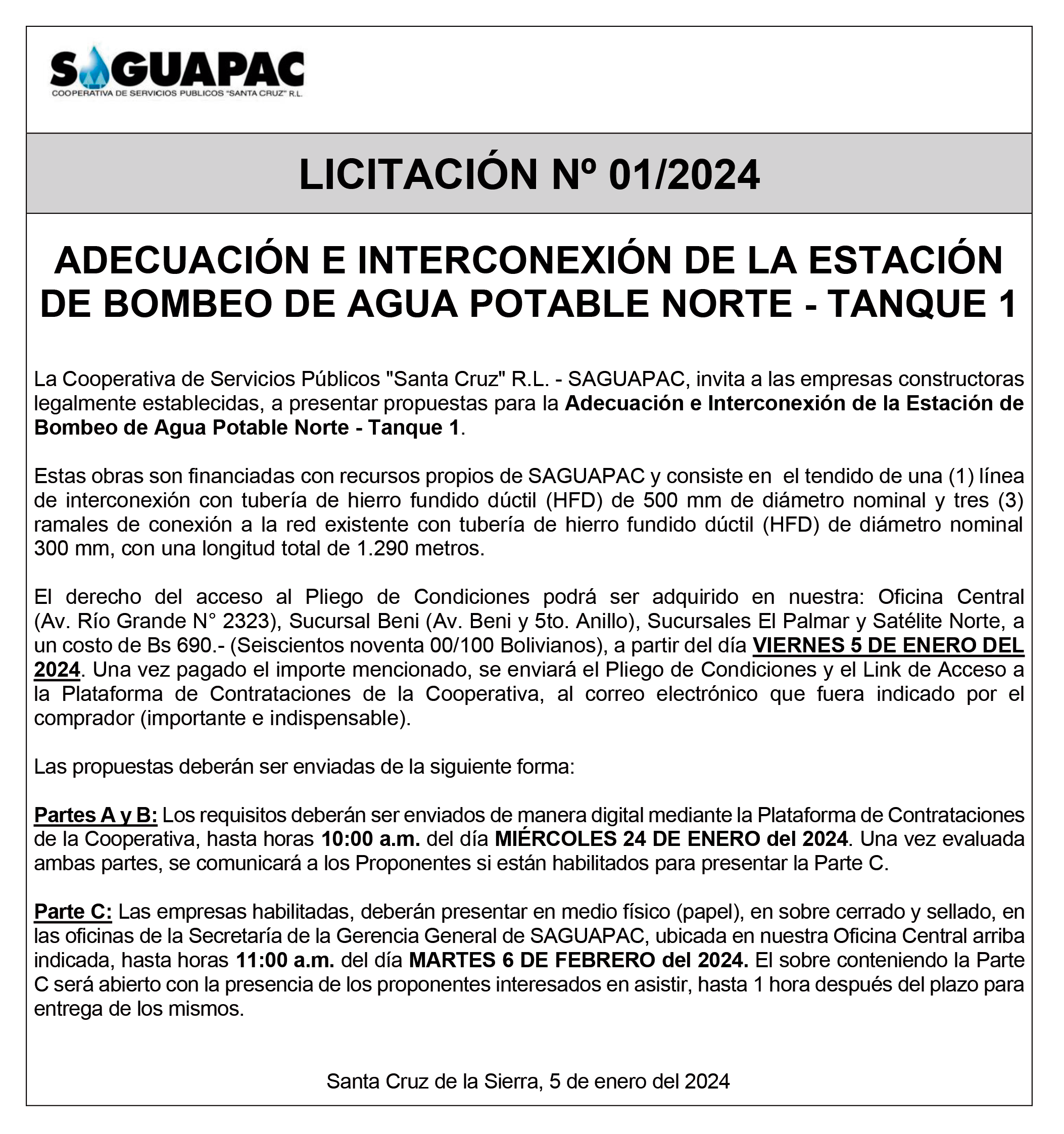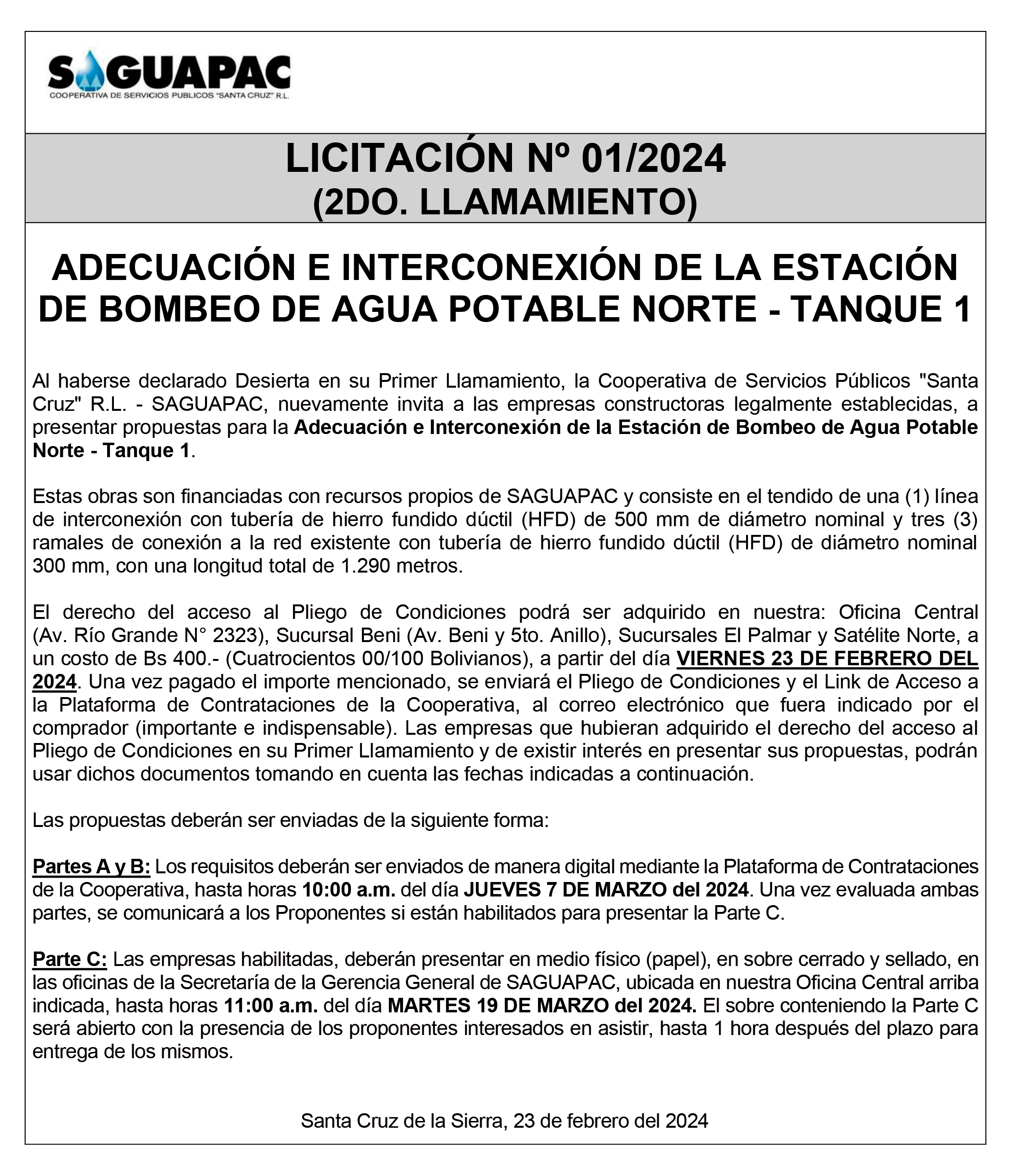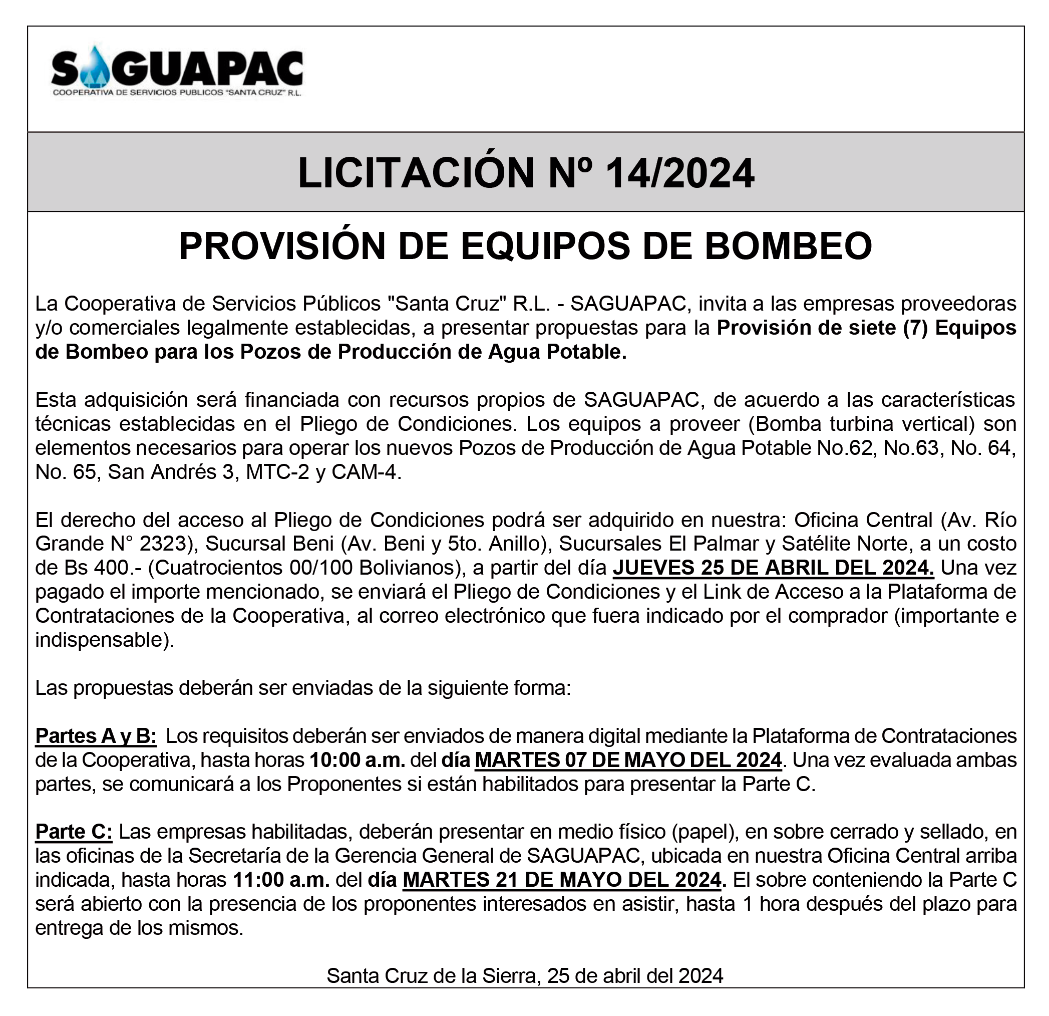 Los procesos de Contratación no son la excepción, ya que se encuentran debidamente normados bajo un Reglamento de Contratación de Obras, Bienes y Servicios, que contempla la modalidad y la normativa de las Licitaciones Públicas, que es un proceso de participación abierto para todo público así como también los Actos de Apertura de Propuestas que se realizan en presencia de los proponentes y representantes de las Cámaras de Industria y Comercio (CAINCO) en casos de bienes o servicios y de la Cámara de la Construcción de Santa Cruz en casos de obras.