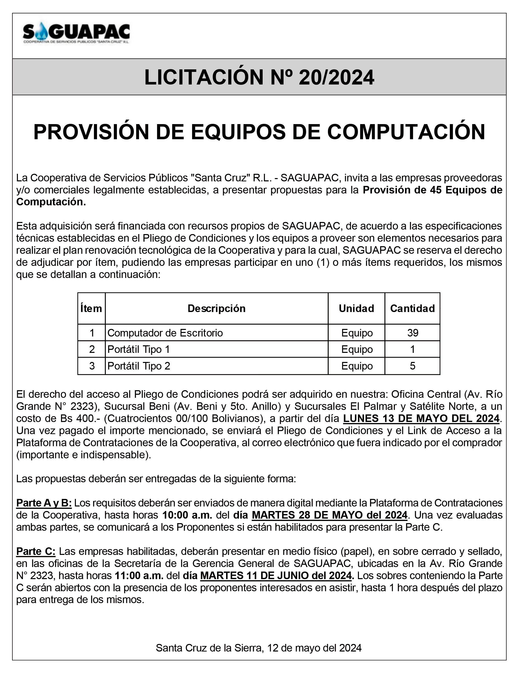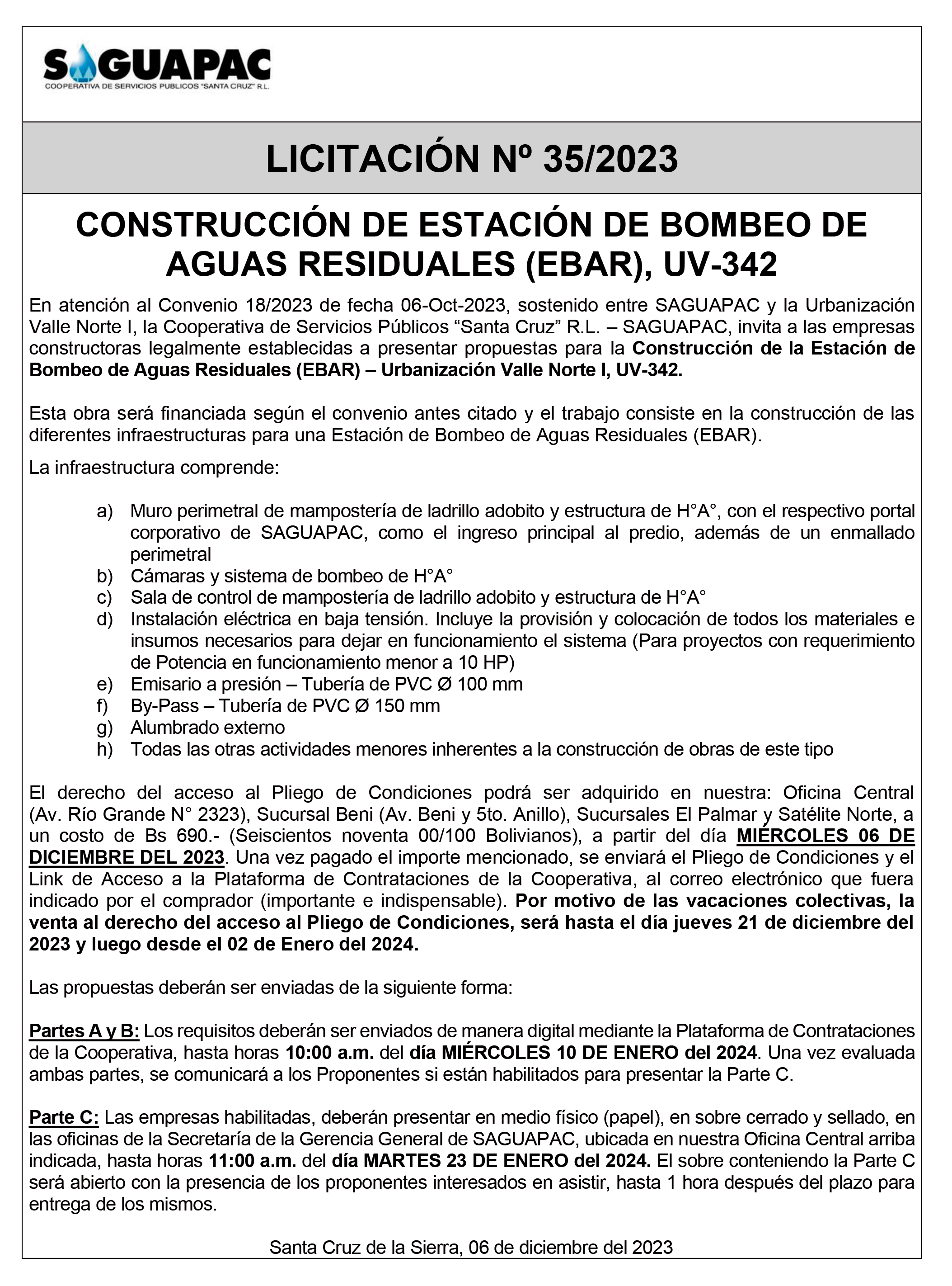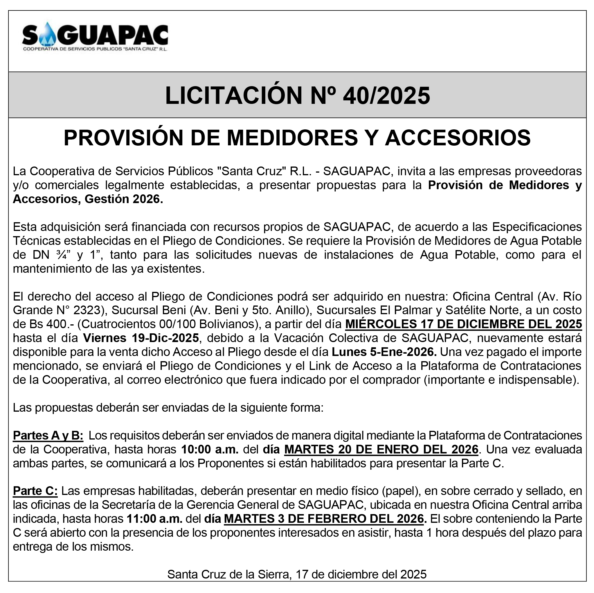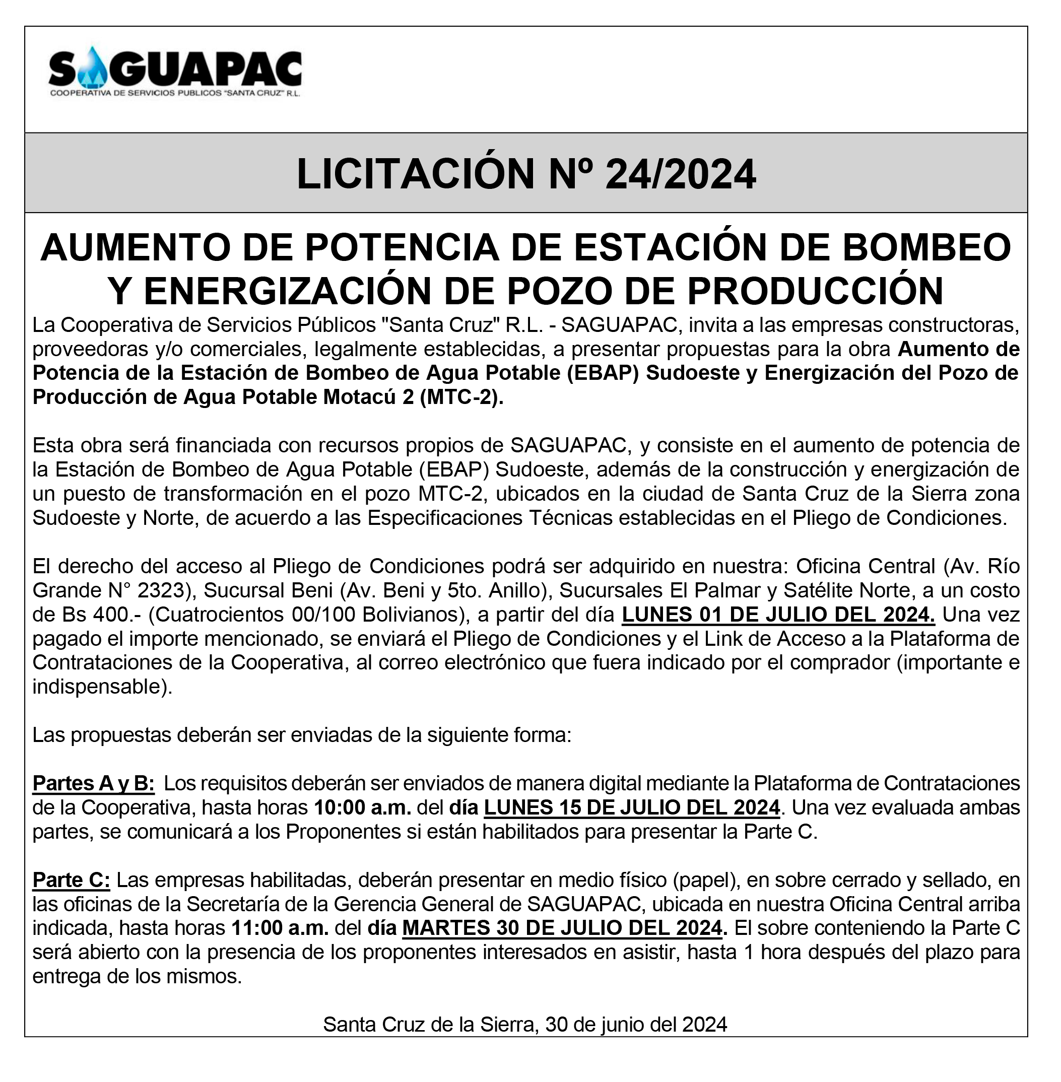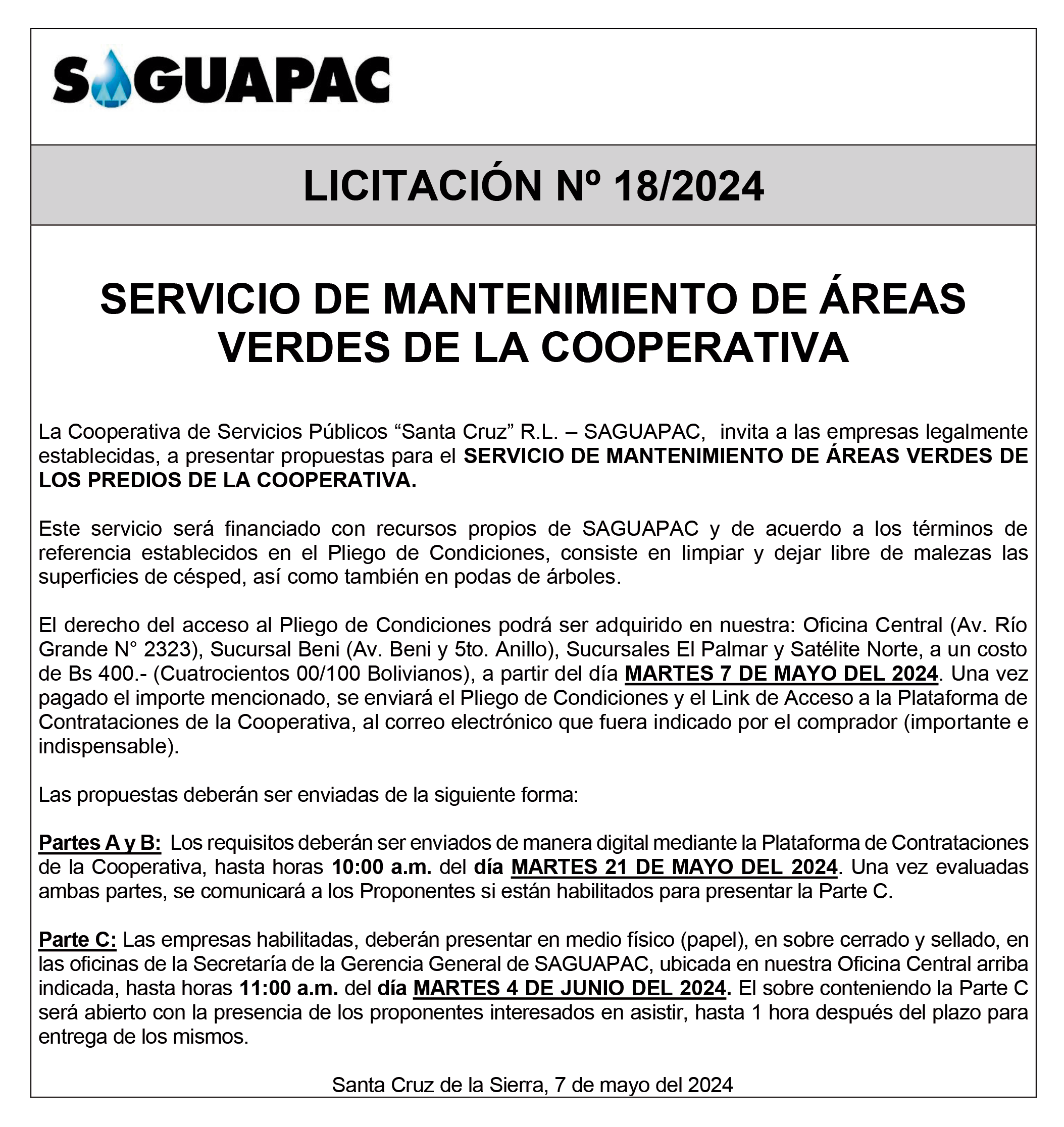 Los procesos de Contratación no son la excepción, ya que se encuentran debidamente normados bajo un Reglamento de Contratación de Obras, Bienes y Servicios, que contempla la modalidad y la normativa de las Licitaciones Públicas, que es un proceso de participación abierto para todo público así como también los Actos de Apertura de Propuestas que se realizan en presencia de los proponentes y representantes de las Cámaras de Industria y Comercio (CAINCO) en casos de bienes o servicios y de la Cámara de la Construcción de Santa Cruz en casos de obras.