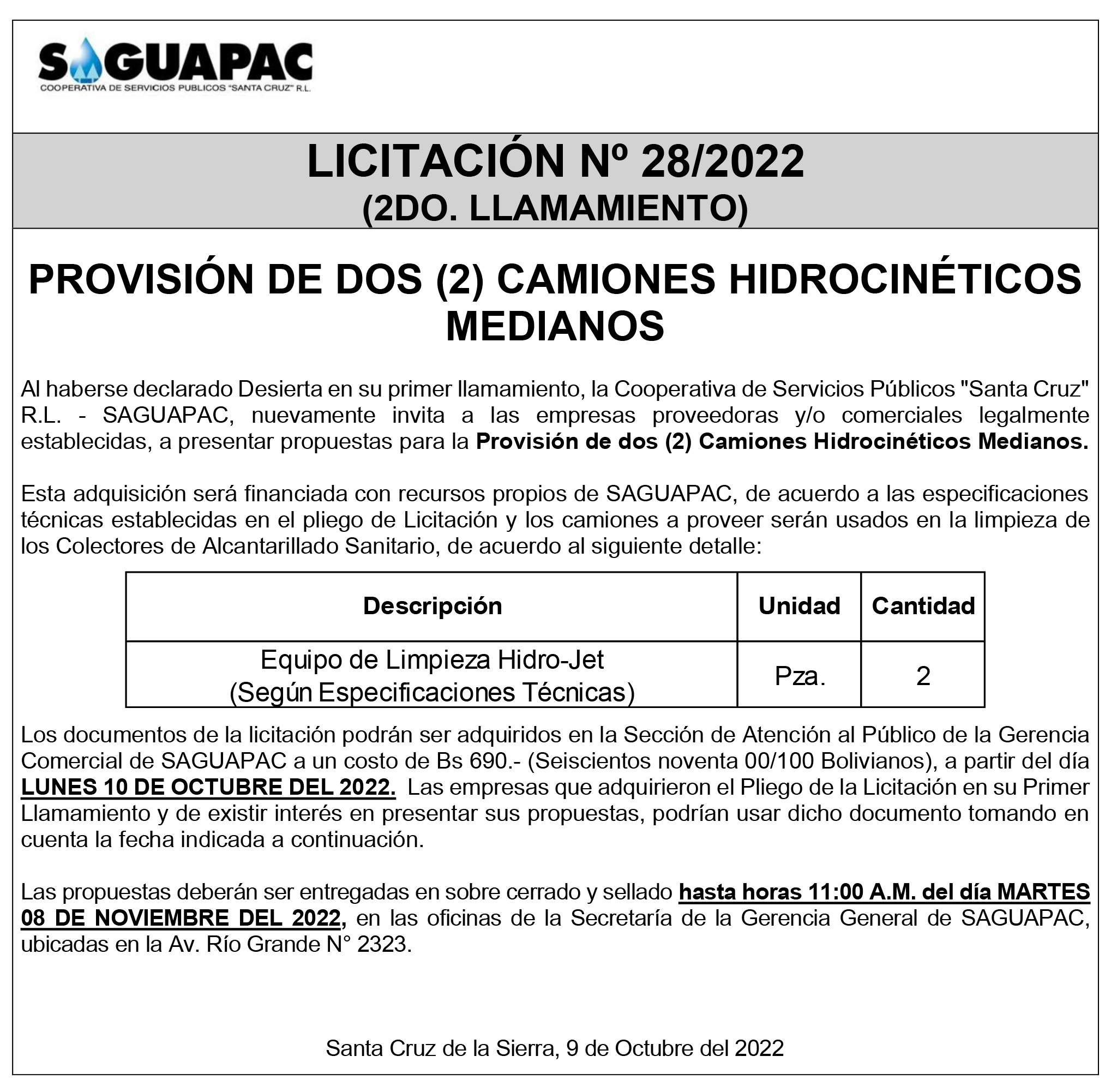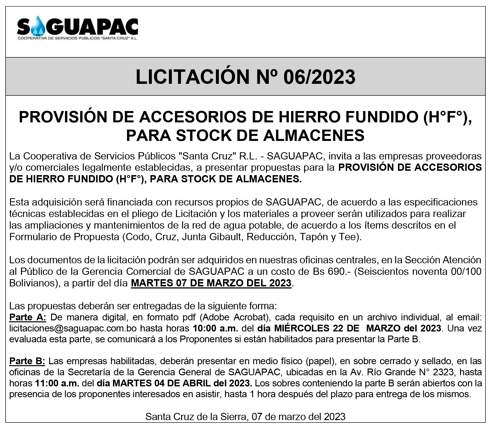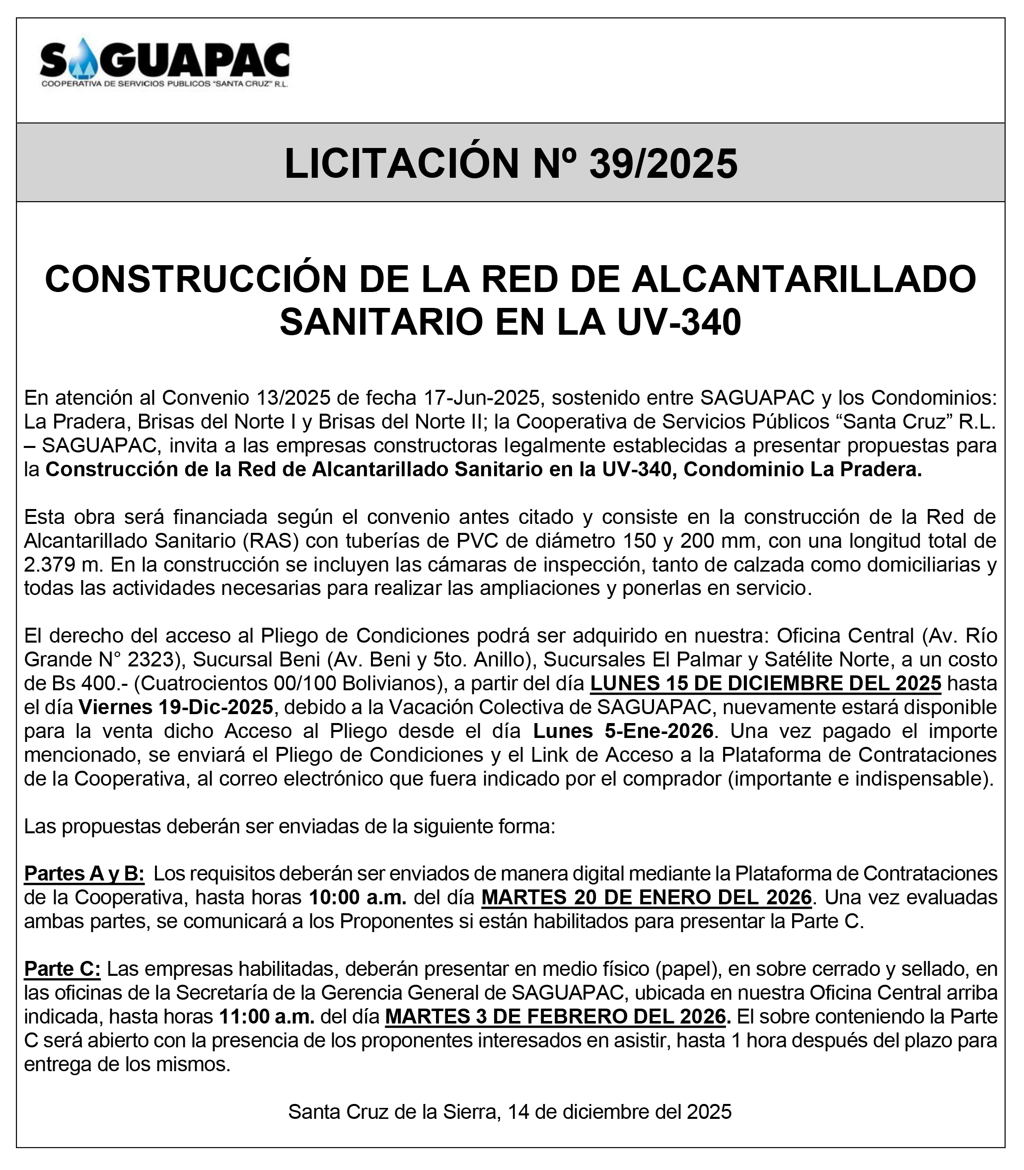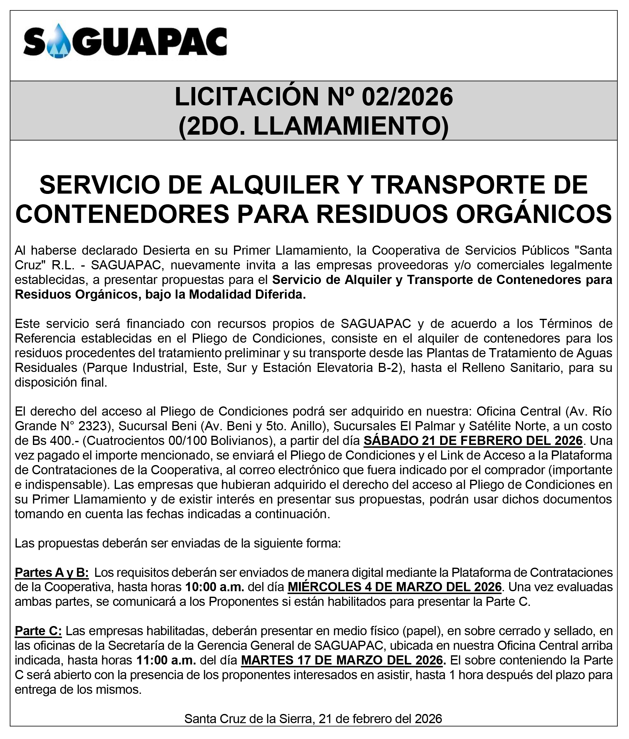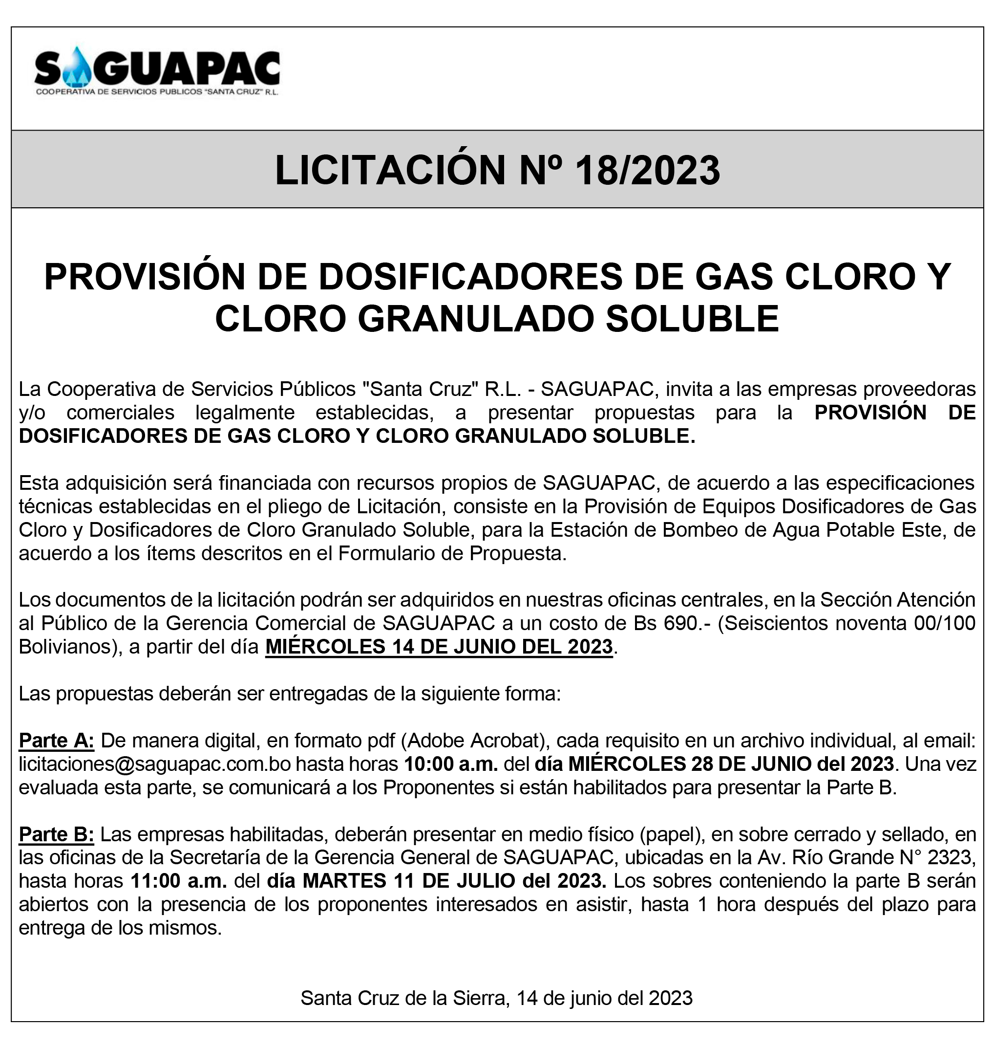Los procesos de Contratación no son la excepción, ya que se encuentran debidamente normados bajo un Reglamento de Contratación de Obras, Bienes y Servicios, que contempla la modalidad y la normativa de las Licitaciones Públicas, que es un proceso de participación abierto para todo público así como también los Actos de Apertura de Propuestas que se realizan en presencia de los proponentes y representantes de las Cámaras de Industria y Comercio (CAINCO) en casos de bienes o servicios y de la Cámara de la Construcción de Santa Cruz en casos de obras.