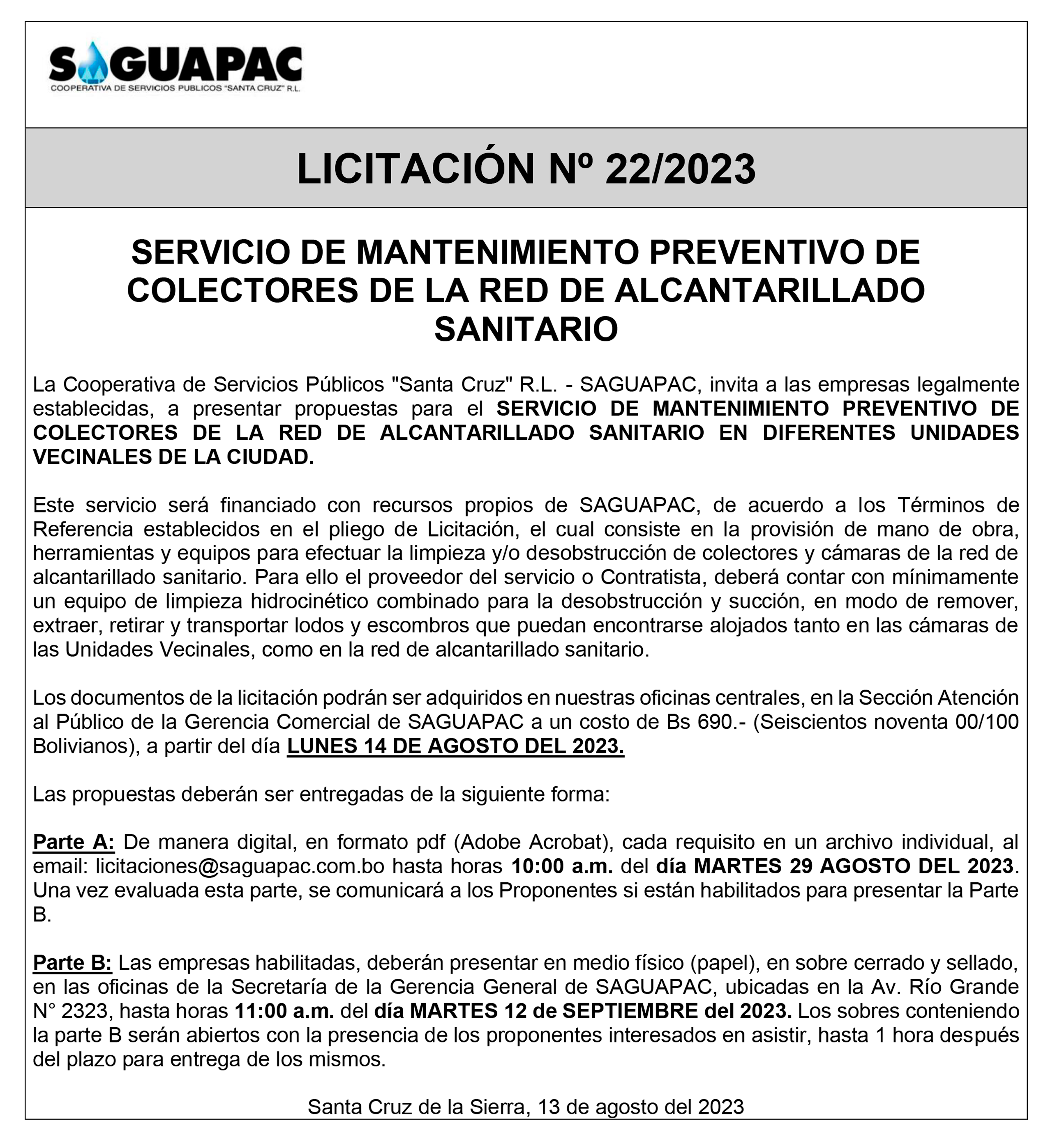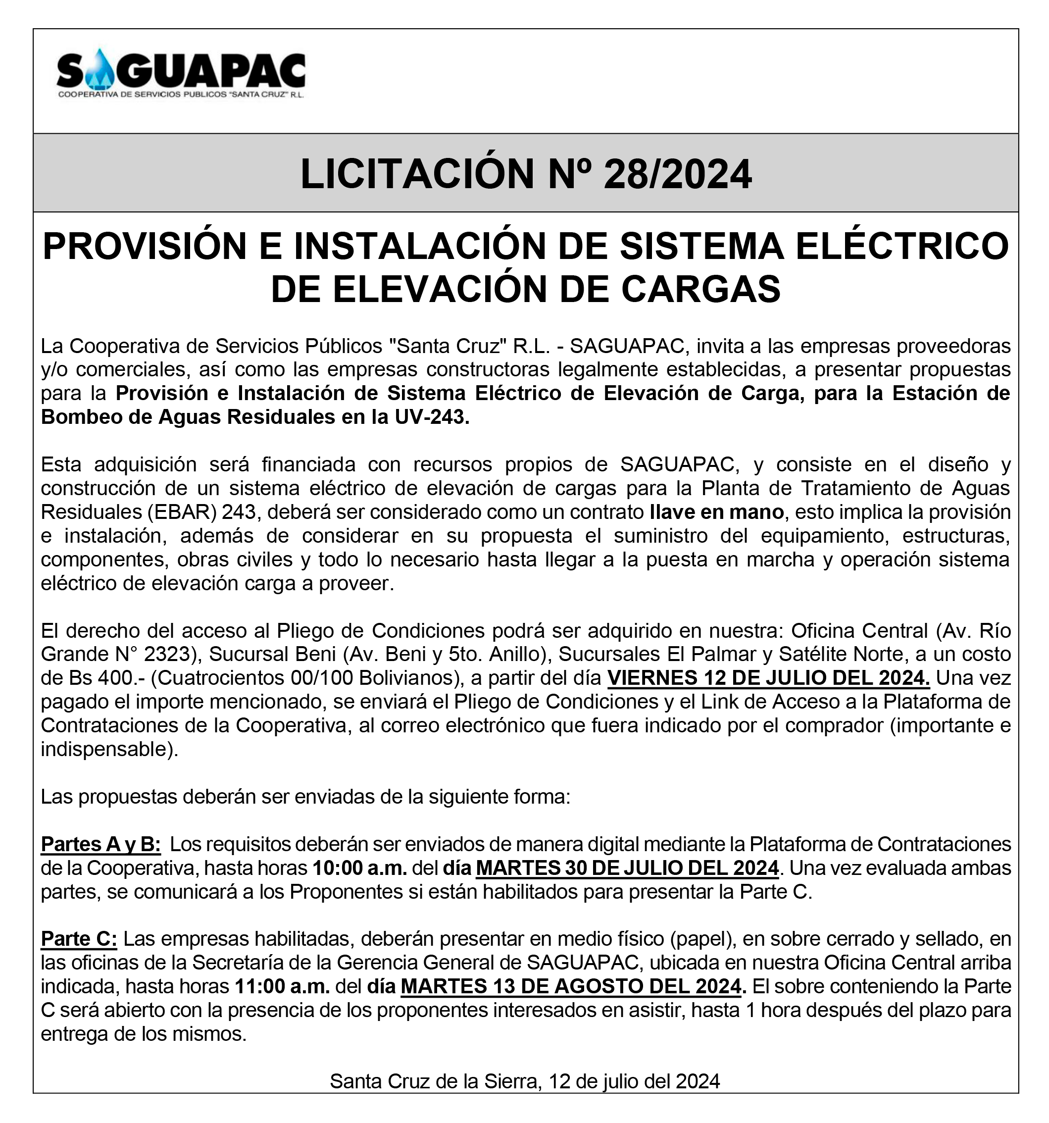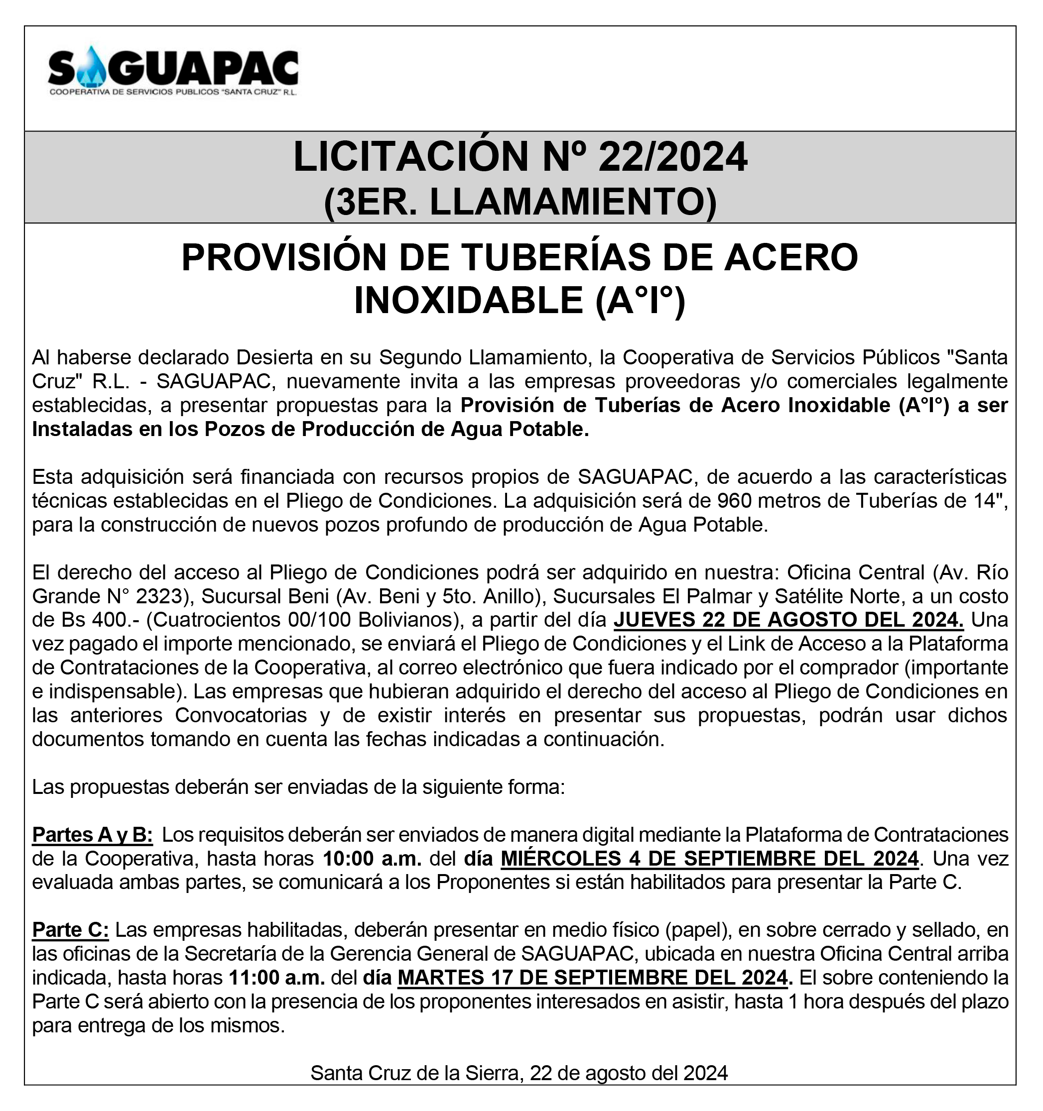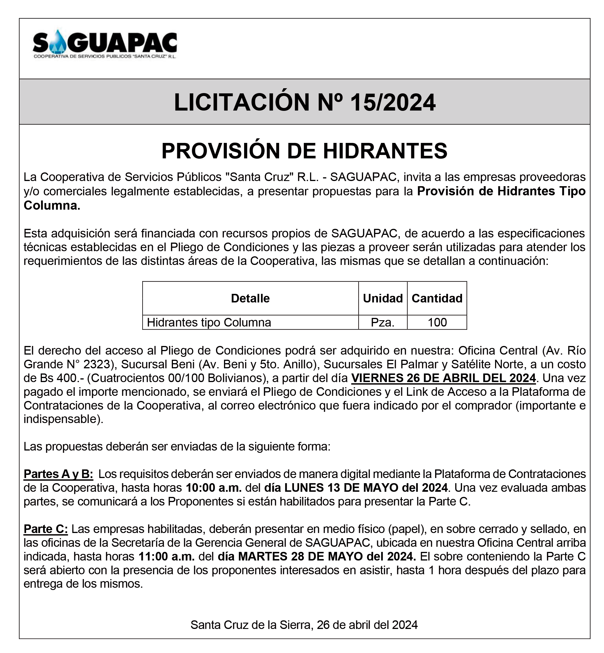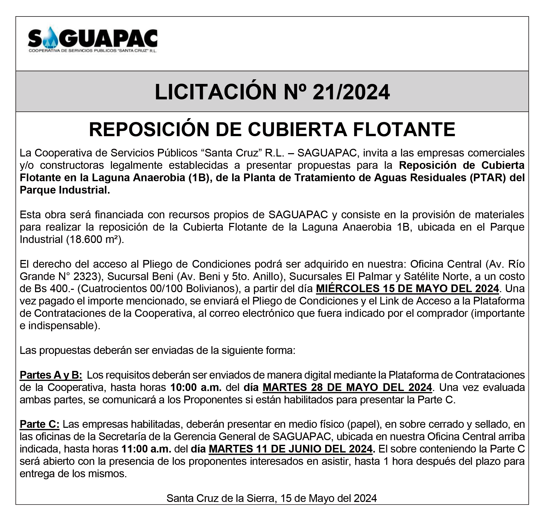 Los procesos de Contratación no son la excepción, ya que se encuentran debidamente normados bajo un Reglamento de Contratación de Obras, Bienes y Servicios, que contempla la modalidad y la normativa de las Licitaciones Públicas, que es un proceso de participación abierto para todo público así como también los Actos de Apertura de Propuestas que se realizan en presencia de los proponentes y representantes de las Cámaras de Industria y Comercio (CAINCO) en casos de bienes o servicios y de la Cámara de la Construcción de Santa Cruz en casos de obras.