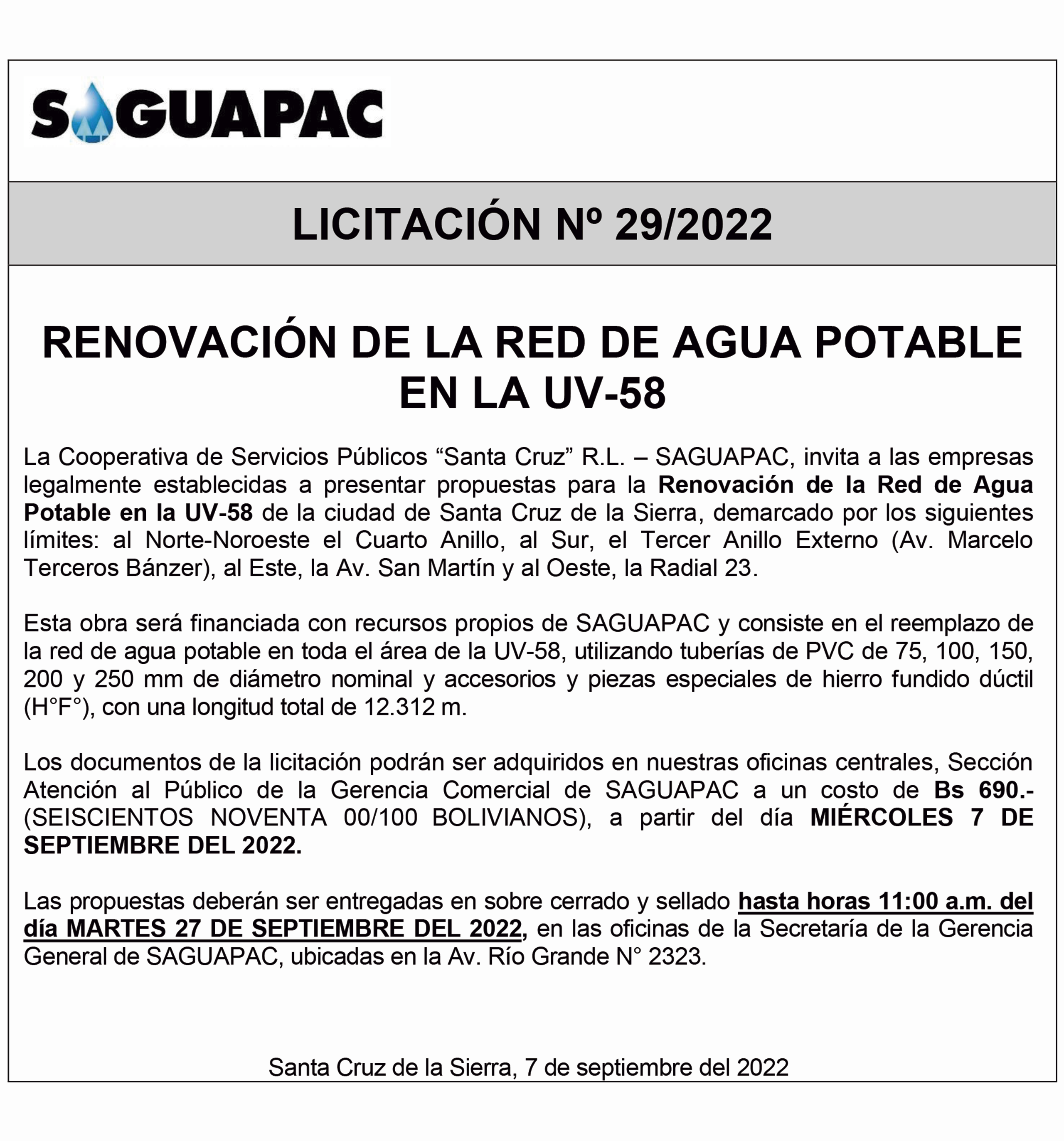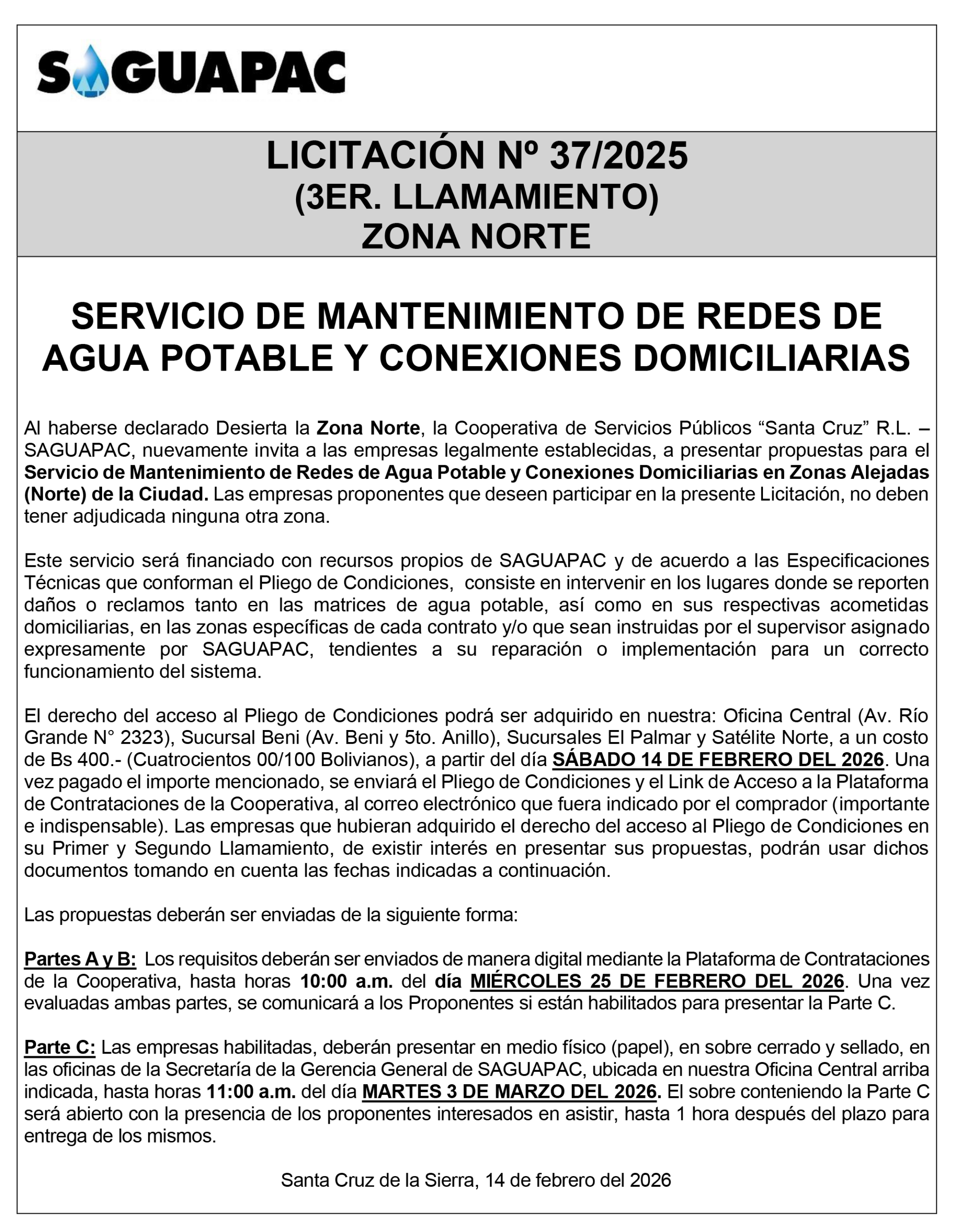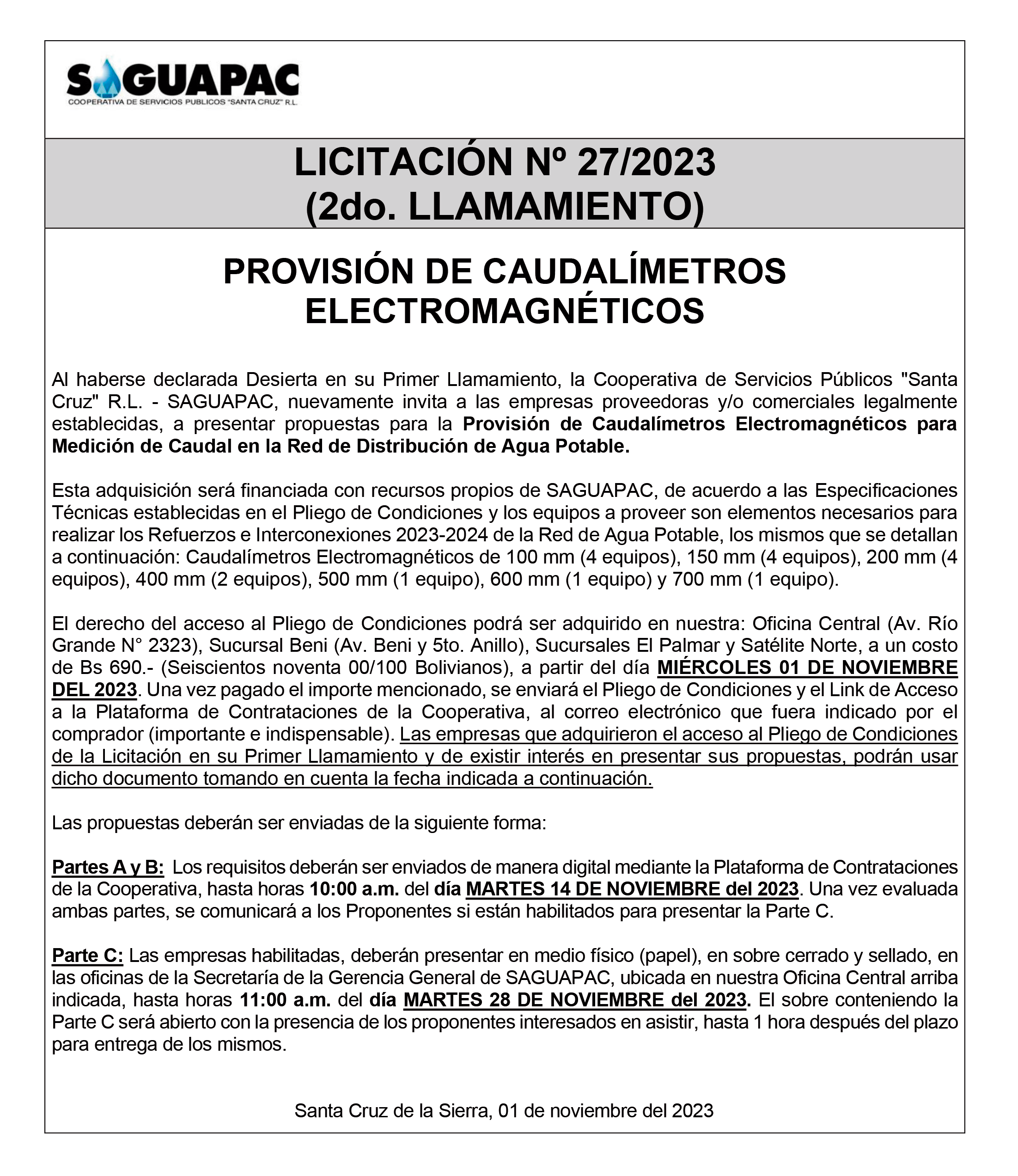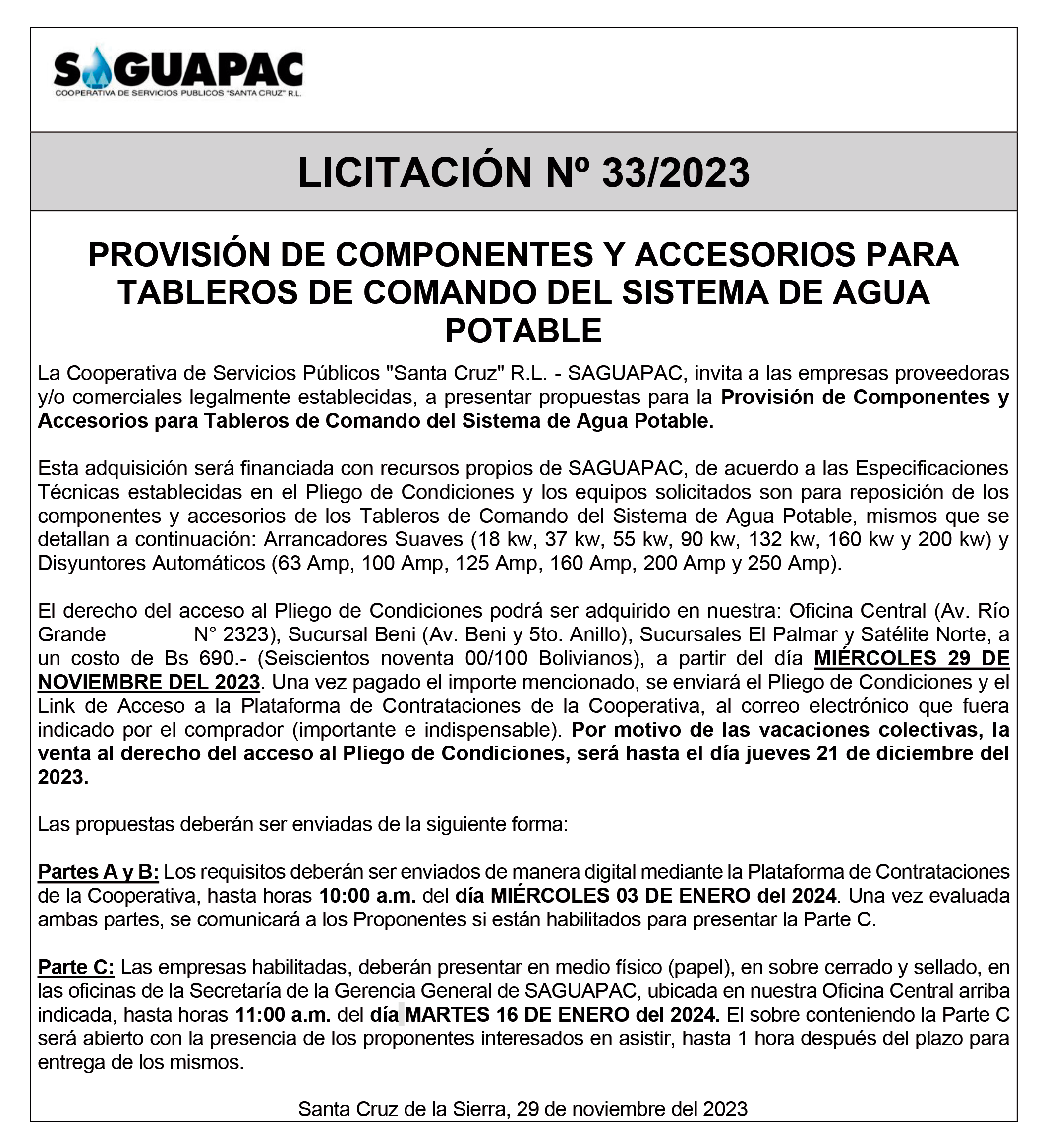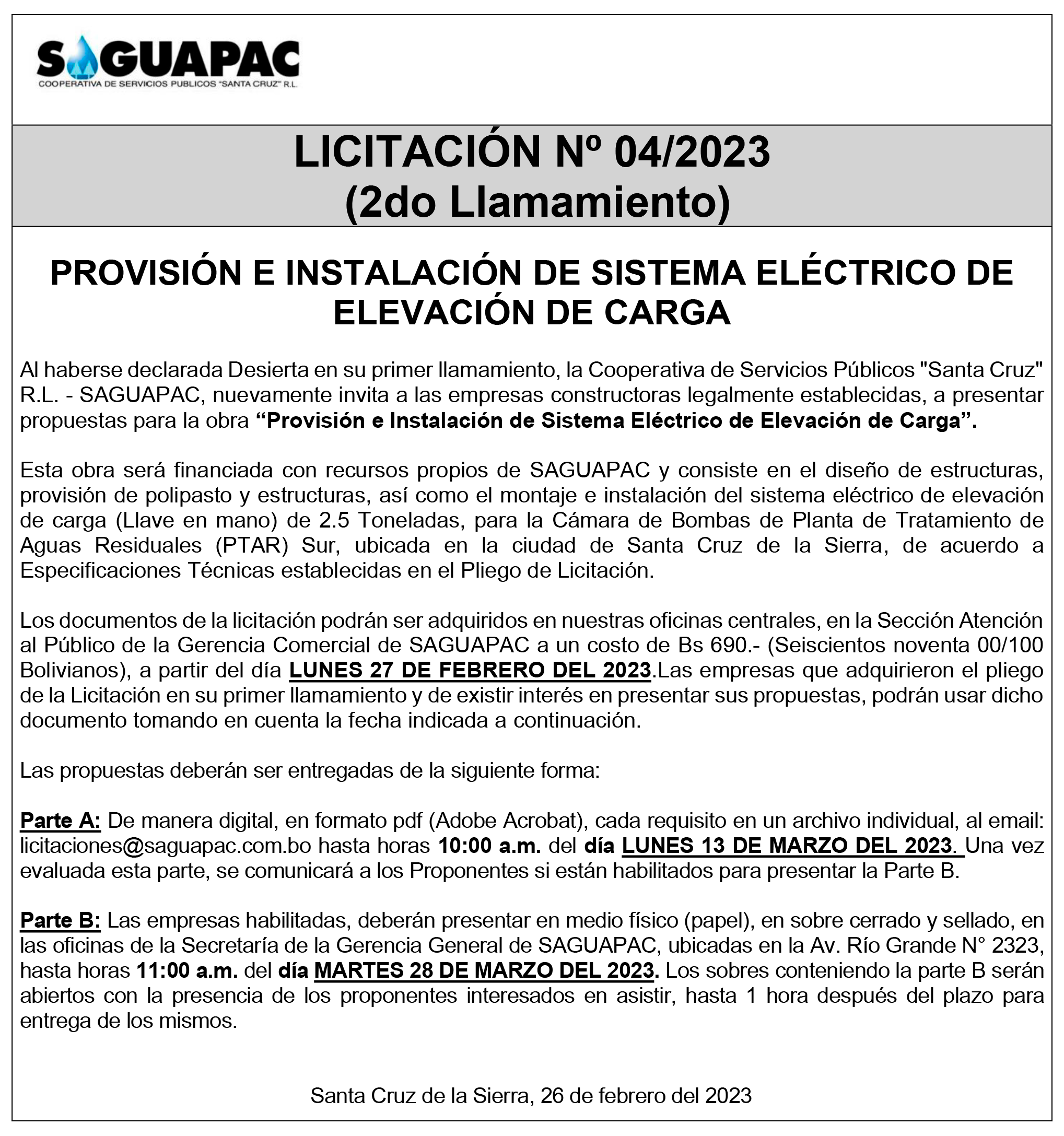 Los procesos de Contratación no son la excepción, ya que se encuentran debidamente normados bajo un Reglamento de Contratación de Obras, Bienes y Servicios, que contempla la modalidad y la normativa de las Licitaciones Públicas, que es un proceso de participación abierto para todo público así como también los Actos de Apertura de Propuestas que se realizan en presencia de los proponentes y representantes de las Cámaras de Industria y Comercio (CAINCO) en casos de bienes o servicios y de la Cámara de la Construcción de Santa Cruz en casos de obras.