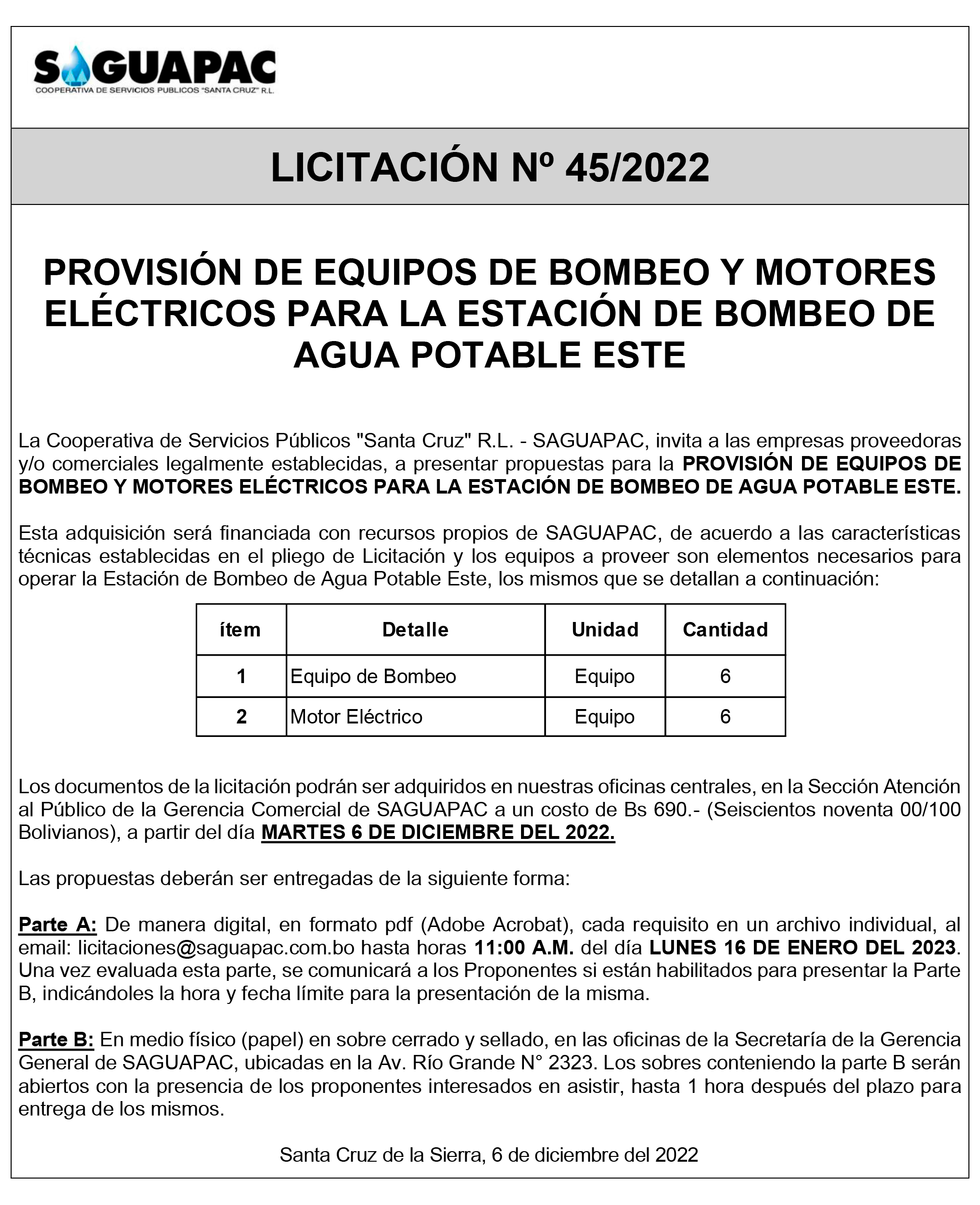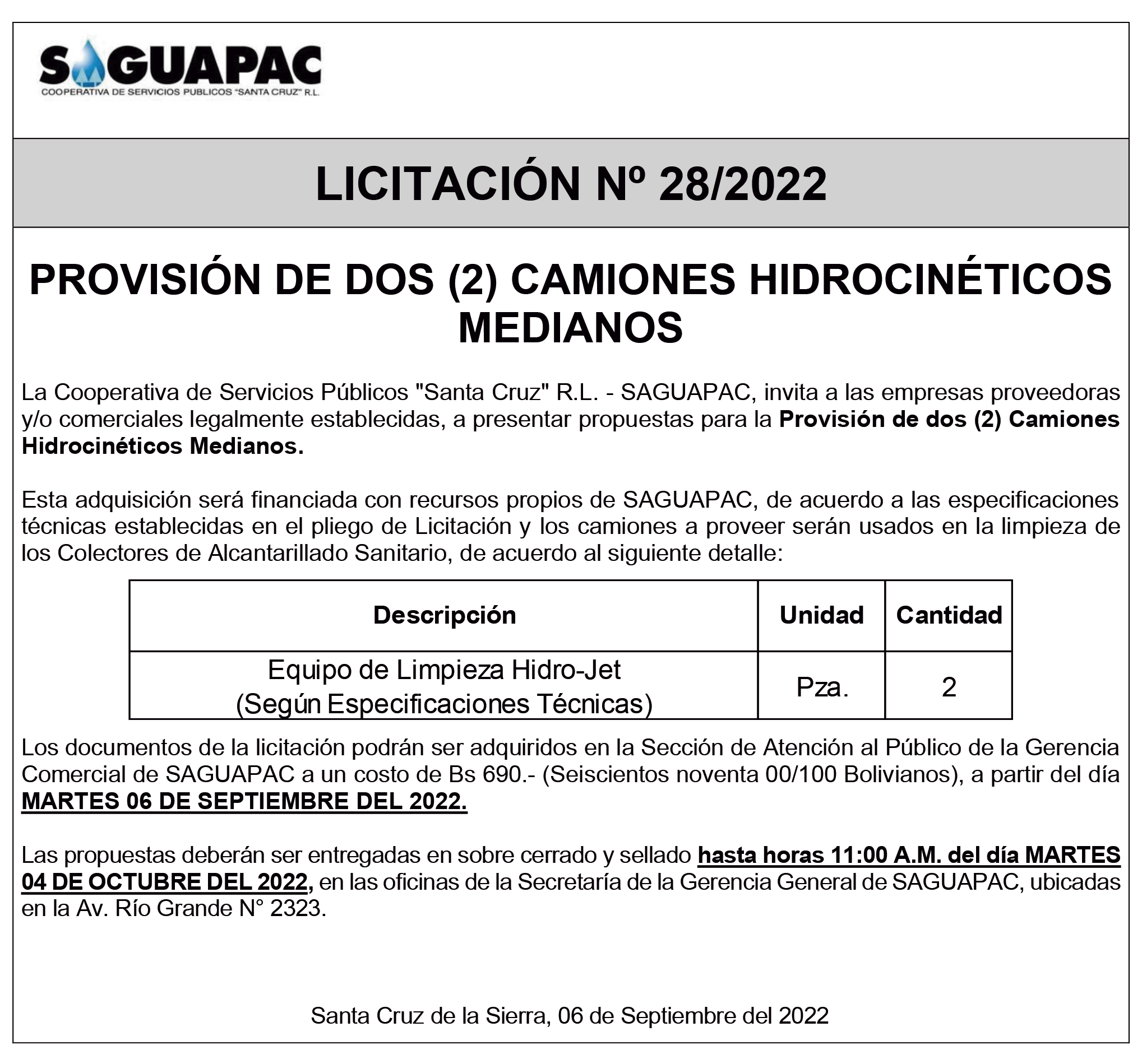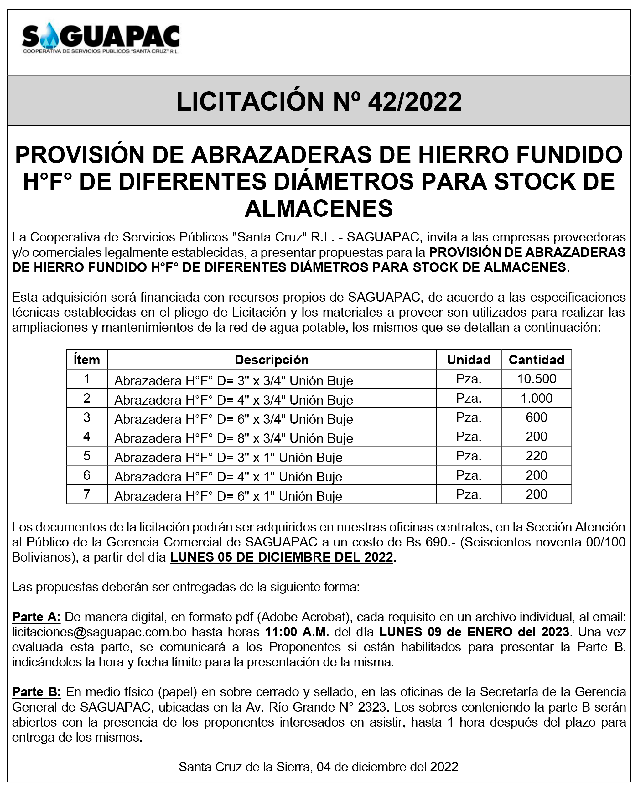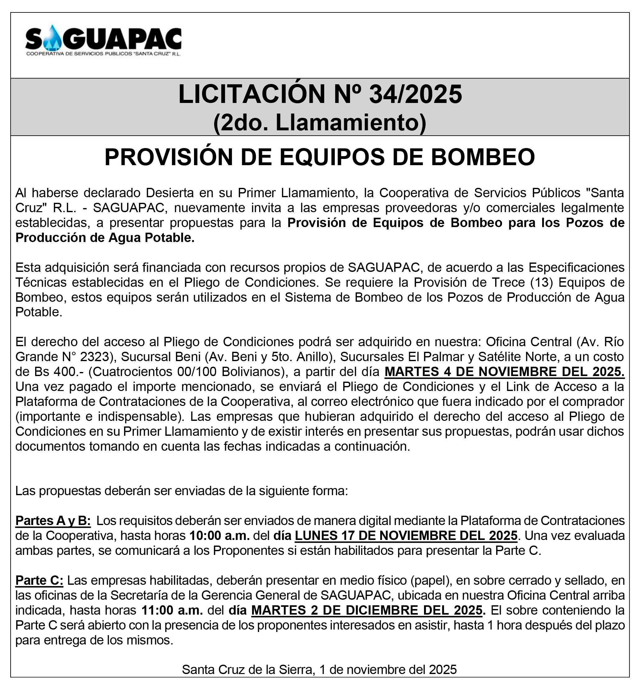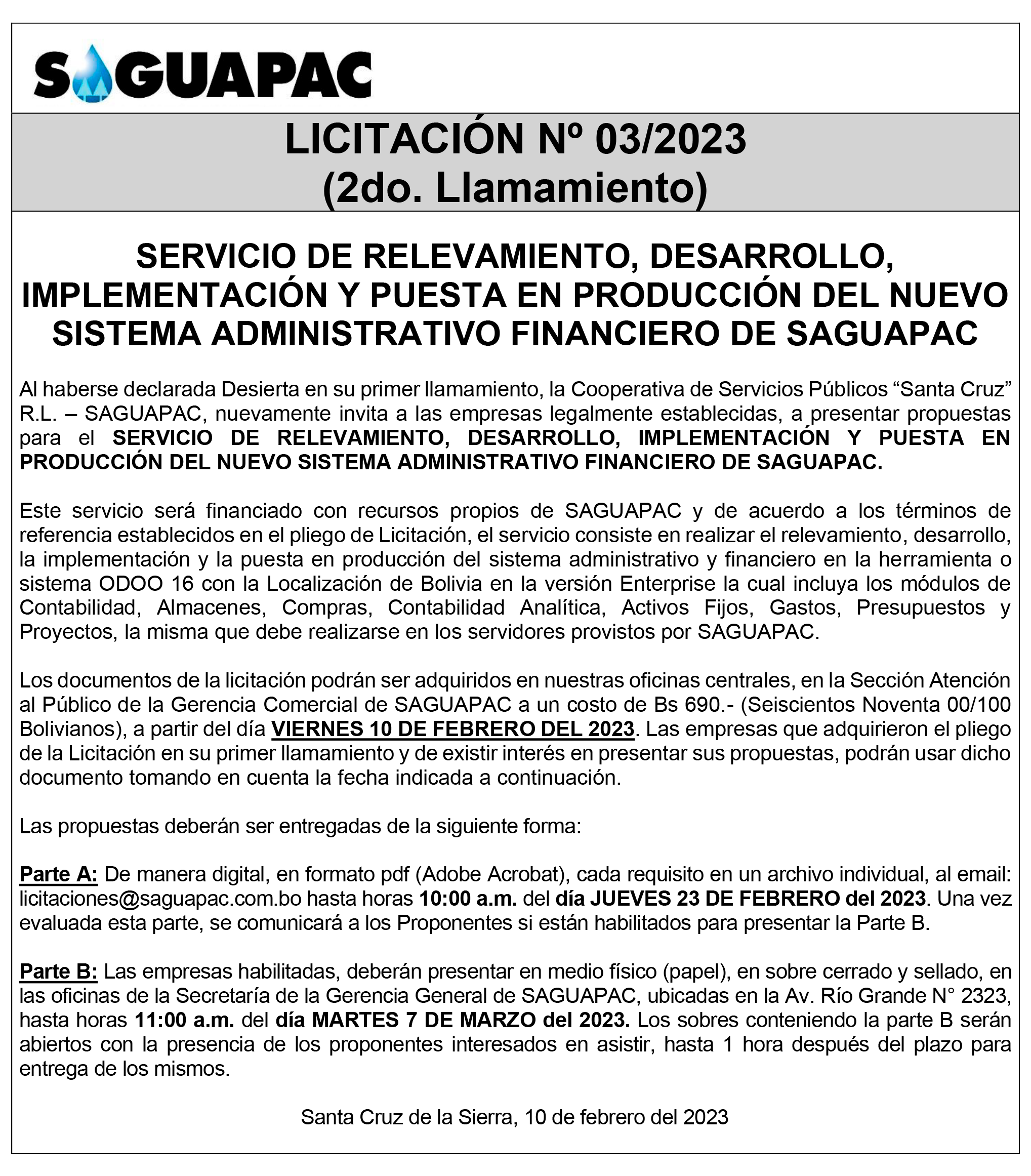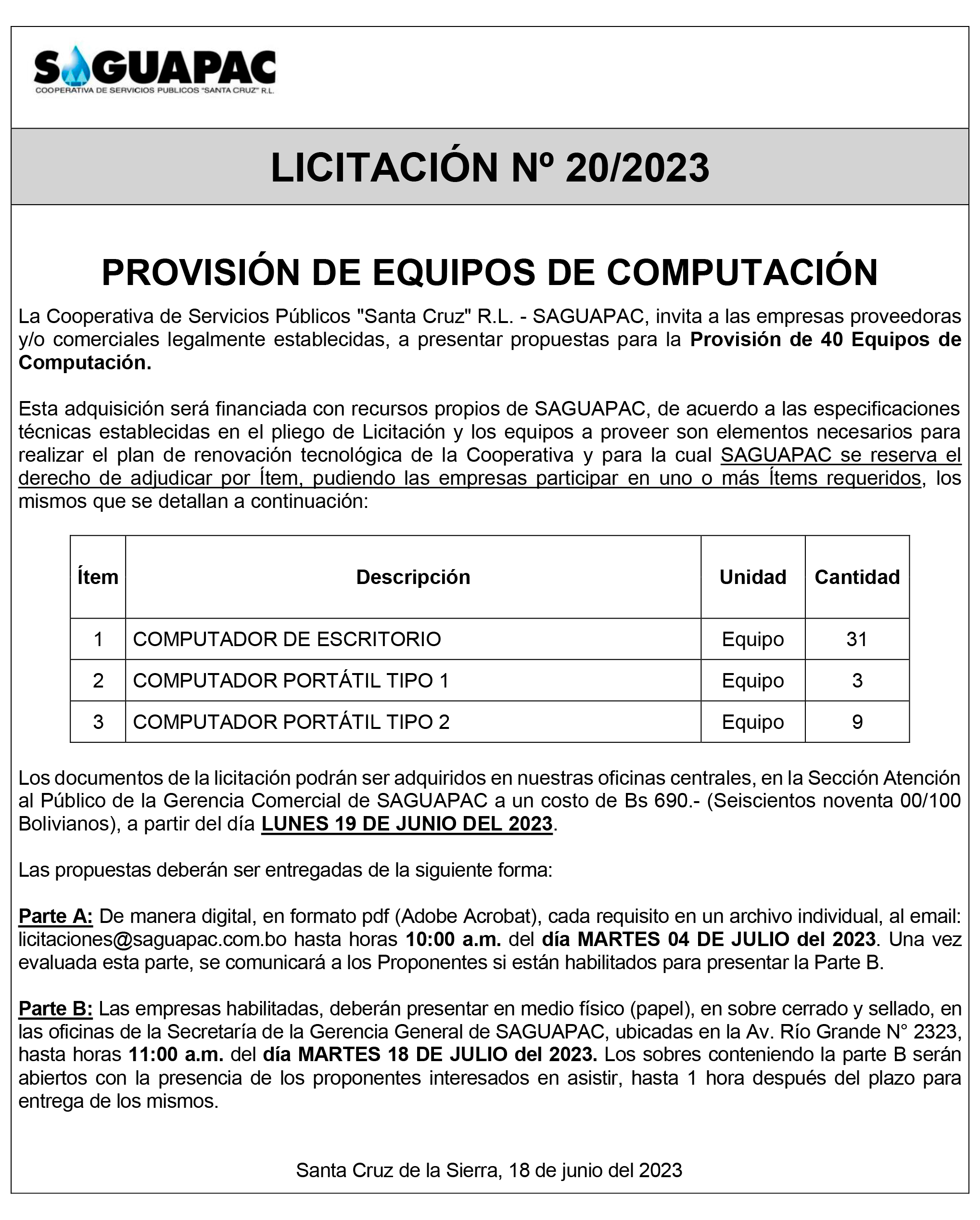 Los procesos de Contratación no son la excepción, ya que se encuentran debidamente normados bajo un Reglamento de Contratación de Obras, Bienes y Servicios, que contempla la modalidad y la normativa de las Licitaciones Públicas, que es un proceso de participación abierto para todo público así como también los Actos de Apertura de Propuestas que se realizan en presencia de los proponentes y representantes de las Cámaras de Industria y Comercio (CAINCO) en casos de bienes o servicios y de la Cámara de la Construcción de Santa Cruz en casos de obras.
