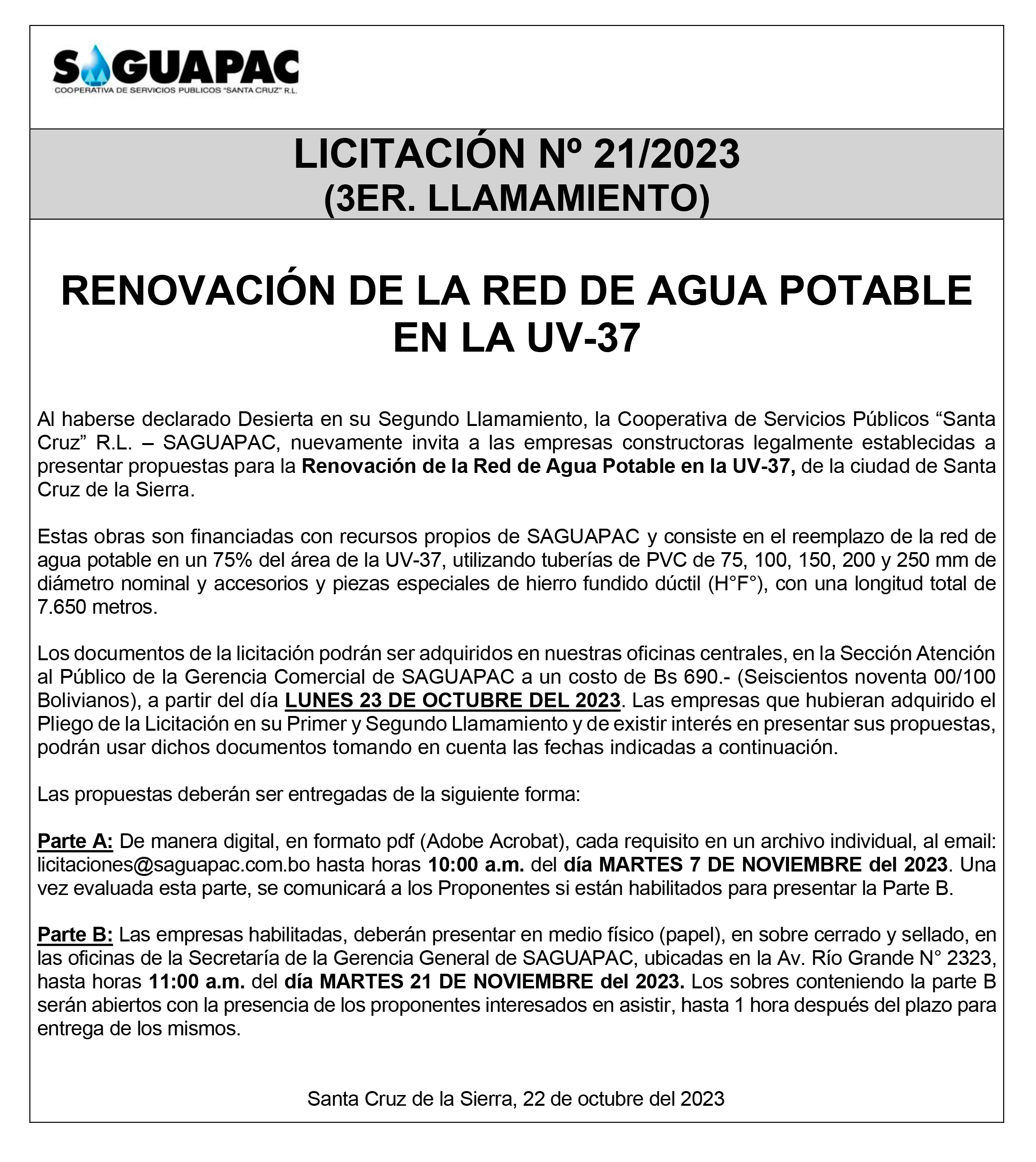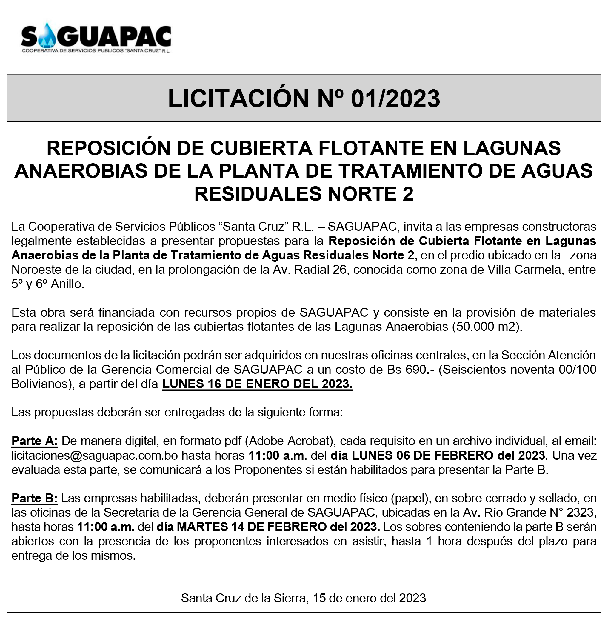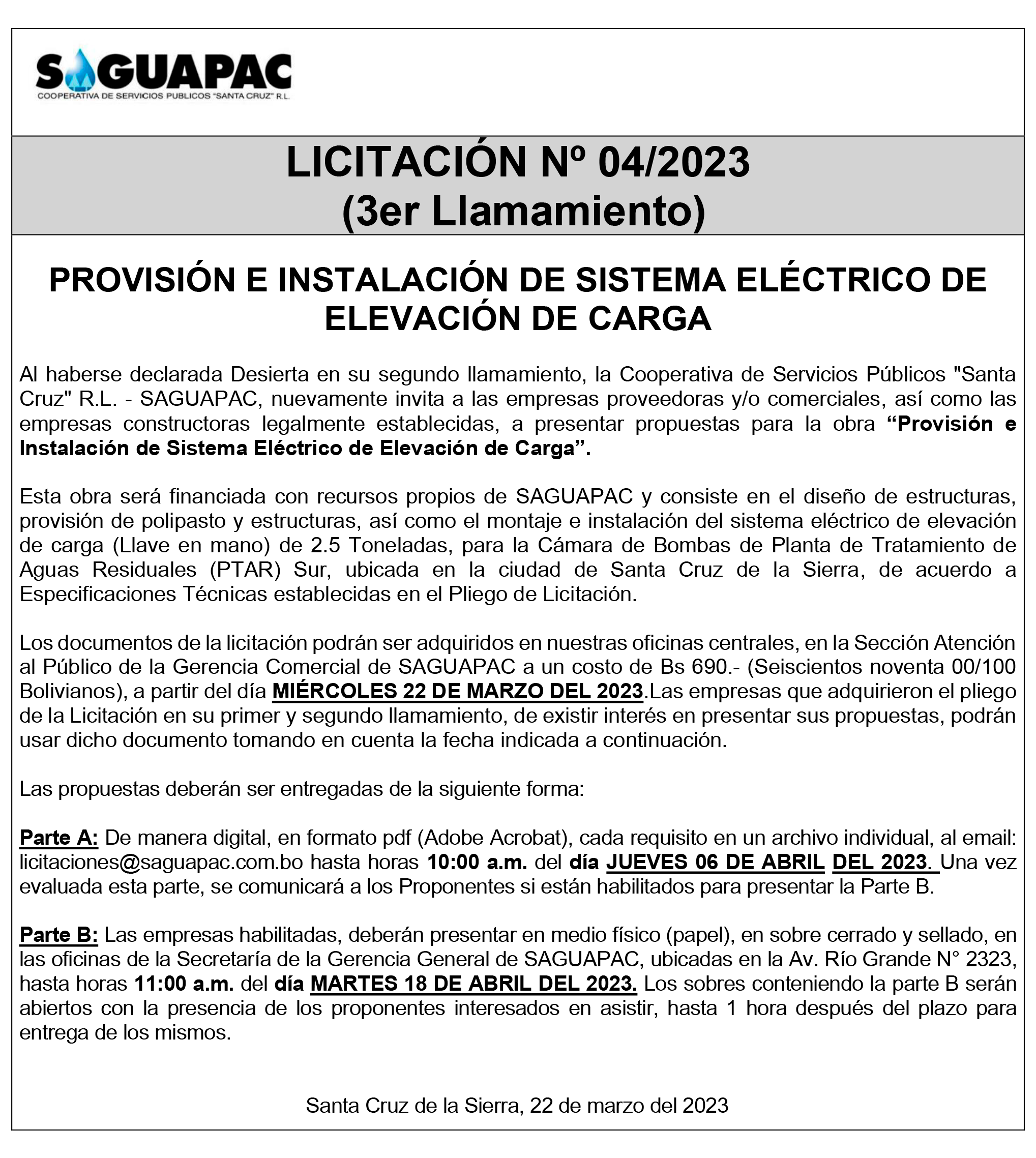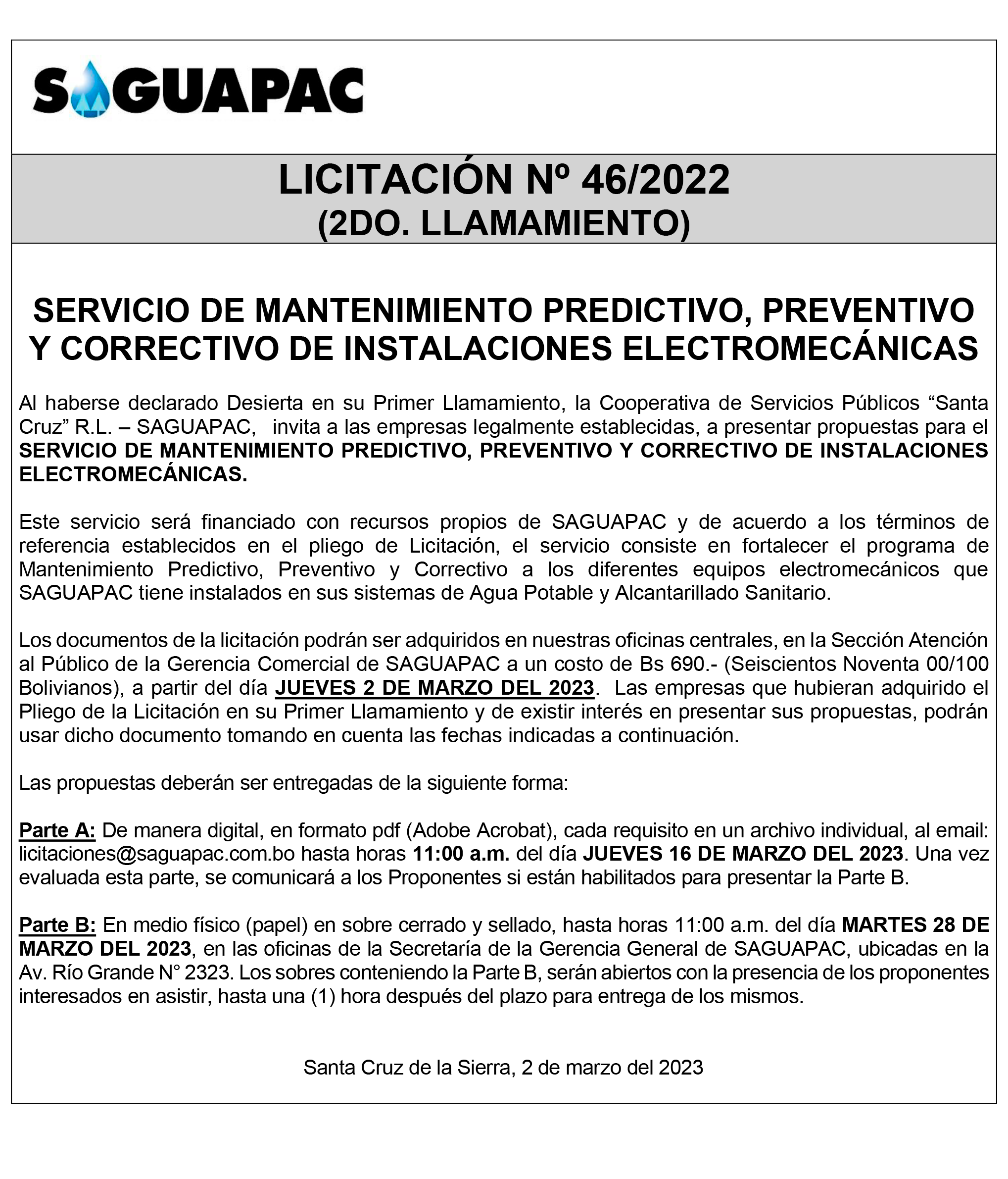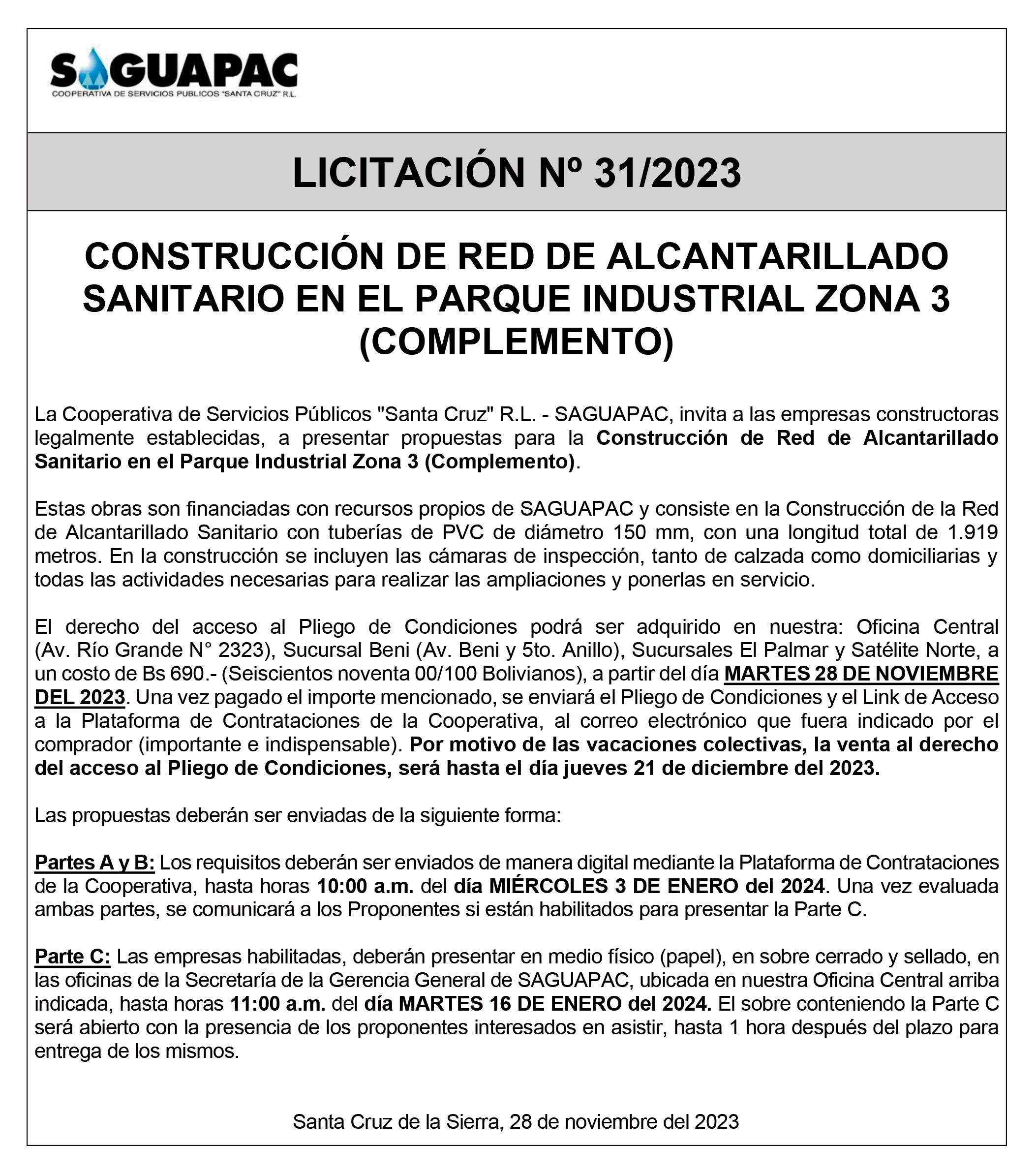Los procesos de Contratación no son la excepción, ya que se encuentran debidamente normados bajo un Reglamento de Contratación de Obras, Bienes y Servicios, que contempla la modalidad y la normativa de las Licitaciones Públicas, que es un proceso de participación abierto para todo público así como también los Actos de Apertura de Propuestas que se realizan en presencia de los proponentes y representantes de las Cámaras de Industria y Comercio (CAINCO) en casos de bienes o servicios y de la Cámara de la Construcción de Santa Cruz en casos de obras.