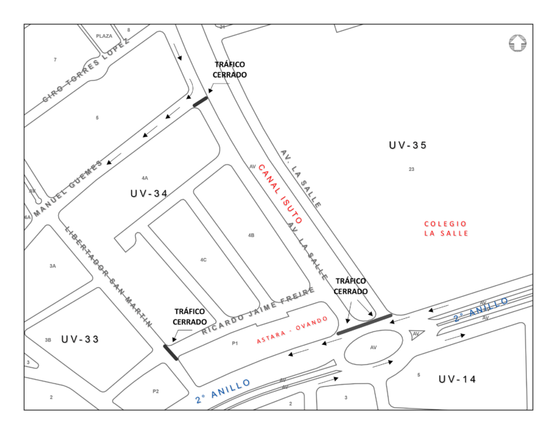 Con el objetivo de realizar la rehabilitación de emisario en la Red de Alcantarillado Sanitario, comunicamos que se cerrará en una vía el tráfico vehicular en la Av. La Salle y Canal Isuto, 2do Anillo, UV. 34 y 35, Manzana P1; tal como se muestra en el plano. El trabajo se realizará desde del día martes 16/12/2025 y tendrá una duración de tres (3) días aproximadamente.